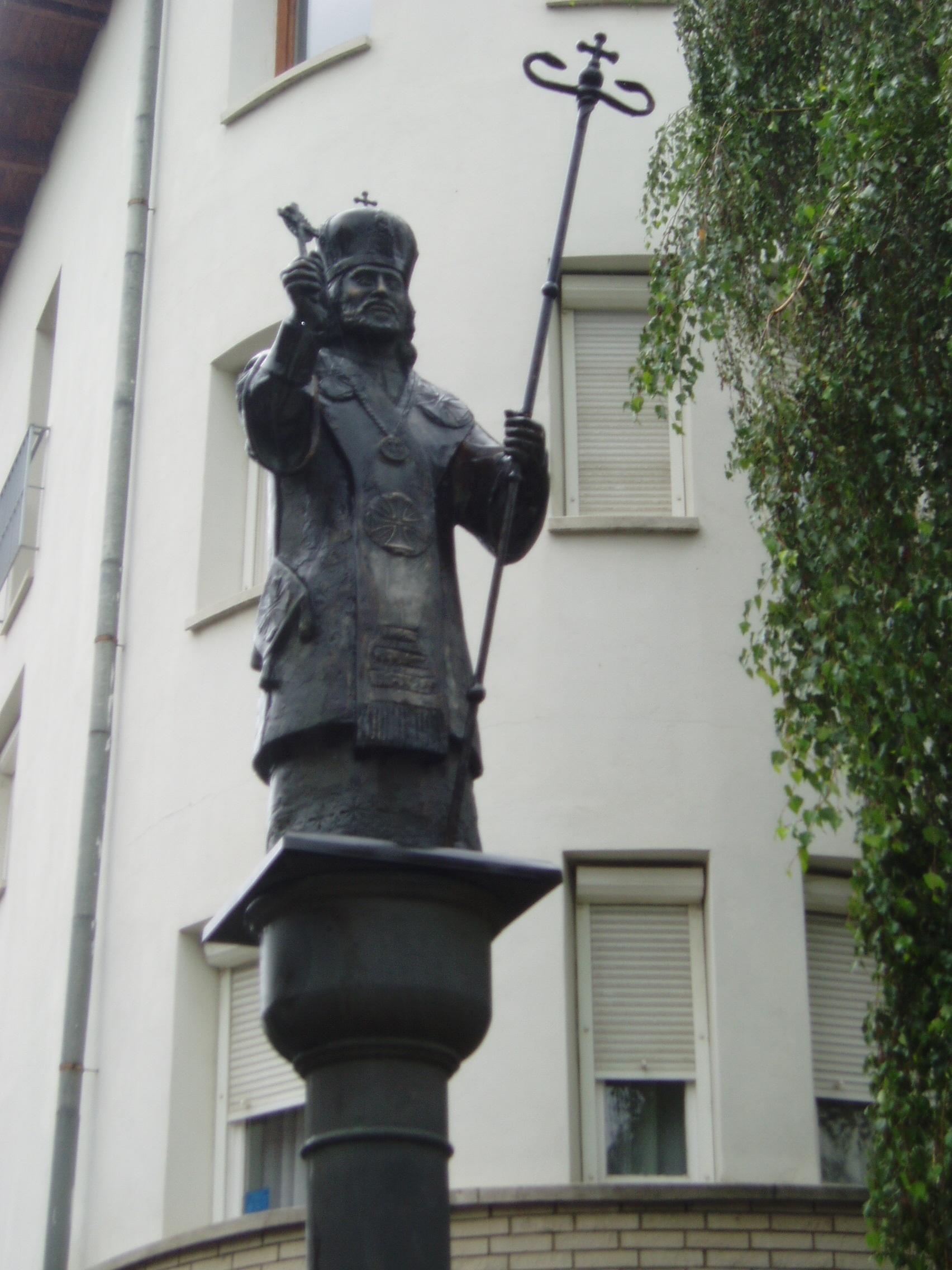 Nyilvános 1074 | 2175 | Nyíregyháza, Szent Miklós tér: Szent Miklós szobra | A város központjában levő, de csöndes és hangulatos kis téren 1996-ban állították fel a kiváló nyíregyházi szobrászművész, Tóth Sándor Szent Miklóst megjelenítő szobrát. A fénykép 2010 augusztus elején készült |