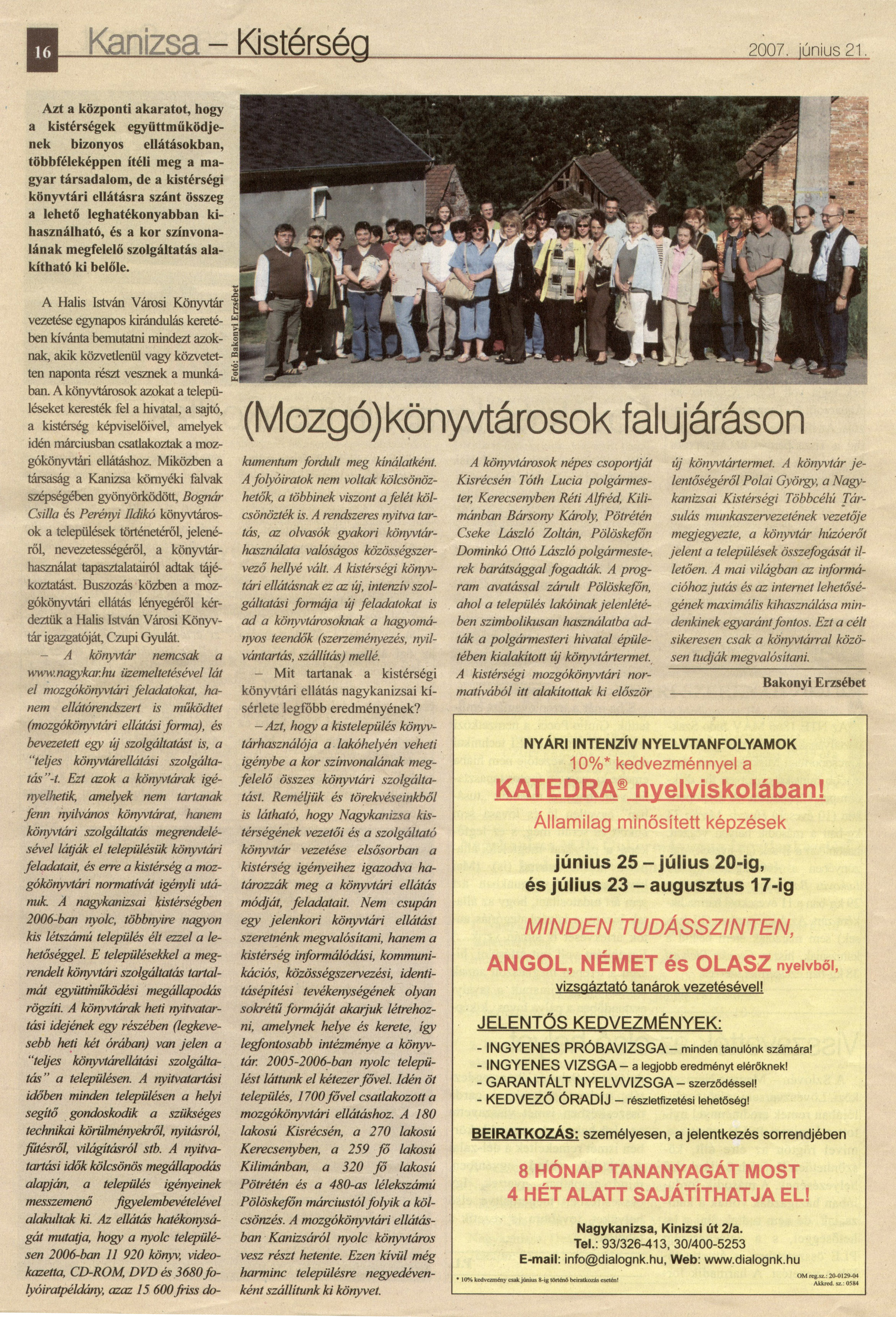 Nyilvános 2174 | 4832 | Kanizsa 2007 06 21 025sz 16old | (Mozgó)könyvtárosok falujáráson Kanizsa - Kistérség 2007. június 21. Azt a központi akaratot, hogy a kistérségek együttműködjenek bizonyos ellátásokban, többféleképpen ítéli meg a magyar társadalom, de a kistérségi könyvtári ellátásra szánt összeg a lehető leghatékonyabban kihasználható, és a kor színvonalának megfelelő szolgáltatás alakítható ki belőle. A Halis István Városi Könyvtár vezetése egynapos kirándulás keretében kívánta bemutatni mindezt azoknak, akik közvetlenül vagy közvetetten naponta részt vesznek a munkában. A könyvtárosok azokat a településeket keresték fel a hivatal, a sajtó, a kistérség képviselőivel, amelyek idén márciusban csatlakoztak a mozgókönyvtári ellátáshoz. Miközben a társaság a Kanizsa környéki falvak szépségében gyönyörködött, Bognár Csilla és Perényi Ildikó könyvtárosok a települések történetéről, jelenéről, nevezetességéről, a könyvtárhasználat tapasztalatairól adtak tájékoztatást. Buszozás közben a mozgókönyvtári ellátás lényegéről kérdeztük a Halis István Városi Könyvtár igazgatóját, Czupi Gyulát. – A könyvtár nemcsak a www.nagykar.hu üzemeltetésével lát el mozgókönyvtári feladatokat, hanem ellátórendszert is működtet (mozgókönyvtári ellátási forma), és bevezetett egy új szolgáltatást is, a „teljes könyvtárellátási szolgáltatás”-t. Ezt azok a könyvtárak igényelhetik, amelyek nem tartanak fenn nyilvános könyvtárat, hanem könyvtári szolgáltatás megrendelésével látják el településük könyvtári feladatait, és erre a kistérség a mozgókönyvtári normatívát igényli utánuk. A nagykanizsai kistérségben 2006-ban nyolc, többnyire nagyon kis létszámú település élt ezzel a lehetőséggel. E településekkel a megrendelt könyvtári szolgáltatás tartalmát együttműködési megállapodás rögzíti. A könyvtárak heti nyitvatartási idejének egy részében (legkevesebb heti két órában) van jelen a „teljes könyvtárellátási szolgáltatás” a településen. A nyitvatartási időben minden településen a helyi segítő gondoskodik a szükséges technikai körülményekről, nyitásról, fűtésről, világításról stb. A nyitvatartási idők kölcsönös megállapodás alapján, a település igényeinek messzemenő figyelembevételével alakultak ki. Az ellátás hatékonyságát mutatja, hogy a nyolc településen 2006-ban 11 920 könyv, videokazetta, CD-ROM, DVD és 3680 folyóiratpéldány, azaz 15 600 friss dokumentum fordult meg kínálatként. A folyóiratok nem voltak kölcsönözhetők, a többinek viszont a felét kölcsönözték is. A rendszeres nyitva tartás, az olvasók gyakori könyvtárhasználata valóságos közösségszervező hellyé vált. A kistérségi könyvtári ellátásnak ez az új, intenzív szolgáltatási formája új feladatokat is ad a könyvtárosoknak a hagyományos teendők (szerzeményezés, nyilvántartás, szállítás) mellé. – Mit tartanak a kistérségi könyvtári ellátás nagykanizsai kísérlete legfőbb eredményének? – Azt, hogy a kistelepülés könyvtárhasználója a lakóhelyén veheti igénybe a kor színvonalának megfelelő összes könyvtári szolgáltatást. Reméljük és törekvéseinkből is látható, hogy Nagykanizsa kistérségének vezetői és a szolgáltató könyvtár vezetése elsősorban a kistérség igényeihez igazodva határozzák meg a könyvtári ellátás módját, feladatait. Nem csupán egy jelenkori könyvtári ellátást szeretnénk megvalósítani, hanem a kistérség informálódási, kommunikációs, közösségszervezési, identitásépítési tevékenységének olyan sokrétű formáját akarjuk létrehozni, amelynek helye és kerete, így legfontosabb intézménye a könyvtár. 2005-2006-ban nyolc települést láttunk el kétezer fővel. Idén öt település, 1700 fővel csatlakozott a mozgókönyvtári ellátáshoz. A 180 lakosú Kisrécsén, a 270 lakosú Kerecsenyben, a 259 fő lakosú Kilimánban, a 320 fő lakosú Pötrétén és a 480-as lélekszámú Pölöskefőn márciustól folyik a kölcsönzés. A mozgókönyvtári ellátásban Kanizsáról nyolc könyvtáros vesz részt hetente. Ezen kívül még harminc településre negyedévenként szállítunk ki könyvet. A könyvtárosok népes csoportját Kisrécsén Tóth Lucia polgármester, Kerecsenyben Réti Alfréd, Kilimánban Bársony Károly, Pötrétén Cseke László Zoltán, Pölöskefőn Dominkó Ottó László polgármesterek barátsággal fogadták. A program avatással zárult Pölöskefőn, ahol a település lakóinak jelenlétében szimbolikusan használatba adták a polgármesteri hivatal épületében kialakított új könyvtártermet. A kistérségi mozgókönyvtári normatívából itt alakítottak ki először új könyvtártermet. A könyvtár jelentőségéről Polai György, a Nagykanizsai Kistérségi Többcélú Társulás munkaszervezetének vezetője megjegyezte, a könyvtár húzóerőt jelent a települések összefogását illetően. A mai világban az információhoz jutás és az internet lehetőségének maximális kihasználása mindenkinek egyaránt fontos. Ezt a célt sikeresen csak a könyvtárral közösen tudják megvalósítani. Bakonyi Erzsébet |