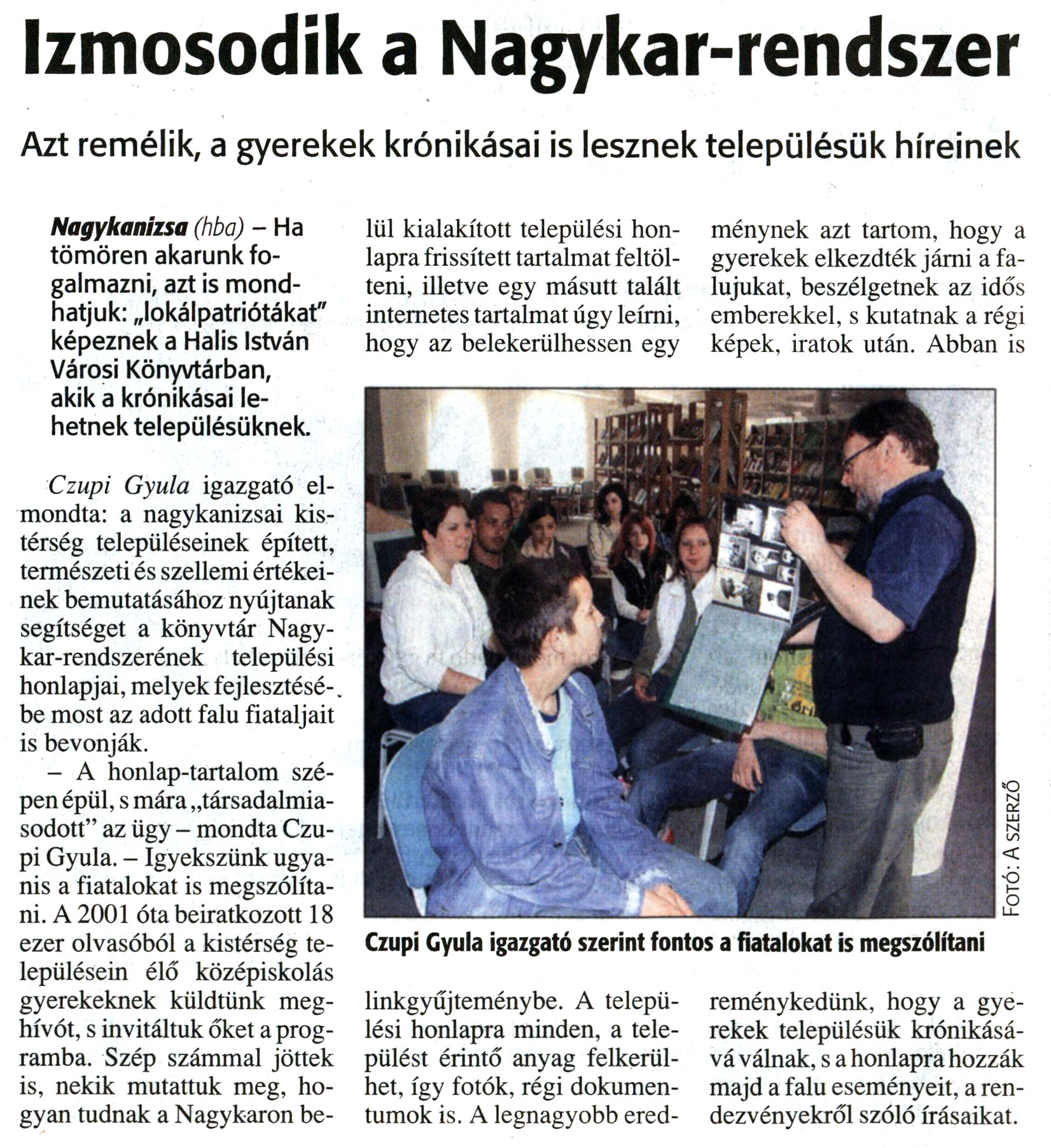 Nyilvános 14303 | 28537 | Zalai Hírlap 2008. június 9. 133. szám 12. oldal - Izmosodik a Nagykar-rendszer | A cikk szövege: Izmosodik a Nagykar-rendszer Azt remélik, a gyerekek krónikásai is lesznek településük híreinek Nagykanizsa (hba) - Ha tömören akarunk fogalmazni, azt is mondhatjuk: „lokálpatriótákat" képeznek a Halis István Városi Könyvtárban, akik a krónikásai lehetnek településüknek. Czupi Gyula igazgató elmondta: a nagykanizsai kistérség településeinek épített, természeti és szellemi értékeinek bemutatásához nyújtanak segítséget a könyvtár Nagykar-rendszerének települési honlapjai, melyek fejlesztésébe most az adott falu fiataljait is bevonják. - A honlap-tartalom szépen épül, s mára „társadalmiasodott" az ügy - mondta Czupi Gyula. - Igyekszünk ugyanis a fiatalokat is megszólítani. A 2001 óta beiratkozott 18 ezer olvasóból a kistérség településein élő középiskolás gyerekeknek küldtünk meghívót, s invitáltuk őket a programba. Szép számmal jöttek is, nekik mutattuk meg, hogyan tudnak a Nagykaron belül kialakított települési honlapra frissített tartalmat feltölteni, illetve egy másutt talált internetes tartalmat úgy leírni, hogy az belekerülhessen egy linkgyűjteménybe. A települési honlapra minden, a települést érintő anyag felkerülhet, így fotók, régi dokumentumok is. A legnagyobb eredménynek azt tartom, hogy a gyerekek elkezdték járni a falujukat, beszélgetnek az idős emberekkel, s kutatnak a régi képek, iratok után. Abban is reménykedünk, hogy a gyerekek településük krónikásává válnak, s a honlapra hozzák majd a falu eseményeit, a rendezvényekről szóló írásaikat. Képaláírás: Czupi Gyula igazgató szerint fontos a fiatalokat is megszólítani |