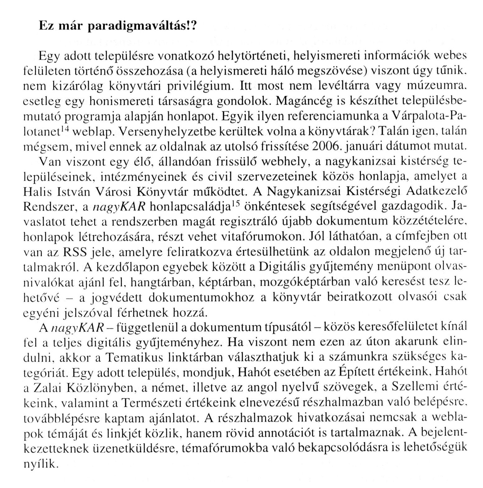 Nyilvános 1258 | 2652 | Könyv, Könyvtár, Könyvtáros 2008. október 24. oldal - Kégli Ferenc: Egy helyismeret-kutató barangolása Wégtelen Web Wilágban - részlet - 024. oldal | Cím: Könyv, Könyvtár, Könyvtáros Egyéb címadat; közreműködő: / Az Informatikai és Könyvtári Szövetség, a Magyar Könyvtárosok Egyesülete, a Nemzeti Kulturális Örökség Minisztériuma, az Országos Széchényi Könyvtár ; szerk. biz. elnök: Biczák Péter Budapest : Országos Széchényi Könyvtár Évek: 1951- Periodicitás: havonként ISSN: ISSN 1216-6804 A cikk szövege: Ez már paradigmaváltás!? Egy adott településre vonatkozó helytörténeti, helyismereti információk webes felületen történő összehozása (a helyismereti háló megszövése) viszont úgy tűnik, nem kizárólag könyvtári privilégium. Itt most nem levéltárra vagy múzeumra, esetleg egy honismereti társaságra gondolok. Magáncég is készíthet településbe-mutató programja alapján honlapot. Egyik ilyen referenciamunka a Várpalota-Pa-lotanet14 weblap. Versenyhelyzetbe kerültek volna a könyvtárak? Talán igen. talán mégsem, mivel ennek az oldalnak az utolsó frissítése 2006. januári dátumot mutat. Van viszont egy élő, állandóan frissülő webhely, a nagykanizsai kistérség településeinek, intézményeinek és civil szervezeteinek közös honlapja, amelyet a Halis István Városi Könyvtár működtet. A Nagykanizsai Kistérségi Adatkezelő Rendszer, a nagyKAR honlapcsaládja15 önkéntesek segítségével gazdagodik. Javaslatot tehet a rendszerben magát regisztráló újabb dokumentum közzétételére, honlapok létrehozására, részt vehet vitafórumokon. Jól láthatóan, a címfejben ott van az RSS jele, amelyre feliratkozva értesülhetünk az oldalon megjelenő új tartalmakról. A kezdőlapon egyebek között a Digitális gyűjtemény menüpont olvasnivalókat ajánl fel, hangtárban, képtárban, mozgóképtárban való keresést tesz lehetővé - a jogvédett dokumentumokhoz a könyvtár beiratkozott olvasói csak egyéni jelszóval férhetnek hozzá. A nagyKAR - függetlenül a dokumentum típusától - közös keresőfelületet kínál fel a teljes digitális gyűjteményhez. Ha viszont nem ezen az úton akarunk elindulni, akkor a Tematikus linktárban választhatjuk ki a számunkra szükséges kategóriát. Egy adott település, mondjuk. Hahót esetében az Épített értékeink, Hahót a Zalai Közlönyben, a német, illetve az angol nyelvű szövegek, a Szellemi értékeink, valamint a Természeti értékeink elnevezésű részhalmazban való belépésre, továbblépésre kaptam ajánlatot. A részhalmazok hivatkozásai nemcsak a weblapok témáját és linkjét közlik, hanem rövid annotációt is tartalmaznak. A bejelentkezetteknek üzenetküldésre, témafórumokba való bekapcsolódásra is lehetőségük nyílik. |