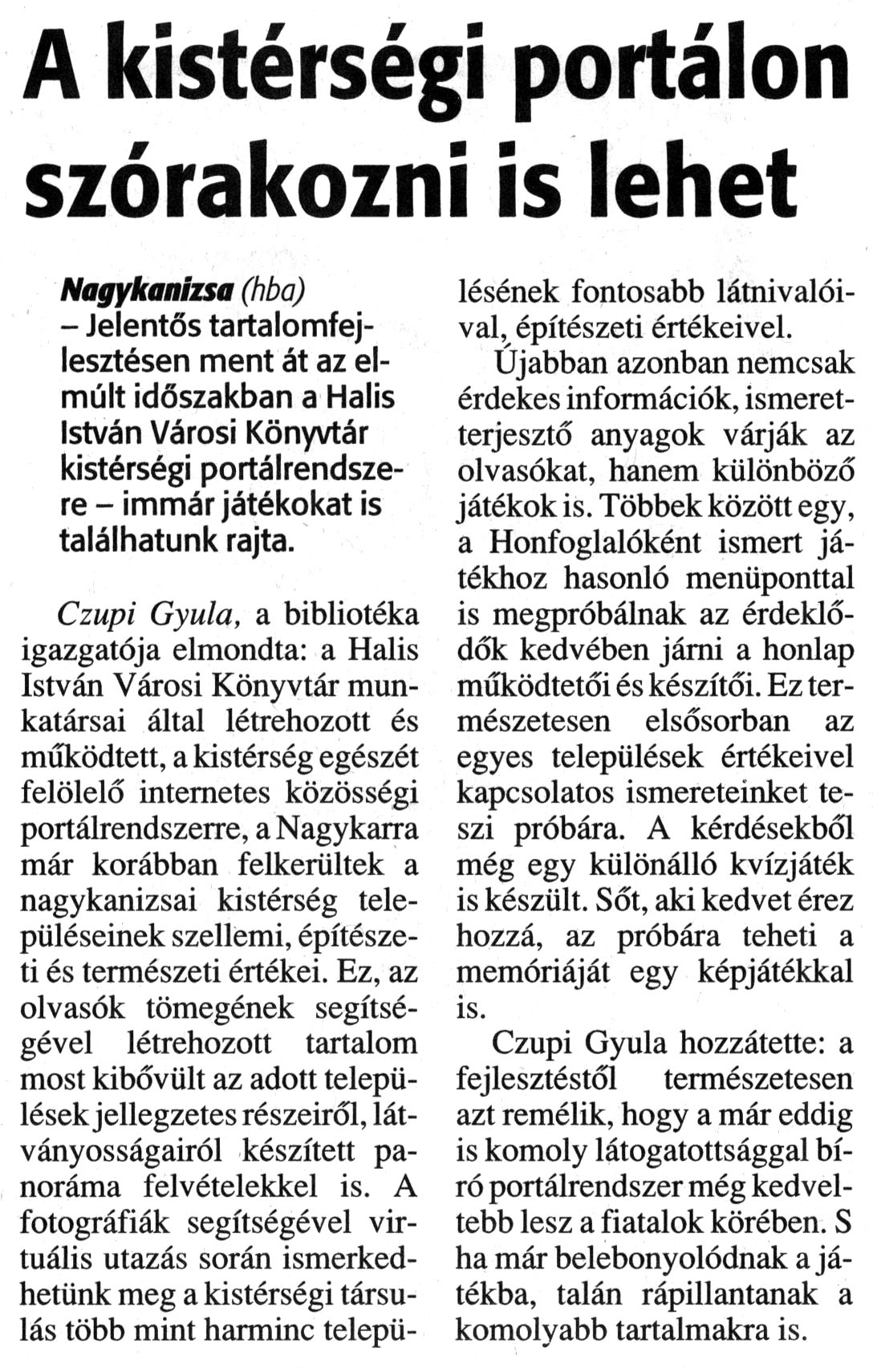 Nyilvános 1167 | 1591 | Zalai Hírlap 2009. február 3. 28. szám 12. oldal | A kistérségi portálon szórakozni is lehet A cikk szövege: A kistérségi portálon szórakozni is lehet Nagykanizsa (hba) - Jelentős tartalomfejlesztésen ment át az elmúlt időszakban a Halis István Városi Könyvtár kistérségi portálrendszere - immár játékokat is találhatunk rajta. Czupi Gyula, a bibliotéka igazgatója elmondta: a Halis István Városi Könyvtár munkatársai által létrehozott és működtett, a kistérség egészét felölelő internetes közösségi portálrendszerre, a Nagykarra már korábban felkerültek a nagykanizsai kistérség településeinek szellemi, építészeti és természeti értékei. Ez, az olvasók tömegének segítségével létrehozott tartalom most kibővült az adott településekjellegzetes részeiről, látványosságairól készített panoráma felvételekkel is. A fotográfiák segítségével virtuális utazás során ismerkedhetünk meg a kistérségi társulás több mint harminc településének fontosabb látnivalóival, építészeti értékeivel. Ujabban azonban nemcsak érdekes információk, ismeretterjesztő anyagok várják az olvasókat, hanem különböző játékok is. Többek között egy, a Honfoglalóként ismert játékhoz hasonló menüponttal is megpróbálnak az érdeklődők kedvében járni a honlap működtetői és készítői. Ez természetesen elsősorban az egyes települések értékeivel kapcsolatos ismereteinket teszi próbára. A kérdésekből még egy különálló kvízjáték is készült. Sőt, aki kedvet érez hozzá, az próbára teheti a memóriáját egy képjátékkal is. Czupi Gyula hozzátette: a fejlesztéstől természetesen azt remélik, hogy a már eddig is komoly látogatottsággal bíró portálrendszer még kedveltebb lesz a fiatalok körében. S ha már belebonyolódnak a játékba, talán rápillantanak a komolyabb tartalmakra is. |