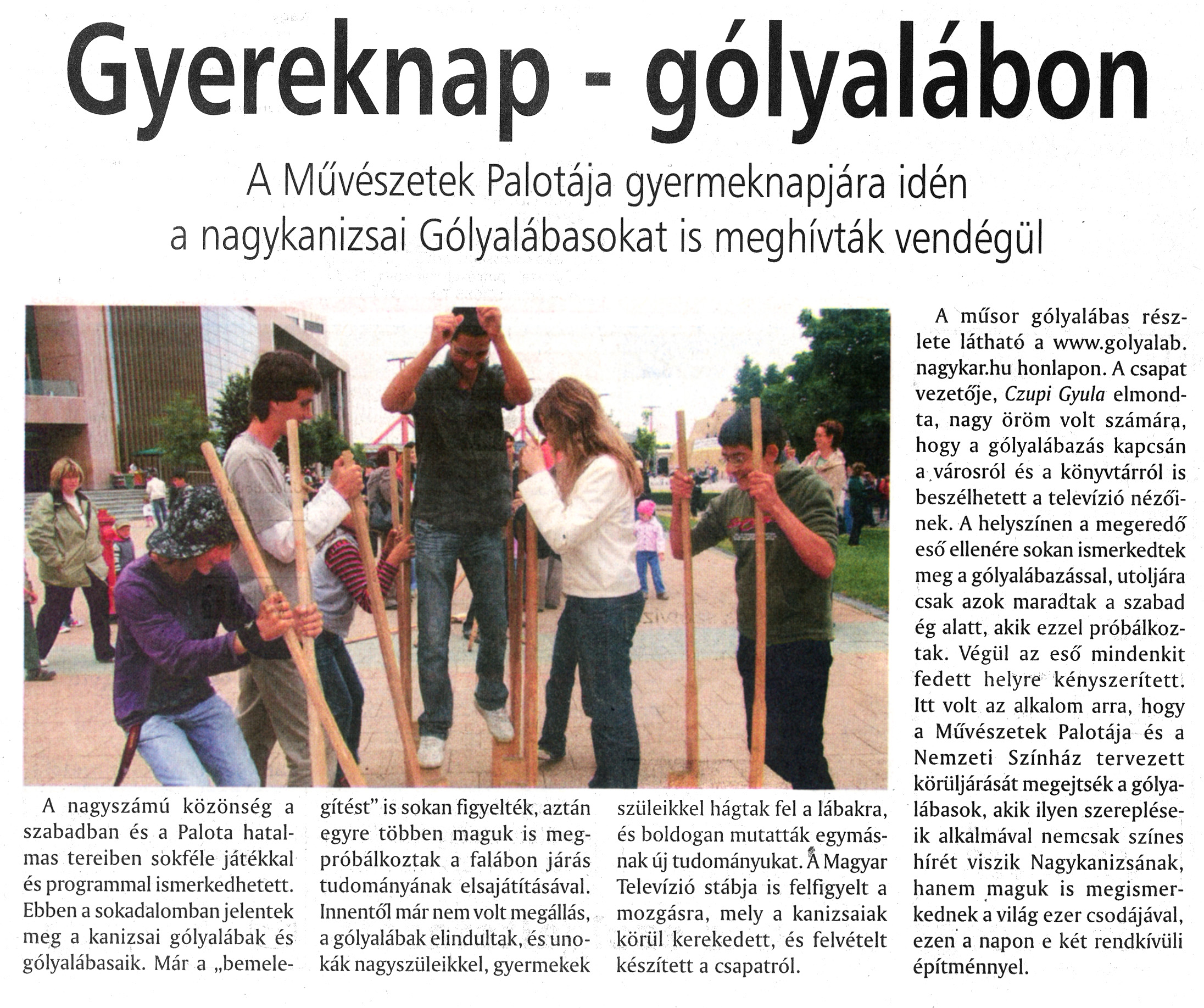 Nyilvános 1666 | 2612 | Nagykanizsai Maraton 2009. június 5. 022. szám 7. oldal | A cikk szövege: Gyereknap - gólyalábon A Művészetek Palotája gyermeknapjára idén a nagykanizsai Gólyalábasokat is meghívták vendégül A nagyszámú közönség a szabadban és a Palota hatalmas tereiben sokféle játékkal és programmal ismerkedhetett. Ebben a sokadalomban jelentek meg a kanizsai gólyalábak és gólyalábasaik. Már a „bemelegítést" is sokan figyelték, aztán egyre többen maguk is megpróbálkoztak a falábon járás tudományának elsajátításával. Innentől már nem volt megállás, a gólyalábak elindultak, és unokák nagyszüleikkel, gyermekek szüleikkel hágtak fel a lábakra, és boldogan mutatták egymásnak új tudományukat. A Magyar Televízió stábja is felfigyelt a mozgásra, mely a kanizsaiak körül kerekedett, és felvételt készített a csapatról. A műsor gólyalábas részlete látható a www.golyalab. nagykar.hu honlapon. A csapat vezetője, Czupi Gyula elmondta, nagy öröm volt számára, hogy a gólyalábazás kapcsán a városról és a könyvtárról is beszélhetett a televízió nézőinek. A helyszínen a megeredő eső ellenére sokan ismerkedtek meg a gólyalábazással, utoljára csak azok maradtak a szabad ég alatt, akik ezzel próbálkoztak. Végül az eső mindenkit fedett helyre kényszerített. Itt volt az alkalom arra, hogy a Művészetek Palotája és a Nemzeti Színház tervezett körüljárását megejtsék a gólyalábasok, akik ilyen szerepléseik alkalmával nemcsak színes hírét viszik Nagykanizsának, hanem maguk is megismerkednek a világ ezer csodájával, ezen a napon e két rendkívüli építménnyel. |