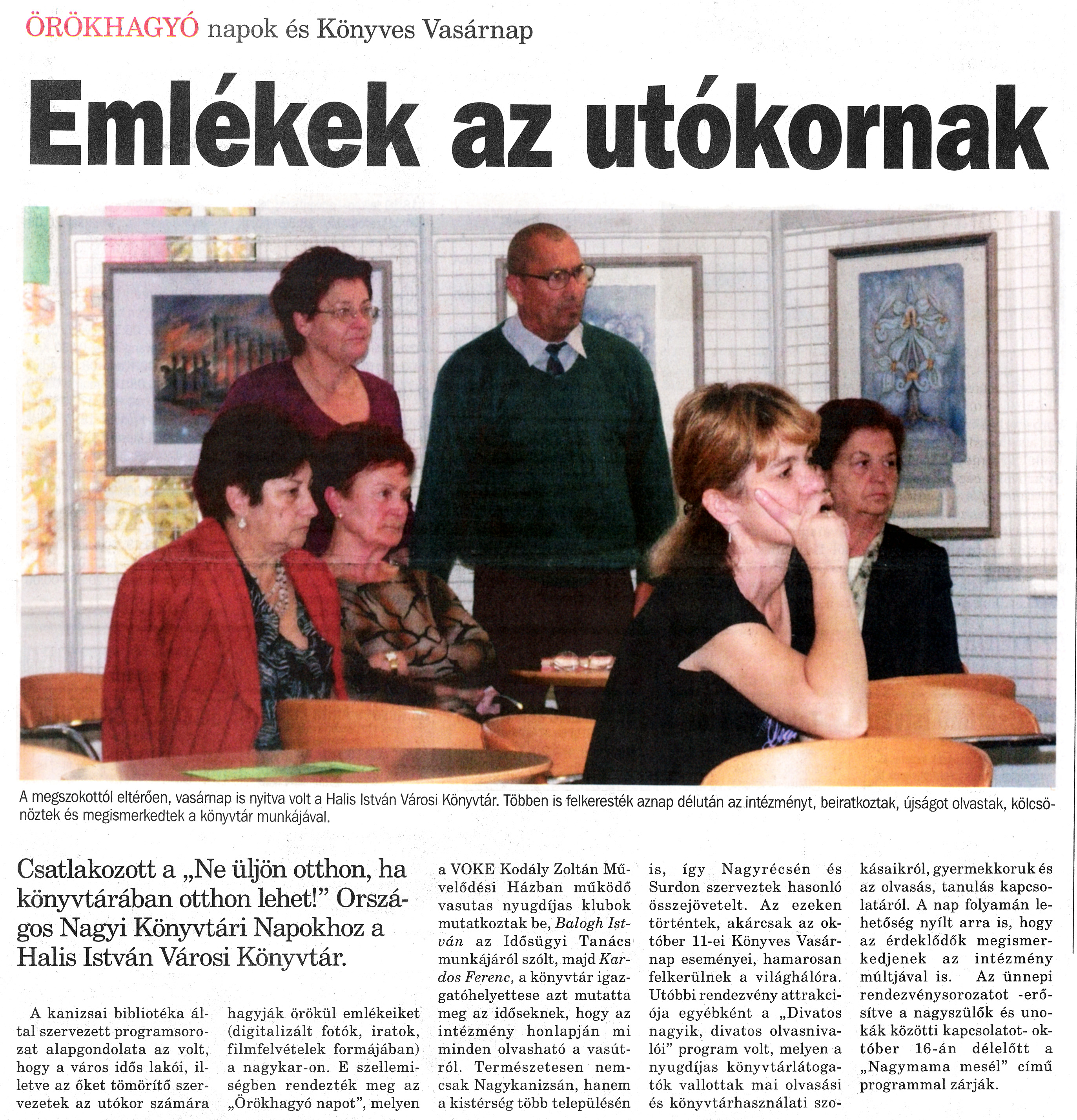 Nyilvános 1243 | 1691 | Nagykanizsai Maraton 2009.10.16. 041. szám 1. oldal - Emlékek az utókornak | A cikk szövege: ÖRÖKHAGYÓ napok és Könyves Vasárnap Emlékek az utókornak A megszokottól eltérően, vasárnap is nyitva volt a Halis István Városi Könyvtár. Többen is felkeresték aznap délután az intézményt, beiratkoztak, újságot olvastak kölcsönöztek és megismerkedtek a könyvtár munkájával. Csatlakozott a „Ne üljön otthon, ha könyvtárában otthon lehet!” Országos Nagyi Könyvtári Napokhoz a Halis István Városi Könyvtár. A kanizsai bibliotéka által szervezett programsorozat alapgondolata az volt, hogy a város idős lakói, illetve az őket tömörítő szervezetek az utókor számára hagyják örökül emlékeiket (digitalizált fotók, iratok, filmfelvételek formájában) a nagykar-on. E szellemiségben rendezték meg az „Örökhagyó napot”, melyen a VOKE Kodály Zoltán Művelődési Házban működő vasutas nyugdíjas klubok mutatkoztak be, Balogh István az Idősügyi Tanács munkájáról szólt, majd Kardos Ferenc, a könyvtár igazgatóhelyettese azt mutatta meg az időseknek, hogy az intézmény honlapján mi minden olvasható a vasútról. Természetesen nemcsak Nagykanizsán, hanem a kistérség több településén is, így Nagyrécsén és Surdon szerveztek hasonló összejövetelt. Az ezeken történtek, akárcsak az október 11-ei Könyves Vasárnap eseményei, hamarosan felkerülnek a világhálóra. Utóbbi rendezvény attrakciója egyébként a „Divatos nagyik, divatos olvasnivalói” program volt, melyen a nyugdíjas könyvtárlátogatók vallottak mai olvasási és könyvtárhasználati szokásaikról, gyermekkoruk és az olvasás, tanulás kapcsolatáról. A nap folyamán lehetőség nyílt arra is, hogy az érdeklődők megismerkedjenek az intézmény múltjával is. Az ünnepi rendezvénysorozatot -erősítve a nagyszülők és unokák közötti kapcsolatot- október 16-án délelőtt a „Nagymama mesél” című programmal zárják. |