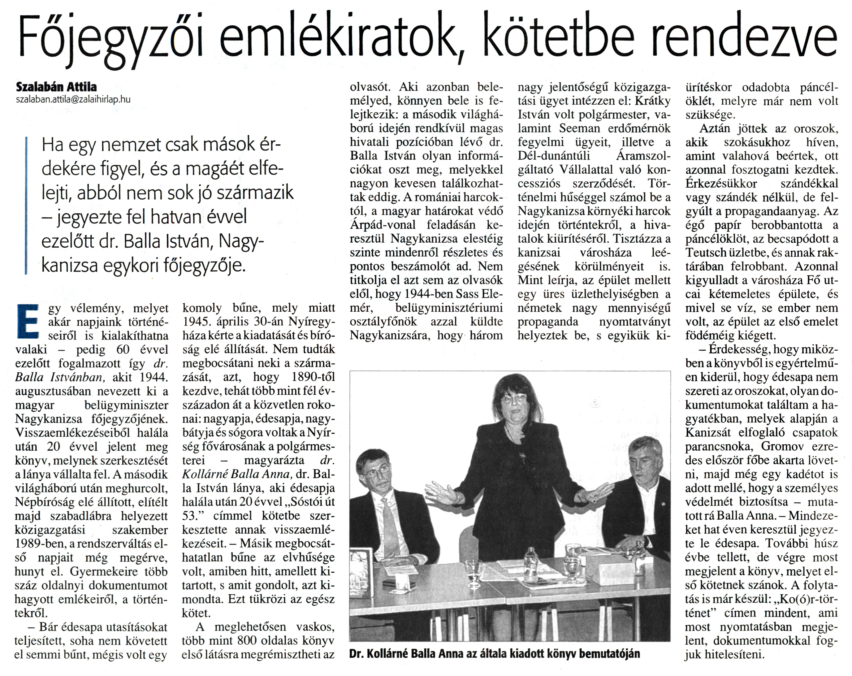 Nyilvános 1164 | 1622 | Zalai Hírlap 2010. június 12. 135. szám 14. oldal - Főjegyzői emlékiratok, kötetbe rendezve | A cikk szövege: Főjegyzői emlékiratok, kötetbe rendezve Szalabán Attila szalaban.attila@zalaihirlap.hu Ha egy nemzet csak mások érdekére figyel, és a magáét elfelejti, abból nem sok jó származik - jegyezte fel hatvan évvel ezelőtt dr. Balla István, Nagykanizsa egykori főjegyzője. Egy vélemény, melyet akár napjaink történéseiről is kialakíthatna valaki - pedig 60 évvel ezelőtt fogalmazott így dr. Balla Istvánban, akit 1944. augusztusában nevezett ki a magyar belügyminiszter Nagykanizsa főjegyzőjének. Visszaemlékezéseiből halála után 20 évvel jelent meg könyv, melynek szerkesztését a lánya vállalta fel. A második világháború után meghurcolt, Népbíróság elé állított, elítélt majd szabadlábra helyezett közigazgatási szakember 1989-ben, a rendszerváltás első napjait még megérve, hunyt el. Gyermekeire több száz oldalnyi dokumentumot hagyott emlékeiről, a történtekről. - Bár édesapa utasításokat teljesített, soha nem követett el semmi bűnt, mégis volt egy komoly bűne, mely miatt 1945. április 30-án Nyíregyháza kérte a kiadatását és bíróság elé állítását. Nem tudták megbocsátani neki a származását, azt, hogy 1890-től kezdve, tehát több mint fél évszázadon át a közvetlen rokonai: nagyapja, édesapja, nagybátyja és sógora voltak a Nyírség fővárosának a polgármesterei - magyarázta dr. Kollárné Balla Anna, dr. Balla István lánya, aki édesapja halála után 20 évvel „Sóstói út 53." címmel kötetbe szerkesztette annak visszaemlékezéseit. - Másik megbocsáthatatlan bűne az elvhűsége volt, amiben hitt, amellett kitartott, s amit gondolt, azt kimondta. Ezt tükrözi az egész kötet. A meglehetősen vaskos, több mint 800 oldalas könyv első látásra megrémisztheti az olvasót. Aki azonban belemélyed, könnyen bele is felejtkezik: a második világháború idején rendkívül magas hivatali pozícióban lévő dr. Balla István olyan információkat oszt meg, melyekkel nagyon kevesen találkozhattak eddig. A romániai harcoktól, a magyar határokat védő Árpád-vonal feladásán keresztül Nagykanizsa elestéig szinte mindenről részletes és pontos beszámolót ad. Nem titkolja el azt sem az olvasók elől, hogy 1944-ben Sass Elemér, belügyminisztériumi osztályfőnök azzal küldte Nagykanizsára, hogy három nagy jelentőségű közigazgatási ügyet intézzen el: Krátky István volt polgármester, valamint Seeman erdőmérnök fegyelmi ügyeit, illetve a Dél-dunántúli Áramszolgáltató Vállalattal való koncessziós szerződését. Történelmi hűséggel számol be a Nagykanizsa környéki harcok idején történtekről, a hivatalok kiürítéséről. Tisztázza a kanizsai városháza leégésének körülményeit is. Mint leírja, az épület mellett egy üres üzlethelyiségben a németek nagy mennyiségű propaganda nyomtatványt helyeztek be, s egyikük kiürítéskor odadobta páncélöklét, melyre már nem volt szüksége. Aztán jöttek az oroszok, akik szokásukhoz híven, amint valahová beértek, ott azonnal fosztogatni kezdtek. Érkezésükkor szándékkal vagy szándék nélkül, de felgyúlt a propagandaanyag. Az égő papír berobbantotta a páncélöklöt, az becsapódott a Teutsch üzletbe, és annak raktárában felrobbant. Azonnal kigyulladt a városháza Fő utcai kétemeletes épülete, és mivel se víz, se ember nem volt, az épület az első emelet födéméig kiégett. - Érdekesség, hogy miközben a könyvből is egyértelműen kiderül, hogy édesapa nem szereti az oroszokat, olyan dokumentumokat találtam a hagyatékban, melyek alapján a Kanizsát elfoglaló csapatok parancsnoka, Gromov ezredes először főbe akarta lövetni, majd még egy kadétot is adott mellé, hogy a személyes védelmét biztosítsa - mutatott rá Balla Anna. - Mindezeket hat éven keresztül jegyezte le édesapa. További húsz évbe tellett, de végre most megjelent a könyv, melyet első kötetnek szánok. A folytatás is már készül: „Ko(ó)r-tör-ténet" címen mindent, ami most nyomtatásban megjelent, dokumentumokkal fogjuk hitelesíteni. Dr. Kollárné Balla Anna az általa kiadott könyv bemutatóján |