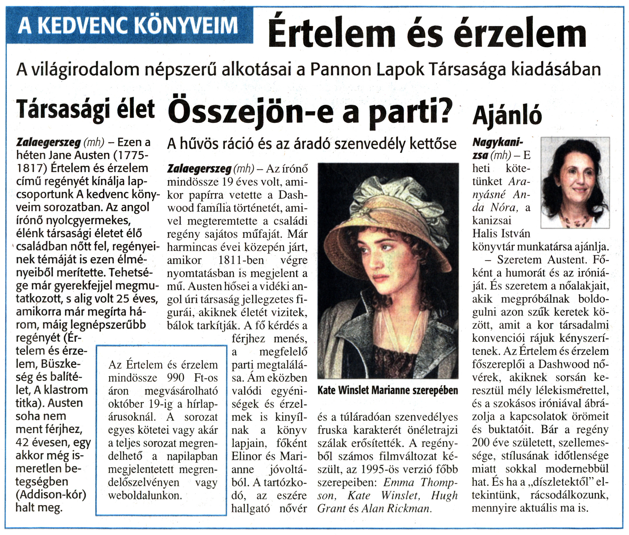 Nyilvános 1195 | 1451 | Zalai Hírlap 2010. október 13. 239. szám 7. oldal - Könyvajánló | A cikk szövege: A KEDVENC KÖNYVEIM Értelem és érzelem A világirodalom népszerű alkotásai a Pannon Lapok Társasága kiadásában Társasági élet Zalaegerszeg (mh) - Ezen a héten Jane Austen (1775-1817) Értelem és érzelem című regényét kínálja lapcsoportunk A kedvenc könyveim sorozatban. Az angol írónő nyolcgyermekes, élénk társasági életet élő családban nőtt fel, regényeinek témáját is ezen élményeiből merítette. Tehetsége már gyerekfejjel megmutatkozott, s alig volt 25 éves, amikorra már megírta három, máig legnépszerűbb regényét (Értelem és érzelem, Büszkeség és balítélet, A klastrom titka). Austen soha nem ment férjhez, 42 évesen, egy akkor még ismeretlen betegségben (Addison-kór) halt meg. Az Értelem és érzelem mindössze 990 Ft-os áron megvásárolható október 19-ig a hírlapárusoknál. A sorozat egyes kötetei vagy akár a teljes sorozat megrendelhető a napilapban megjelentetett megrendelőszelvényen vagy weboldalunkon. Összejön-e a parti? A hűvös ráció és az áradó szenvedély kettőse Zalaegerszeg (mh) - Az írónő mindössze 19 éves volt, amikor papírra vetette a Dashwood família történetét, amivel megteremtette a családi regény sajátos műfaját. Már harmincas évei közepén járt, amikor 1811-ben végre nyomtatásban is megjelent a mű. Austen hősei a vidéki angol úri társaság jellegzetes figurái, akiknek életét vizitek, bálok tarkítják. A fő kérdés a férjhez menés, a megfelelő parti megtalálása. Ám eközben valódi egyéniségek és érzelmek is kinyílnak a könyv lapjain, főként Elinor és Marianne jóvoltából. A tartózkodó, az eszére hallgató nővér Kate Winslet Marianne szerepében és a túláradóan szenvedélyes fruska karakterét önéletrajzi szálak erősítették. A regényből számos filmváltozat készült, az 1995-ös verzió főbb szerepeiben: Emma Thompson, Kate Winslet, Hugh Grant és Alan Rickman. Ajánló Nagykanizsa (mh) - E heti kötetünket Aranyásné Anda Nóra, a kanizsai Halis István könyvtár munkatársa ajánlja. - Szeretem Austent. Főként a humorát és az iróniáját. És szeretem a nőalakjait, akik megpróbálnak boldogulni azon szűk keretek között, amit a kor társadalmi konvenciói rájuk kényszerítenek. Az Értelem és érzelem főszereplői a Dashwood nővérek, akiknek sorsán keresztül mély lélekismerettel, és a szokásos iróniával ábrázolja a kapcsolatok örömeit és buktatóit. Bár a regény 200 éve született, szellemessége, stílusának időtlensége miatt sokkal modernebbül hat. És ha a „díszletektől" eltekintünk, rácsodálkozunk, mennyire aktuális ma is. |