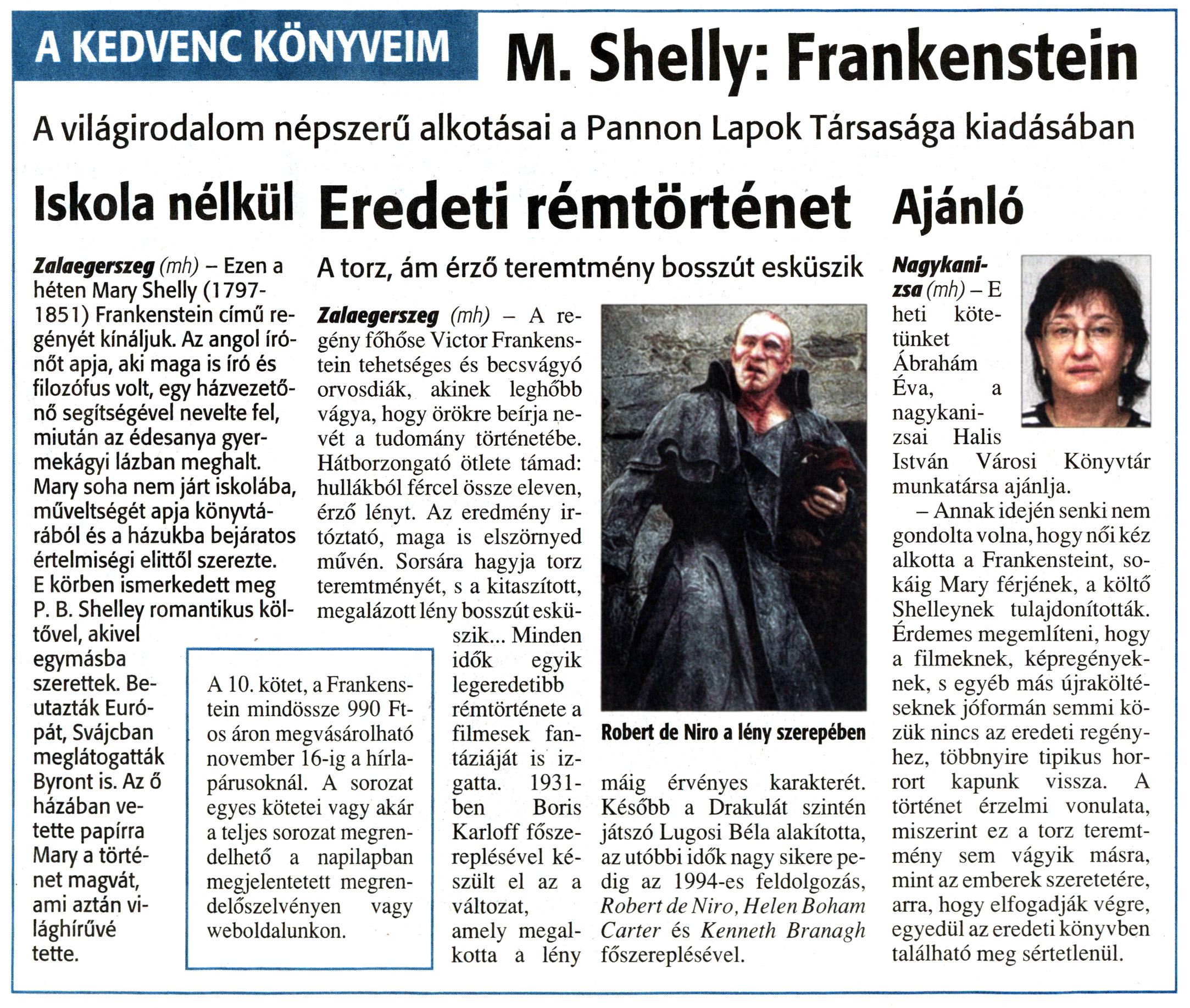 Nyilvános 1148 | 1362 | Zalai Hírlap 2010. november 10. 261. szám 7. oldal - Könyvajánló | A cikk szövege: A KEDVENC KÖNYVEIM M. Shelly: Frankenstein A világirodalom népszerű alkotásai a Pannon Lapok Társasága kiadásában Iskola nélkül Zalaegerszeg (mh) - Ezen a héten Mary Shelly (1797-1851) Frankenstein című regényét kínáljuk. Az angol írónőt apja, aki maga is író és filozófus volt, egy házvezetőnő segítségével nevelte fel, miután az édesanya gyermekágyi lázban meghalt. Mary soha nem járt iskolába, műveltségét apja könyvtárából és a házukba bejáratos értelmiségi elittől szerezte. E körben ismerkedett meg P. B. Shelley romantikus költővel, akivel egymásba szerettek. Beutazták Európát, Svájcban meglátogatták Byront is. Az ő házában vetette papírra Mary a történet magvát, ami aztán világhírűvé tette. Eredeti rémtörténet A torz, ám érző teremtmény bosszút esküszik Zalaegerszeg (mh) - A regény főhőse Victor Frankenstein tehetséges és becsvágyó orvosdiák, akinek leghőbb vágya, hogy örökre beírja nevét a tudomány történetébe. Hátborzongató ötlete támad: hullákból fércei össze eleven, érző lényt. Az eredmény irtóztató, maga is elszörnyed művén. Sorsára hagyja torz teremtményét, s a kitaszított, megalázott lény bosszút esküszik... Minden idők egyik legeredetibb rémtörténete a filmesek fantáziáját is izgatta. 1931-ben Boris Karloff főszereplésével készült el az a változat, amely megalkotta a lény máig érvényes karakterét. Később a Drakulát szintén játszó Lugosi Béla alakította, az utóbbi idők nagy sikere pedig az 1994-es feldolgozás, Robert de Niro, Helen Boham Carter és Kenneth Branagh főszereplésével. A 10. kötet, a Frankenstein mindössze 990 Ft-os áron megvásárolható november 16-ig a hírlapárusoknál. A sorozat egyes kötetei vagy akár a teljes sorozat megrendelhető a napilapban megjelentetett megrendelőszelvényen vagy weboldalunkon. Ajánló Nagykanizsa (mh)-E heti kötetünket Ábrahám Éva, a nagykanizsai Halis István Városi Könyvtár munkatársa ajánlja. - Annak idején senki nem gondolta volna, hogy női kéz alkotta a Frankensteint, sokáig Mary férjének, a költő Shelleynek tulajdonították. Érdemes megemlíteni, hogy a filmeknek, képregényeknek, s egyéb más újraköltéseknek jóformán semmi közük nincs az eredeti regényhez, többnyire tipikus horrort kapunk vissza. A történet érzelmi vonulata, miszerint ez a torz teremtmény sem vágyik másra, mint az emberek szeretetére, arra, hogy elfogadják végre, egyedül az eredeti könyvben található meg sértetlenül. |