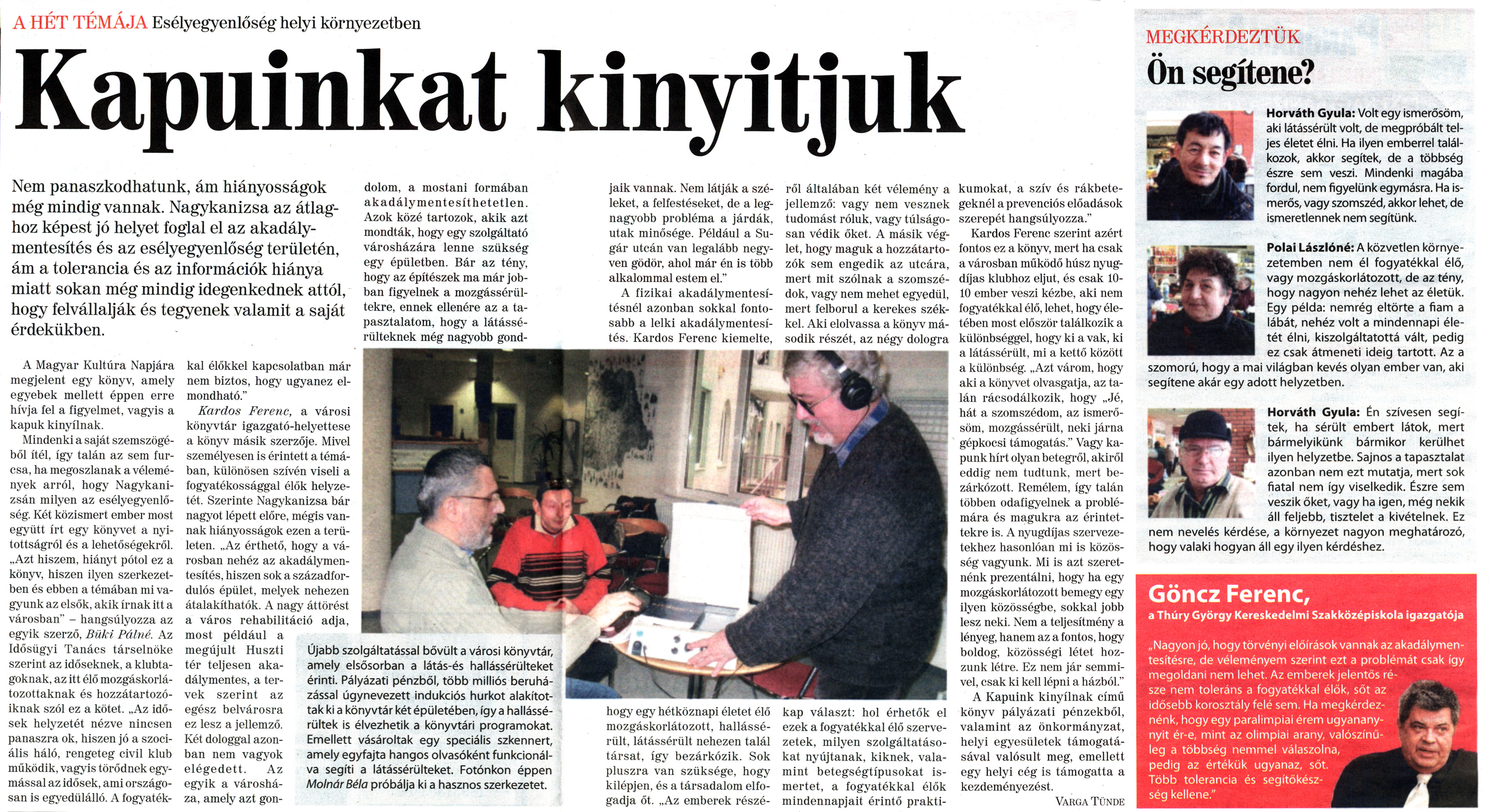 Nyilvános 1966 | 6659 | Nagykanizsai Maraton 2011. január 21. 3. szám 6-7. oldal - Kapuinkat kinyitjuk | A cikk szövege: A HÉT TÉMÁJA Esélyegyenlőség helyi környezetben Kapuinkat kinyitjuk Nem panaszkodhatunk, ám hiányosságok még mindig vannak. Nagykanizsa az átlaghoz képest jó helyet foglal el az akadálymentesítés és az esélyegyenlőség területén, ám a tolerancia és az információk hiánya miatt sokan még mindig idegenkednek attól, hogy felvállalják és tegyenek valamit a saját érdekükben. A Magyar Kultúra Napjára megjelent egy könyv, amely egyebek mellett éppen erre hívja fel a figyelmet, vagyis a kapuk kinyílnak. Mindenki a saját szemszögéből ítél, így talán az sem furcsa, ha megoszlanak a vélemények arról, hogy Nagykanizsán milyen az esélyegyenlőség. Két közismert ember most együtt írt egy könyvet a nyitottságról és a lehetőségekről. „Azt hiszem, hiányt pótol ez a könyv, hiszen ilyen szerkezetben és ebben a témában mi vagyunk az elsők, akik írnak itt a városban" - hangsúlyozza az egyik szerző, Büki Pálné. Az Idősügyi Tanács társelnöke szerint az időseknek, a klubtagoknak, az itt élő mozgáskorlátozottaknak és hozzátartozóiknak szól ez a kötet. „Az idősek helyzetét nézve nincsen panaszra ok. hiszen jó a szociális háló, rengeteg civil klub működik, vagyis törődnek egymással az idősek, ami országosan is egyedülálló. A fogyatékkal élőkkel kapcsolatban már nem biztos, hogy ugyanez elmondható." Kardos Ferenc, a városi könyvtár igazgató-helyettese a könyv másik szerzője. Mivel személyesen is érintett a témában, különösen szívén viseli a fogyatékossággal élők helyzetét. Szerinte Nagykanizsa bár nagyot lépett előre, mégis vannak hiányosságok ezen a területen. „Az érthető, hogy a városban nehéz az akadálymentesítés, hiszen sok a századfordulós épület, melyek nehezen átalakíthatók. A nagy áttörést a város rehabilitáció adja, most például a megújult Huszti tér teljesen akadálymentes, a tervek szerint az egész belvárosra ez lesz a jellemző. Két dologgal azonban nem vagyok elégedett. Az egyik a városháza, amely azt gondolom, a mostani formában akadály mentesít hetet len. Azok közé tartozok, akik azt mondták, hogy egy szolgáltató városházára lenne szükség egy épületben. Bár az tény, hogy az építészek ma már jobban figyelnek a mozgássérültekre, ennek ellenére az a tapasztalatom, hogy a látássérülteknek még nagyobb gondjaik vannak. Nem látják a széleket, a felfestéseket, de a legnagyobb probléma a járdák, utak minősége. Például a Sugár utcán van legalább negyven gödör, ahol már én is több alkalommal estem el." A fizikai akadálymentesítésnél azonban sokkal fontosabb a lelki akadálymentesítés. Kardos Ferenc kiemelte, hogy egy hétköznapi életet élő mozgáskorlátozott, hallássérült, látássérült nehezen talál társat, így bezárkózik. Sok pluszra van szüksége, hogy kilépjen, és a társadalom elfogadja őt. „Az emberek részéről általában két vélemény a jellemző: vagy nem vesznek tudomást róluk, vagy túlságosan védik őket. A másik véglet, hogy maguk a hozzátartozók sem engedik az utcára, mert mit szólnak a szomszédok, vagy nem mehet egyedül, mert felborul a kerekes székkel. Aki elolvassa a könyv második részét, az négy dologra kap választ: hol érhetők el ezek a fogyatékkal élő szervezetek, milyen szolgáltatásokat nyújtanak, kiknek, valamint betegségtípusokat ismertet, a fogyatékkal élők mindennapjait érintő praktikumokat, a szív és rákbetegeknél a prevenciós előadások szerepét hangsúlyozza." Kardos Ferenc szerint azért fontos ez a könyv, mert ha csak a városban működő húsz nyugdíjas klubhoz eljut, és csak 10-10 ember veszi kézbe, aki nem fogyatékkal élő, lehet, hogy életében most először találkozik a különbséggel, hogy ki a vak, ki a látássérült, mi a kettő között a különbség. „Azt várom, hogy aki a könyvet olvasgatja, az talán rácsodálkozik, hogy „Jé, hát a szomszédom, az ismerősöm, mozgássérült, neki járna gépkocsi támogatás." Vagy kapunk hírt olyan betegről, akiről eddig nem tudtunk, mert bezárkózott. Remélem, így talán többen odafigyelnek a problémára és magukra az érintettekre is. A nyugdíjas szervezetekhez hasonlóan mi is közösség vagyunk. Mi is azt szeretnénk prezentálni, hogy ha egy mozgáskorlátozott bemegy egy ilyen közösségbe, sokkal jobb lesz neki. Nem a teljesítmény a lényeg, hanem az a fontos, hogy boldog, közösségi létet hozzunk létre. Ez nem jár semmivel, csak ki kell lépni a házból." A Kapuink kinyílnak című könyv pályázati pénzekből, valamint az önkormányzat, helyi egyesületek támogatásával valósult meg, emellett egy helyi cég is támogatta a kezdeményezést. Varga Tünde Újabb szolgáltatással bővült a városi könyvtár, amely elsősorban a látás-és hallássérülteket érinti. Pályázati pénzből, több milliós beruházással úgynevezett indukciós hurkot alakítottak kl a könyvtár két épületében, így a hallássérültek is élvezhetik a könyvtári programokat. Emellett vásároltak egy speciális szkennert, amely egyfajta hangos olvasóként funkcionálva segíti a látássérülteket. Fotónkon éppen Molnár Béla próbálja kl a hasznos szerkezetet. MEGKÉRDEZTÜK Ön segítene? Horváth Gyula: Volt egy Ismerősöm, aki látássérült volt, de megpróbált teljes életet élni. Ha ilyen emberrel találkozok, akkor segítek, de a többség észre sem veszi. Mindenki magába fordul, nem figyelünk egymásra. Ha ismerős, vagy szomszéd, akkor lehet, de ismeretlennek nem segítünk. Polai Lászlóné: A közvetlen környezetemben nem él fogyatékkal élő, vagy mozgáskorlátozott, de az tény, hogy nagyon nehéz lehet az életük. Egy példa: nemrég 