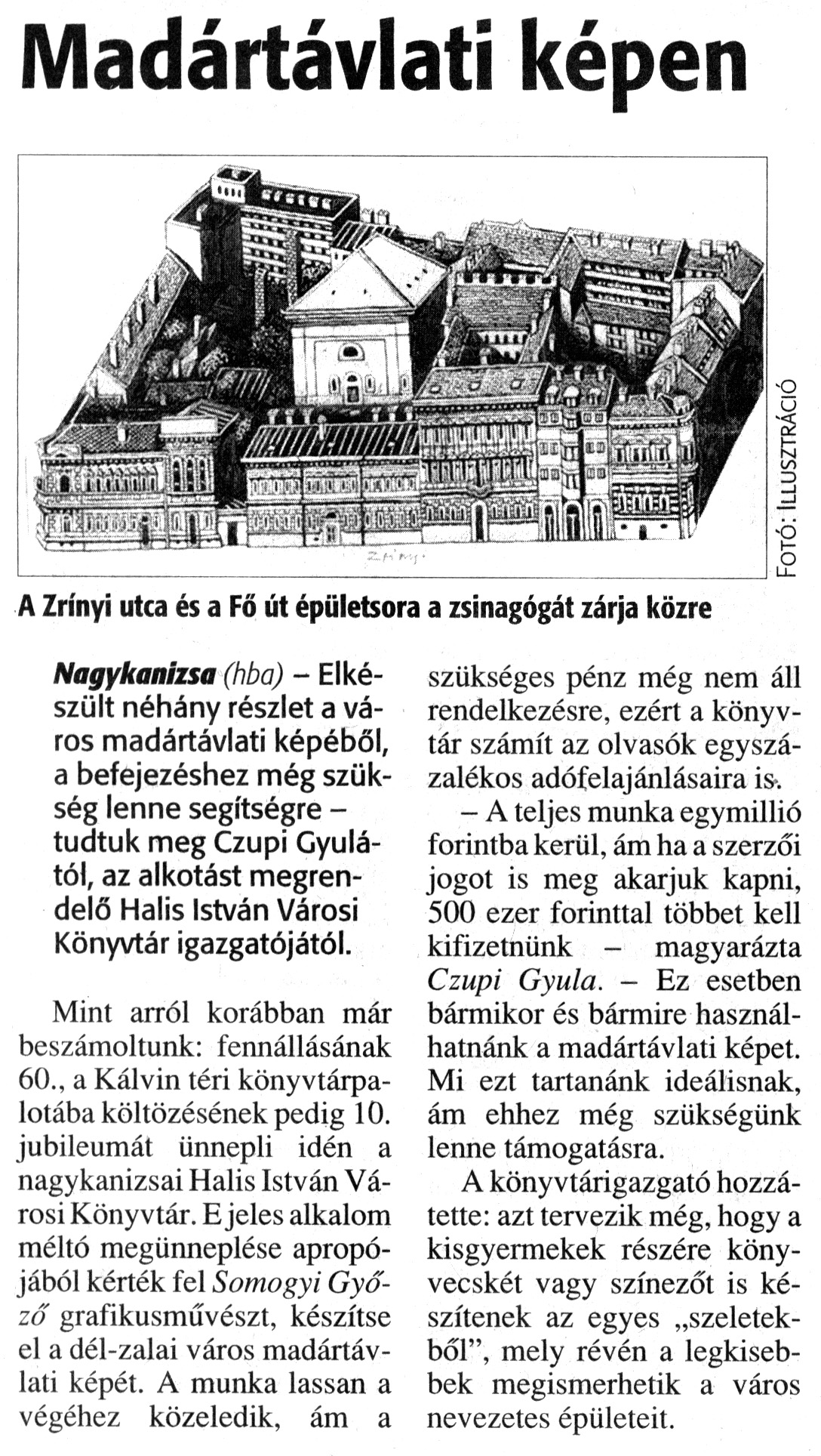 Nyilvános 1880 | 5231 | Zalai Hírlap 2011. február 16. 39. szám 7. oldal - Madártávlati képen | A cikk szövege: Madártávlati képen A Zrínyi utca és a Fő út épületsora a zsinagógát zárja közre Nagykanizsa (hba) - Elkészült néhány részlet a város madártávlati képéből, a befejezéshez még szükség lenne segítségre -tudtuk meg Czupi Gyulától, az alkotást megrendelő Halis István Városi Könyvtár igazgatójától. Mint arról korábban már beszámoltunk: fennállásának 60., a Kálvin téri könyvtárpalotába költözésének pedig 10. jubileumát ünnepli idén a nagykanizsai Halis István Városi Könyvtár. E jeles alkalom méltó megünneplése apropójából kérték fel Somogyi Győző grafikusművészt, készítse el a dél-zalai város madártávlati képét. A munka lassan a végéhez közeledik, ám a szükséges pénz még nem áll rendelkezésre, ezért a könyvtár számít az olvasók egyszázalékos adófelajánlásaira is. - A teljes munka egymillió forintba kerül, ám ha a szerzői jogot is meg akarjuk kapni, 500 ezer forinttal többet kell kifizetnünk - magyarázta Czupi Gyula. - Ez esetben bármikor és bármire használhatnánk a madártávlati képet. Mi ezt tartanánk ideálisnak, ám ehhez még szükségünk lenne támogatásra. A könyvtárigazgató hozzátette: azt tervezik még, hogy a kisgyermekek részére könyvecskét vagy színezőt is készítenek az egyes „szeletekből", mely révén a legkisebbek megismerhetik a város nevezetes épületeit. Fotó: Illusztráció |