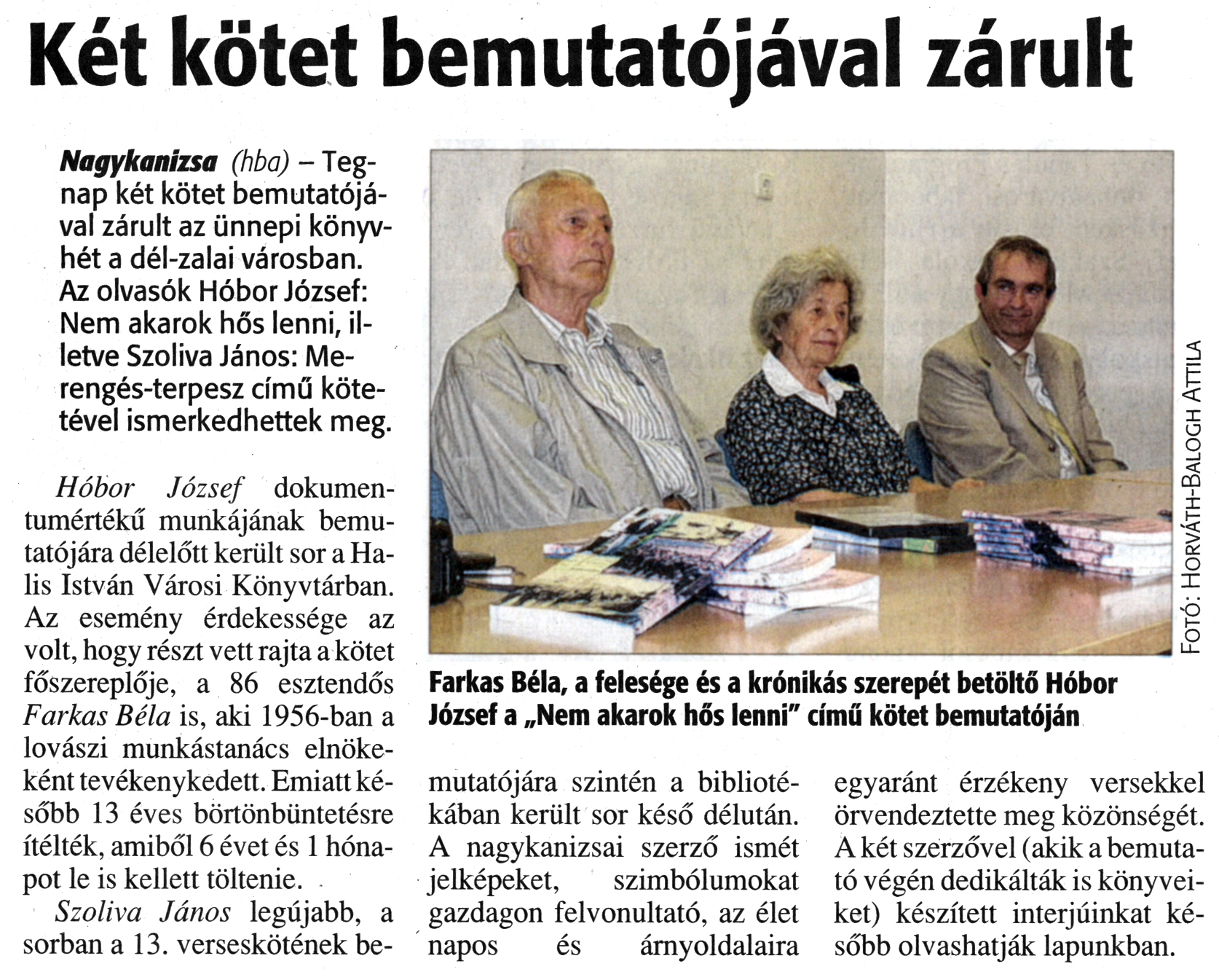 Nyilvános 1672 | 3503 | Zalai Hírlap 2012. június 9. 134. szám 5. oldal - Két kötet bemutatójával zárult | Két kötet bemutatójával zárult Farkas Béla, a felesége és a krónikás szerepét betöltő Hóbor József a „Nem akarok hős lenni" című kötet bemutatóján Fotó: Horváth-Balogh Attila Nagykanizsa (hba) - Tegnap két kötet bemutatójával zárult az ünnepi könyvhét a dél-zalai városban. Az olvasók Hóbor József: Nem akarok hős lenni, illetve Szoliva János: Merengés-terpesz című kötetével ismerkedhettek meg. Hóbor József dokumentumértékű munkájának bemutatójára délelőtt került sor a Halis István Városi Könyvtárban. Az esemény érdekessége az volt, hogy részt vett rajta a kötet főszereplője, a 86 esztendős Farkas Béla is, aki 1956-ban a lovászi munkástanács elnökeként tevékenykedett. Emiatt később 13 éves börtönbüntetésre ítélték, amiből 6 évet és 1 hónapot le is kellett töltenie. Szoliva János legújabb, a sorban a 13. verseskötének be- mutatójára szintén a bibliotékában került sor késő délután. A nagykanizsai szerző ismét jelképeket, szimbólumokat gazdagon felvonultató, az élet napos és árnyoldalaira egyaránt érzékeny versekkel örvendeztette meg közönségét. A két szerzővel (akik a bemutató végén dedikálták is könyveiket) készített interjúinkat később olvashatják lapunkban. |