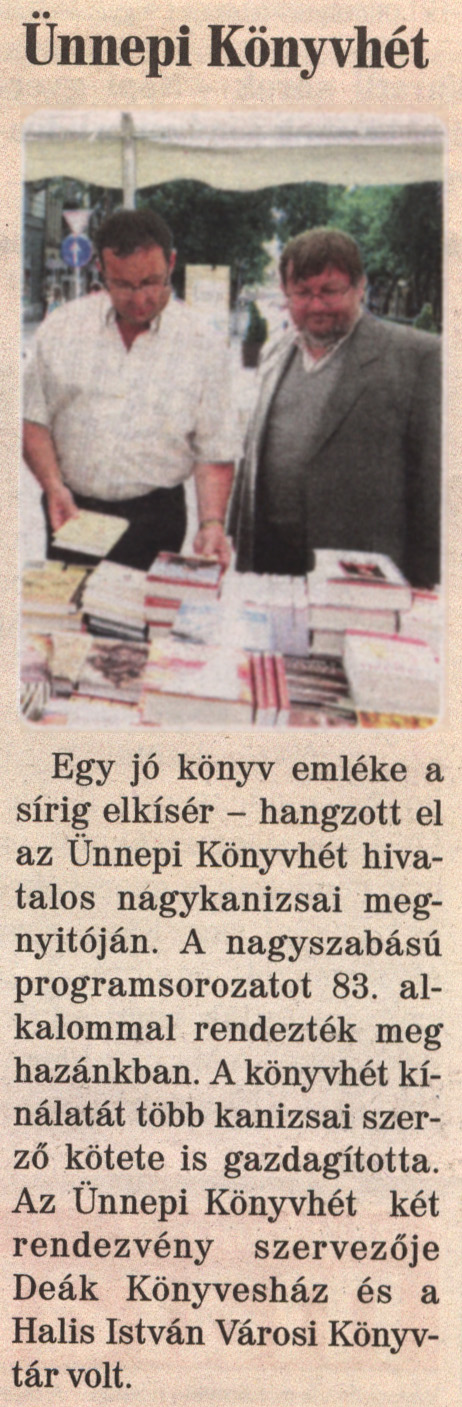 Nyilvános 1889 | 5027 | Nagykanizsai Maraton 2012. június 15. 23. szám 1. oldal - Ünnepi Könyvhét | Ünnepi Könyvhét Egy jó könyv emléke a sírig elkísér - hangzott el az Ünnepi Könyvhét hivatalos nagykanizsai megnyitóján. A nagyszabású programsorozatot 83. alkalommal rendezték meg hazánkban. A könyvhét kínálatát több kanizsai szerző kötete is gazdagította. Az Ünnepi Könyvhét két rendezvény szervezője Deák Könyvesház és a Halis István Városi Könyvtár volt. |