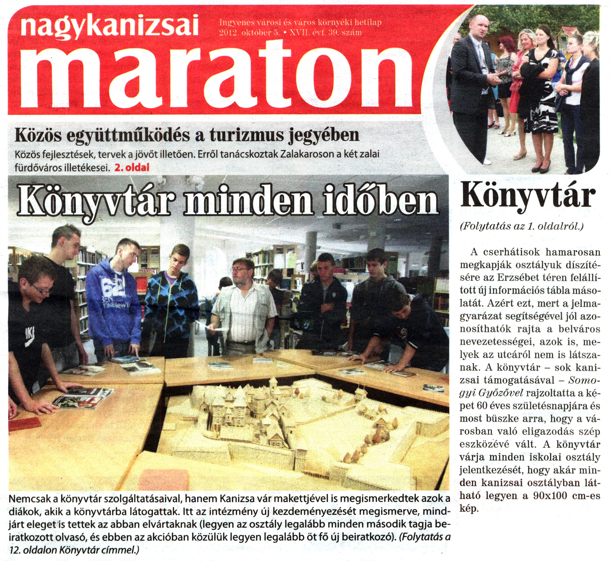 Nyilvános 1857 | 4631 | Nagykanizsai Maraton 2012. október 5. 39. szám 1. oldal - Könyvtár minden időben | Nemcsak a könyvtár szolgáltatásaival, hanem Kanizsa vár makettjével is megismerkedtek azok a diákok, akik a könyvtárba látogattak. Itt az intézmény új kezdeményezését megismerve, mindjárt eleget is tettek az abban elvártaknak (legyen az osztály legalább minden második tagja beiratkozott olvasó, és ebben az akcióban közülük legyen legalább öt fő új beiratkozó). A cserhátisok hamarosan megkapják osztályuk díszítésére az Erzsébet téren felállított új információs tábla másolatát. Azért ezt, mert a jelmagyarázat segítségével jól azonosíthatók rajta a belváros nevezetességei, azok is, melyek az utcáról nem is látszanak. A könyvtár - sok kanizsai támogatásával - Somogyi Győzővel rajzoltatta a képet 60 éves születésnapjára és most büszke arra, hogy a városban való eligazodás szép eszközévé vált. A könyvtár várja minden iskolai osztály jelentkezését, hogy akár minden kanizsai osztályban látható legyen a 90x100 cm-es kép. |