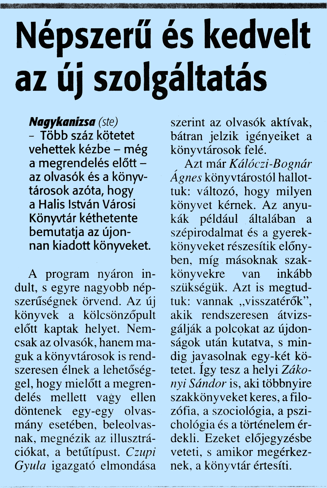 Nyilvános 1728 | 3889 | Zalai Hírlap 2012. november 22. 273. szám 11. oldal - Népszerű és kedvelt az új szolgáltatás | Népszerű és kedvelt az új szolgáltatás Nagykanizsa (ste) - Több száz kötetet vehettek kézbe - még a megrendelés előtt -az olvasók és a könyvtárosok azóta, hogy a Halis István Városi Könyvtár kéthetente bemutatja az újonnan kiadott könyveket. A program nyáron indult, s egyre nagyobb népszerűségnek örvend. Az új könyvek a kölcsönzőpult előtt kaptak helyet. Nemcsak az olvasók, hanem maguk a könyvtárosok is rendszeresen élnek a lehetőséggel, hogy mielőtt a megrendelés mellett vagy ellen döntenek egy-egy olvasmány esetében, beleolvasnak, megnézik az illusztrációkat, a betűtípust. Czupi Gyula igazgató elmondása szerint az olvasók aktívak, bátran jelzik igényeiket a könyvtárosok felé. Azt már Kálóczi-Bognár Ágnes könyvtárostól hallottuk: változó, hogy milyen könyvet kérnek. Az anyukák például általában a szépirodalmat és a gyerekkönyveket részesítik előnyben, míg másoknak szakkönyvekre van inkább szükségük. Azt is megtudtuk: vannak „visszatérők", akik rendszeresen átvizsgálják a polcokat az újdonságok után kutatva, s mindig javasolnak egy-két kötetet. Így tesz a helyi Zákonyi Sándor is, aki többnyire szakkönyveket keres, a filozófia, a szociológia, a pszichológia és a történelem érdekli. Ezeket előjegyzésbe veteti, s amikor megérkeznek, a könyvtár értesíti. |