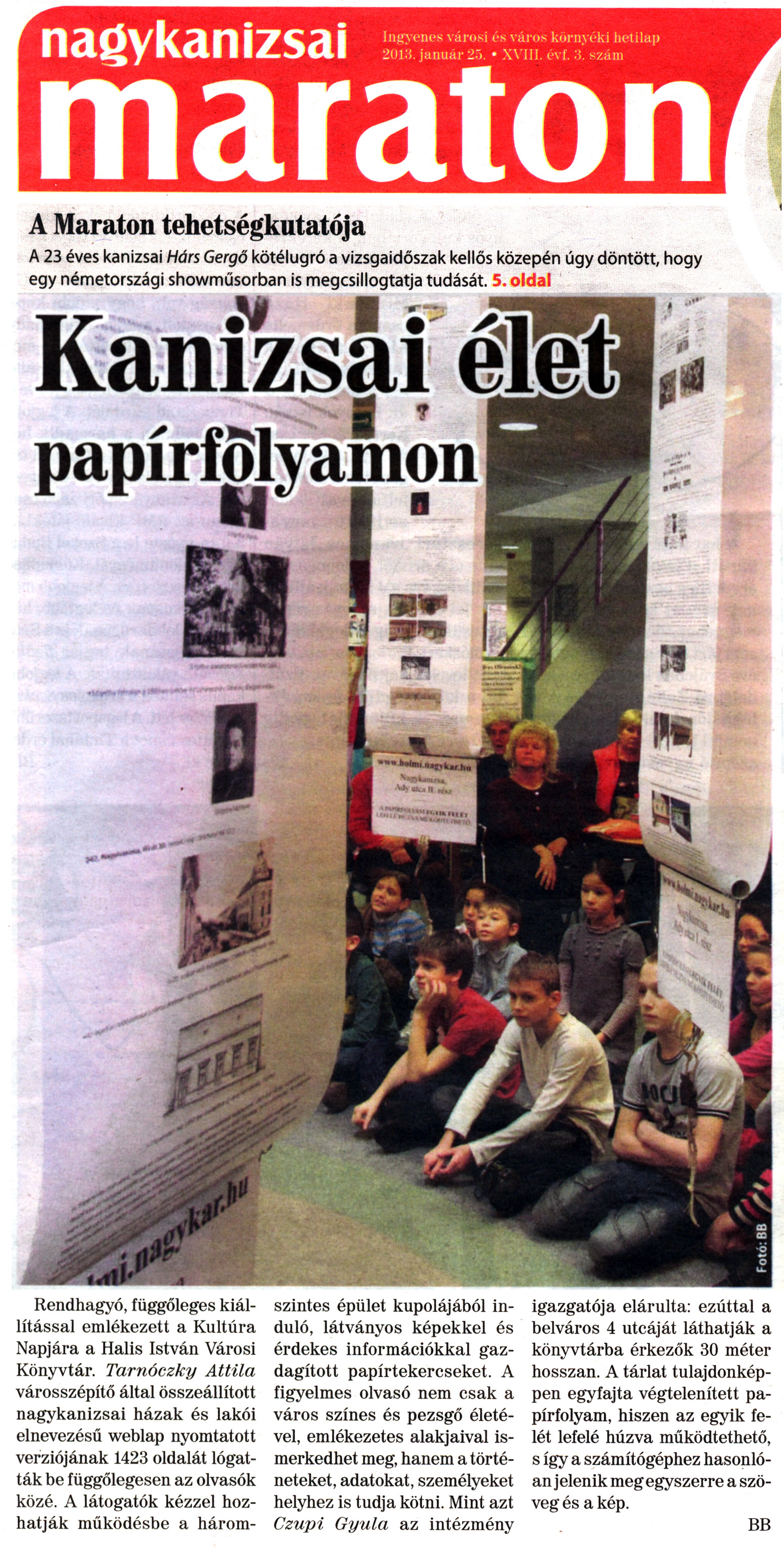 Nyilvános 1628 | 4977 | Nagykanizsai Maraton 2013. január 25. 3. szám 1. oldal - Kanizsai élet papírfolyamon | Kanizsai élet papírfolyamon Rendhagyó, függőleges kiállítással emlékezett a Kultúra Napjára a Halis István Városi Könyvtár. Tarnóczky Attila városszépítő által összeállított nagykanizsai házak és lakói elnevezésű weblap nyomtatott verziójának 1423 oldalát lógatták be függőlegesen az olvasók közé. A látogatók kézzel hozhatják működésbe a háromszintes épület kupolájából induló, látványos képekkel és érdekes információkkal gazdagított papírtekercseket. A figyelmes olvasó nem csak a város színes és pezsgő életével, emlékezetes alakjaival ismerkedhet meg, hanem a történeteket, adatokat, személyeket helyhez is tudja kötni. Mint azt Czupi Gyula az intézmény igazgatója elárulta: ezúttal a belváros 4 utcáját láthatják a könyvtárba érkezők 30 méter hosszan. A tárlat tulajdonképpen egyfajta végtelenített papírfolyam, hiszen az egyik felét lefelé húzva működtethető, s így a számítógéphez hasonlóan jelenik meg egyszerre a szöveg és a kép. BB |