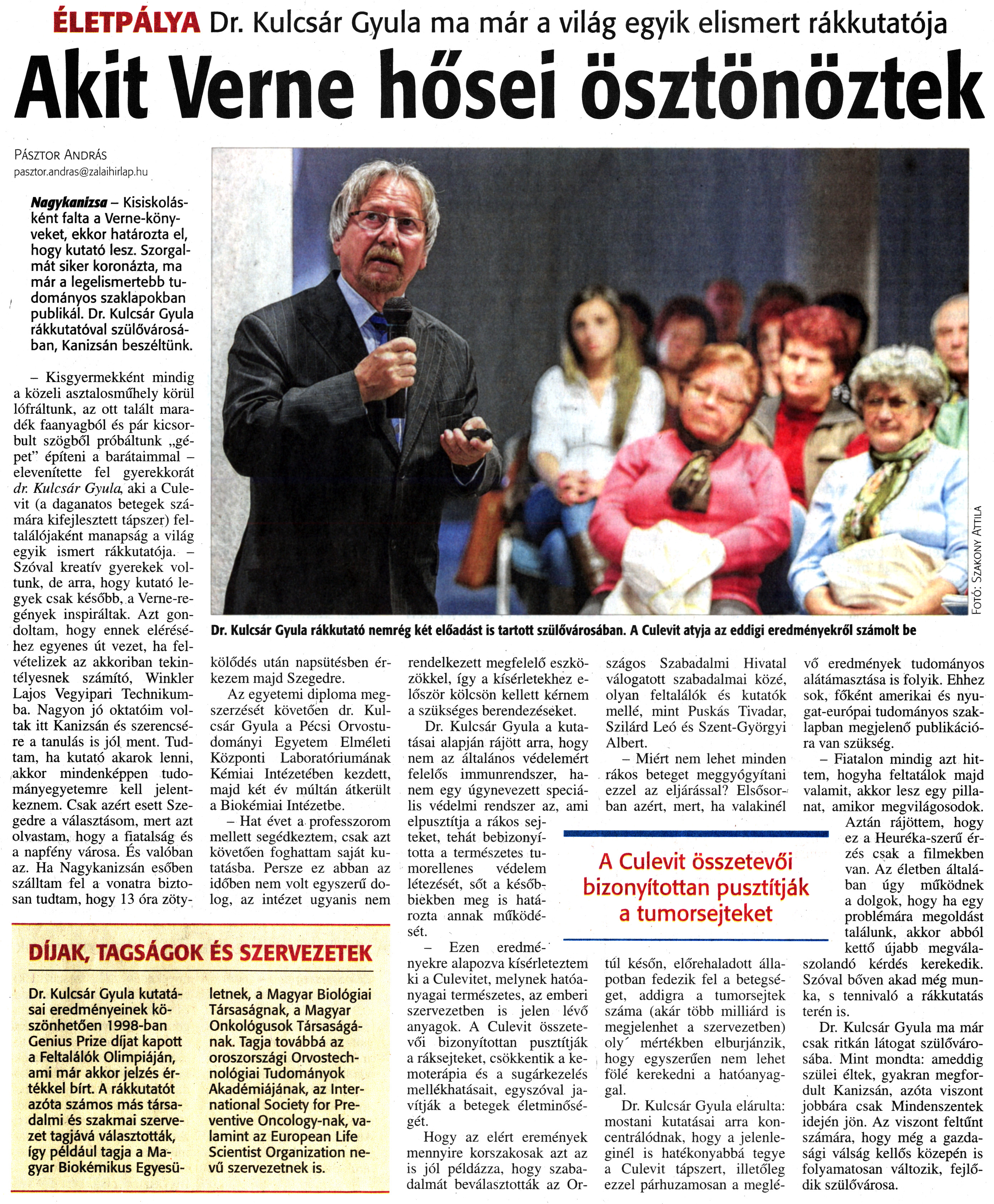 Nyilvános 2112 | 4345 | Zalai Hírlap 2013. november 13. 264. szám 5. oldal | ÉLETPÁLYA Dr. Kulcsár Gyula ma már a világ egyik elismert rákkutatója Akit Verne hősei ösztönöztek Or. Kulcsár Gyula rákkutató nemrég két előadást is tartott szülővárosában. A Culevit atyja az eddigi eredményekről számolt be Pásztor András pasztor.andras@zalaihirlap.hu Nagykanizsa - Kisiskolásként falta a Verne-könyveket, ekkor határozta el, hogy kutató lesz. Szorgalmát siker koronázta, ma már a legelismertebb tudományos szaklapokban publikál. Dr. Kulcsár Gyula rákkutatóval szülővárosában, Kanizsán beszéltünk. - Kisgyermekként mindig a közeli asztalosműhely körül lófráltunk, az ott talált maradék faanyagból és pár kicsorbult szögből próbáltunk „gépet" építeni a barátaimmal -elevenítette fel gyerekkorát dr. Kulcsár Gyula, aki a Culevit (a daganatos betegek számára kifejlesztett tápszer) feltalálójaként manapság a világ egyik ismert rákkutatója. - Szóval kreatív gyerekek voltunk, de arra, hogy kutató legyek csak később, a Verne-regények inspiráltak. Azt gondoltam, hogy ennek eléréséhez egyenes út vezet, ha felvételizek az akkoriban tekintélyesnek számító, Winkler Lajos Vegyipari Technikumba. Nagyon jó oktatóim voltak itt Kanizsán és szerencsére a tanulás is jól ment. Tudtam, ha kutató akarok lenni, akkor mindenképpen tudományegyetemre kell jelentkeznem. Csak azért esett Szegedre a választásom, mert azt olvastam, hogy a fiatalság és a napfény városa. És valóban az. Ha Nagykanizsán esőben szálltam fel a vonatra biztosan tudtam, hogy 13 óra zöty- kölődés után napsütésben érkezem majd Szegedre. Az egyetemi diploma megszerzését követően dr. Kulcsár Gyula a Pécsi Orvostudományi Egyetem Elméleti Központi Laboratóriumának Kémiai Intézetében kezdett, majd két év múltán átkerült a Biokémiai Intézetbe. - Hat évet a professzorom mellett segédkeztem, csak azt követően foghattam saját kutatásba. Persze ez abban az időben nem volt egyszerű dolog, az intézet ugyanis nem rendelkezett megfelelő eszközökkel, így a kísérletekhez először kölcsön kellett kérnem a szükséges berendezéseket. Dr. Kulcsár Gyula a kutatásai alapján rájött arra, hogy nem az általános védelemért felelős immunrendszer, hanem egy úgynevezett speciális védelmi rendszer az, ami elpusztítja a rákos sejteket, tehát bebizonyította a természetes tumorellenes védelem létezését, sőt a későbbiekben meg is határozta annak működését. - Ezen eredményekre alapozva kísérleteztem ki a Culevitet, melynek hatóanyagai természetes, az emberi szervezetben is jelen lévő anyagok. A Culevit összetevői bizonyítottan pusztítják a ráksejteket, csökkentik a kemoterápia és a sugárkezelés mellékhatásait, egyszóval javítják a betegek életminőségét. Hogy az elért eremények mennyire korszakosak azt az is jól példázza, hogy szabadalmát beválasztották az Országos Szabadalmi Hivatal válogatott szabadalmai közé, olyan feltalálók és kutatók mellé, mint Puskás Tivadar, Szilárd Leó és Szent-Györgyi Albert. - Miért nem lehet minden rákos beteget meggyógyítani ezzel az eljárással? Elsősorban azért, mert, ha valakinél túl későn, előrehaladott állapotban fedezik fel a betegséget, addigra a tumorsejtek száma (akár több milliárd is megjelenhet a szervezetben) oly\' mértékben elburjánzik, hogy egyszerűen nem lehet fölé kerekedni a hatóanyaggal. Dr. Kulcsár Gyula elárulta: mostani kutatásai arra koncentrálódnak, hogy a jelenleginél is hatékonyabbá tegye a Culevit tápszert, illetőleg ezzel párhuzamosan a meglévő eredmények tudományos alátámasztása is folyik. Ehhez sok, főként amerikai és nyugat-európai tudományos szaklapban megjelenő publikációra van szükség. - Fiatalon mindig azt hittem, hogyha feltatálok majd valamit, akkor lesz egy pillanat, amikor megvilágosodok. Aztán rájöttem, hogy ez a Heuréka-szerű érzés csak a filmekben van. Az életben általában úgy működnek a dolgok, hogy ha egy problémára megoldást találunk, akkor abból kettő újabb megválaszolandó kérdés kerekedik. Szóval bőven akad még munka, s tennivaló a rákkutatás terén is. Dr. Kulcsár Gyula ma már csak ritkán látogat szülővárosába. Mint mondta: ameddig szülei éltek, gyakran megfordult Kanizsán, azóta viszont jobbára csak Mindenszentek idején jön. Az viszont feltűnt számára, hogy még a gazdasági válság kellős közepén is folyamatosan változik, fejlődik szülővárosa. A Culevit összetevői bizonyítottan pusztítják a tumorsejteket DÍJAK, TAGSÁGOK ÉS SZERVEZETEK Dr. Kulcsár Gyula kutatásai eredményeinek köszönhetően 1998-ban Genius Prize díjat kapott a Feltalálók Olimpiáján, ami már akkor jelzés értékkel bírt. A rákkutatót azóta számos más társadalmi és szakmai szervezet tagjává választották, így például tagja a Magyar Biokémikus Egyesületnek, a Magyar Biológiai Társaságnak, a Magyar Onkológusok Társaságának. Tagja továbbá az oroszországi Orvostechnológiai Tudományok Akadémiájának, az International Society for Preventive Oncology-nak, valamint az European Life Scientist Organization nevű szervezetnek is. |