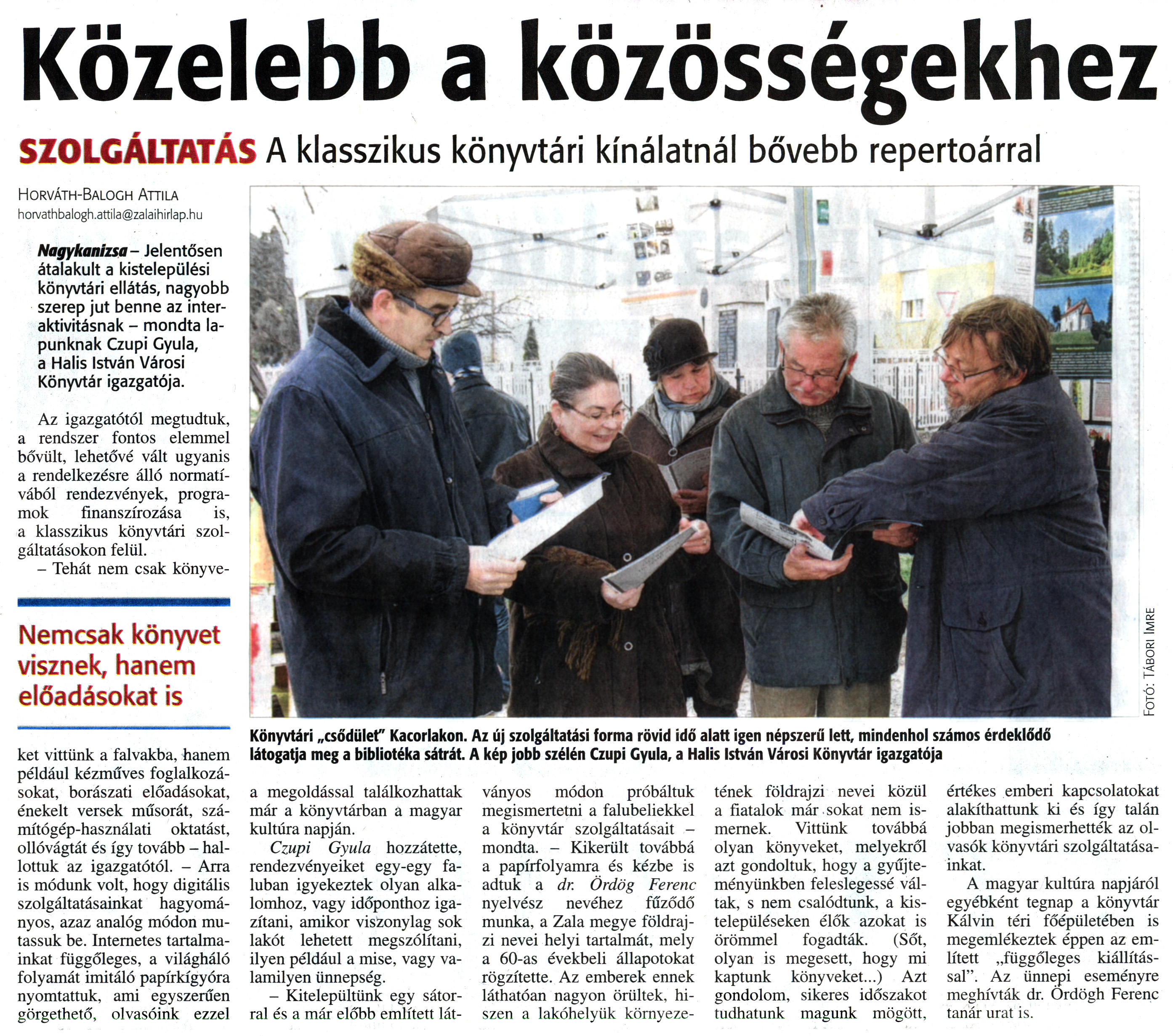 Nyilvános 2187 | 5231 | Zalai Hírlap 2014. január 23. 19. szám 11. oldal - Közelebb a közösségekhez | Közelebb a közösségekhez SZOLGÁLTATÁSA klasszikus könyvtári kínálatnál bővebb repertoárral Nemcsak könyvet visznek, hanem előadásokat is Horváth-Balogh Attila horvathbalogh.attila@zalaihirlap.hu Nagykanizsa - Jelentősen átalakult a kistelepülési könyvtári ellátás, nagyobb szerep jut benne az interaktivitásnak - mondta lapunknak Czupi Gyula, a Halis István Városi Könyvtár igazgatója. Az igazgatótól megtudtuk, a rendszer fontos elemmel bővült, lehetővé vált ugyanis a rendelkezésre álló normatívából rendezvények, programok finanszírozása is, a klasszikus könyvtári szolgáltatásokon felül. - Tehát nem csak könyveket vittünk a falvakba, hanem például kézműves foglalkozásokat, borászati előadásokat, énekelt versek műsorát, számítógép-használati oktatást, ollóvágtát és így tovább - hallottuk az igazgatótól. - Arra is módunk volt, hogy digitális szolgáltatásainkat hagyományos, azaz analóg módon mutassuk be. Internetes tartalmainkat függőleges, a világháló folyamát imitáló papírkígyóra nyomtattuk, ami egyszerűen görgethető, olvasóink ezzel a megoldással találkozhattak már a könyvtárban a magyar kultúra napján. Czupi Gyula hozzátette, rendezvényeiket egy-egy faluban igyekeztek olyan alkalomhoz, vagy időponthoz igazítani, amikor viszonylag sok lakót lehetett megszólítani, ilyen például a mise, vagy valamilyen ünnepség. - Kitelepültünk egy sátorral és a már előbb említett lát- ványos módon próbáltuk megismertetni a falubeliekkel a könyvtár szolgáltatásait -mondta. - Kikerült továbbá a papírfolyamra és kézbe is adtuk a dr. Ördög Ferenc nyelvész nevéhez fűződő munka, a Zala megye földrajzi nevei helyi tartalmát, mely a 60-as évekbeli állapotokat rögzítette. Az emberek ennek láthatóan nagyon örültek, hiszen a lakóhelyük környezetének földrajzi nevei közül a fiatalok már sokat nem ismernek. Vittünk továbbá olyan könyveket, melyekről azt gondoltuk, hogy a gyűjteményünkben feleslegessé váltak, s nem csalódtunk, a kistelepüléseken élők azokat is örömmel fogadták. (Sőt, olyan is megesett, hogy mi kaptunk könyveket...) Azt gondolom, sikeres időszakot tudhatunk magunk mögött. értékes emberi kapcsolatokat alakíthattunk ki és így talán jobban megismerhették az olvasók könyvtári szolgáltatásainkat. A magyar kultúra napjáról egyébként tegnap a könyvtár Kálvin téri főépületében is megemlékeztek éppen az említett „függőleges kiállítással". Az ünnepi eseményre meghívták dr. Ördög Ferenc tanár urat is. Könyvtári „csődület" Kacorlakon. Az új szolgáltatási forma rövid idő alatt igen népszerű lett, mindenhol számos érdeklődő látogatja meg a bibliotéka sátrát. A kép jobb szélén Czupi Gyula, a Halis István Városi Könyvtár igazgatója Fotó: Tábori Imre |