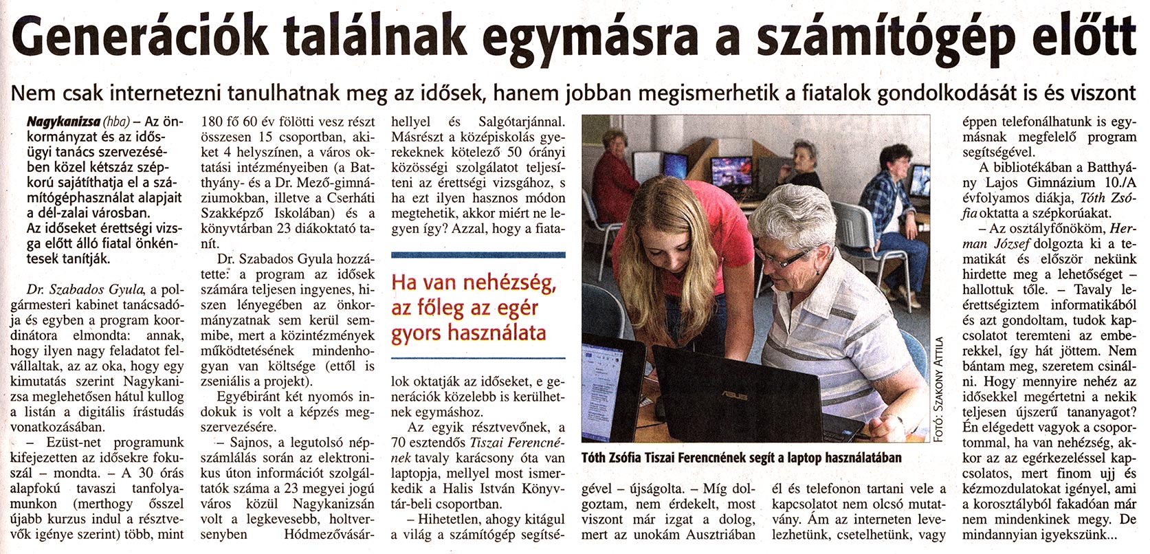 Nyilvános 1960 | 3711 | Zalai Hírlap 2014 04 16 089sz 05old - Generációk találnak egymásra a számítógép előtt | A cikk szövege: Generációk találnak egymásra a számítógép eló'tt Nem csak internetezni tanulhatnak meg az idősek, hanem jobban megismerhetik a fiatalok gondolkodását is és viszont Nagykanizsa (hba) - Az önkormányzat és az idősügyi tanács szervezésében közel kétszáz szépkorú sajátíthatja el a számítógéphasználat alapjait a dél-zalai városban. Az időseket érettségi vizsga előtt álló fiatal önkéntesek tanítják. Dr. Szabados Gyula, a polgármesteri kabinet tanácsadója és egyben a program koordinátora elmondta; annak, hogy ilyen nagy feladatot felvállaltak, az az oka, hogy egy kimutatás szerint Nagykanizsa meglehetősen hátul kuilog a listán a digitális írástudás vonatkozásában. - Eziist-nei programunk kifejezetten az idősekre fókuszál - mondta. - A 30 órás alapfokú tavaszi tanfolyamunkon (merthogy ősszel újabb kurzus indul a résztvevők igénye szerint) több, mint 180 fő 60 év fölötti vesz részt összesen 15 csoportban, akiket 4 helyszínen, a város oktatási intézményeiben (a Batthyány- és a Dr. Mező-gimnáziumokban, illetve a Cserháti Szakképző Iskolában) és a könyvtárban 23 diákoktató ta- Dr. Szabados Gyula hozzátette:' a program az idősek számára teljesen ingyenes, hiszen lényegében az Önkormányzatnak sem kerül semmibe, mert a közintézmények működtetésének mindenhogyan van költsége (ettől is zseniális a projekt). Egyébiránt két nyomós indokuk is volt a képzés megszervezésére. - Sajnos, a legutolsó népszámlálás során az elektronikus úton információt szolgáltatók száma a 23 megyei jogú város közül Nagykanizsán volt a legkevesebb, holtversenyben Hódmezővásár- hellyel és Salgótarjánnal. Másrészt a középiskolás gyerekeknek kötelező 50 órányi közösségi szolgálatot teljesíteni az érettségi vizsgához, s ha ezt ilyen hasznos módon megtehetik, akkor miért ne legyen így? Azzal, hogy a fiata- Ha van nehézség, az főleg az egér gyors használata lok oktatják az időseket, e generációk közelebb is kerülhetnek egymáshoz. Az egyik résztvevőnek, a 70 esztendős Tiszai Ferencné-nek tavaly karácsony óta van laptopja, mellyel most ismerkedik a Haiis István Könyv-tár-beli csoportban. - Hihetetlen, ahogy kitágul a világ a számítógép segítse- Tóth Zsófia Tiszai Ferencnének segít a laptop használatában gével - újságolta. - Míg dolgoztam, nem érdekelt, most viszont már izgat a dolog, mert az unokám Ausztriában él és telefonon tartani vele a kapcsolatot nem olcsó mutatvány. Ám az interneten levelezhetünk, csetelhetünk, vagy éppen telefonálhatunk is egymásnak megfelelő program segítségével. A bibliotékában a Batthyány Lajos Gimnázium 10./A évfolyamos diákja, Tóth Zsó-fia oktatta a szépicorúakat. - Az osztályfőnököm, Hermán József dolgozta ki a tematikát és először nekünk hirdette meg a lehetőséget -hallottuk tőle. - Tavaly leérettségiztem informatikából és azt gondoltam, tudok kapcsolatot teremteni az emberekkel, így hát jöttem. Nem bántam meg, szeretem csinálni. Hogy mennyire nehéz az idősekkel megértetni a nekik teljesen újszerű tananyagot? Én elégedett vagyok a csoportommal, ha van nehézség, akkor az az egérkezeléssel kapcsolatos, mert finom ujj és kézmozdulatokat igényel, ami a korosztályból fakadóan már nem mindenkinek megy. De mindannyian igyekszünk... |