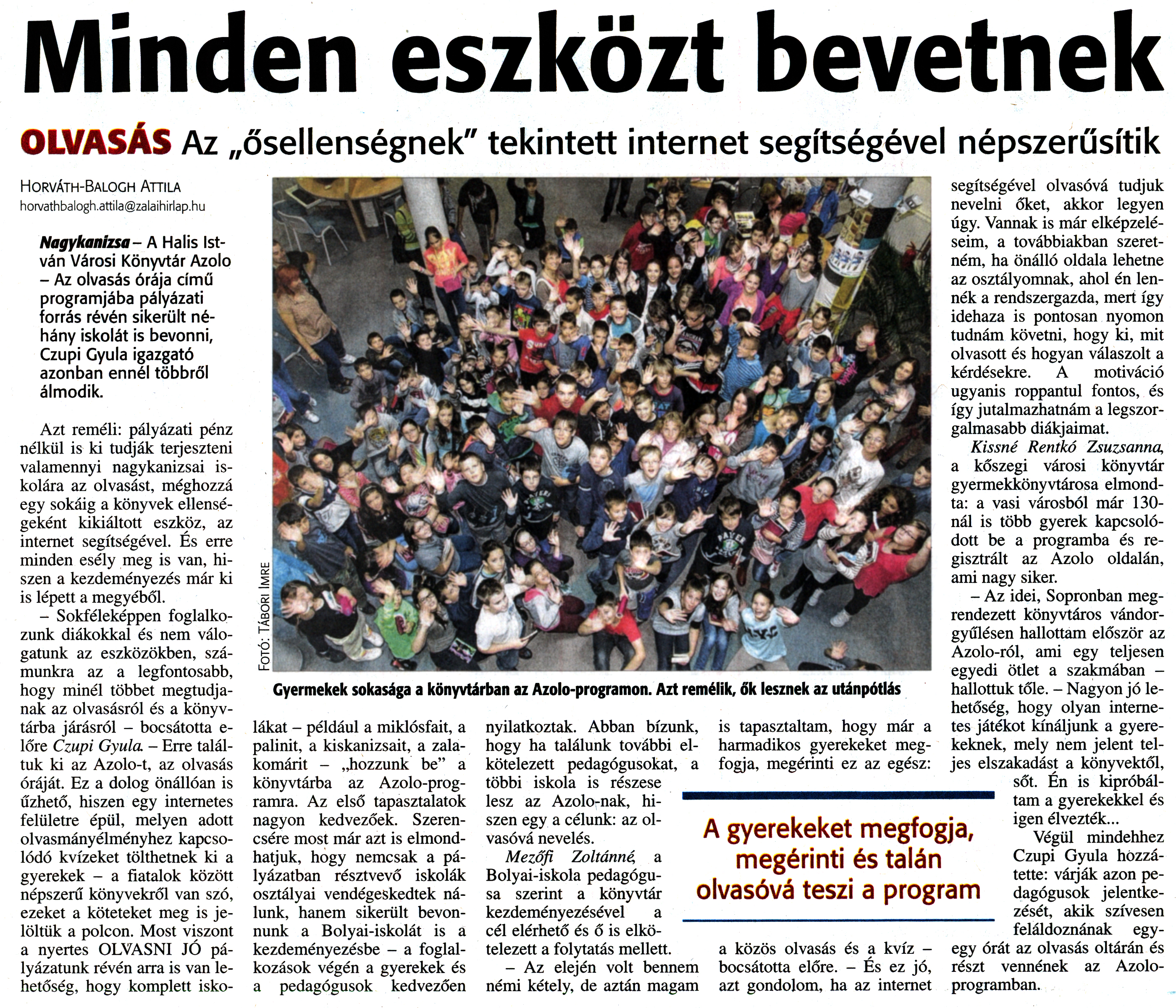 Nyilvános 1880 | 3633 | Zalai Hírlap 2014. november 19. 269. szám 7. oldal - Minden eszközt bevetnek | Minden eszközt bevetnek OLVASÁS Az „ősellenségnek" tekintett internet segítségével népszerűsítik A gyerekeket megfogja, megérinti és talán olvasóvá teszi a program Gyermekek sokasága a könyvtárban az Azolo-programon. Azt remélik, ők lesznek az utánpótlás Horváth-Balogh Attila horvathbalogh.attila@zalaihirlap.hu Nagykanizsa- A Halis István Városi Könyvtár Azolo - Az olvasás órája című programjába pályázati forrás révén sikerült néhány iskolát is bevonni, Czupi Gyula igazgató azonban ennél többről álmodik. Azt reméli: pályázati pénz nélkül is ki tudják terjeszteni valamennyi nagykanizsai iskolára az olvasást, méghozzá egy sokáig a könyvek ellenségeként kikiáltott eszköz, az internet segítségével. És erre minden esély meg is van, hiszen a kezdeményezés már ki is lépett a megyéből. - Sokféleképpen foglalkozunk diákokkal és nem válogatunk az eszközökben, számunkra az a legfontosabb, hogy minél többet megtudjanak az olvasásról és a könyvtárba járásról - bocsátotta e-lőre Czupi Gyula - Erre találtuk ki az Azolo-t, az olvasás óráját. Ez a dolog önállóan is űzhető, hiszen egy internetes felületre épül, melyen adott olvasmányélményhez kapcsolódó kvízeket tölthetnek ki a gyerekek - a fiatalok között népszerű könyvekről van szó, ezeket a köteteket meg is jelöltük a polcon. Most viszont a nyertes OLVASNI JÓ pályázatunk révén arra is van lehetőség, hogy komplett iskolákat - például a miklósfait, a palinit, a kiskanizsait, a zalakomárit - „hozzunk be" a könyvtárba az Azolo-programra. Az első tapasztalatok nagyon kedvezőek. Szerencsére most már azt is elmondhatjuk, hogy nemcsak a pályázatban résztvevő iskolák osztályai vendégeskedtek nálunk, hanem sikerült bevonnunk a Bolyai-iskolát is a kezdeményezésbe - a foglalkozások végén a gyerekek és a pedagógusok kedvezően nyilatkoztak. Abban bízunk, hogy ha találunk további elkötelezett pedagógusokat, a többi iskola is részese lesz az Azolo-nak, hiszen egy a célunk: az olvasóvá nevelés. Mezőfi Zoltánné, a Bolyai-iskola pedagógusa szerint a könyvtár kezdeményezésével a cél elérhető és ő is elkötelezett a folytatás mellett. - Az elején volt bennem némi kétely, de aztán magam is tapasztaltam, hogy már a harmadikos gyerekeket megfogja, megérinti ez az egész: a közös olvasás és a kvíz -bocsátotta előre. - És ez jó, azt gondolom, ha az internet segítségével olvasóvá tudjuk nevelni őket, akkor legyen úgy. Vannak is már elképzeléseim, a továbbiakban szeretném, ha önálló oldala lehetne az osztályomnak, ahol én lennék a rendszergazda, mert így idehaza is pontosan nyomon tudnám követni, hogy ki, mit olvasott és hogyan válaszolt a kérdésekre. A motiváció ugyanis roppantul fontos, és így jutalmazhatnám a legszorgalmasabb diákjaimat. Kissné Rentkó Zsuzsanna a kőszegi városi könyvtár gyermekkönyvtárosa elmondta: a vasi városból már 130-nál is több gyerek kapcsolódott be a programba és regisztrált az Azolo oldalán, ami nagy siker. - Az idei, Sopronban megrendezett könyvtáros vándorgyűlésen hallottam először az Azolo-ról, ami egy teljesen egyedi ötlet a szakmában -hallottuk tőle. - Nagyon jó lehetőség, hogy olyan internetes játékot kínáljunk a gyerekeknek, mely nem jelent teljes elszakadást a könyvektől, sőt. Én is kipróbáltam a gyerekekkel és igen élvezték... Végül mindehhez Czupi Gyula hozzátette: várják azon pedagógusok jelentkezését, akik szívesen feláldoznának egy-egy órát az olvasás oltárán és részt vennének az Azolo-programban. |