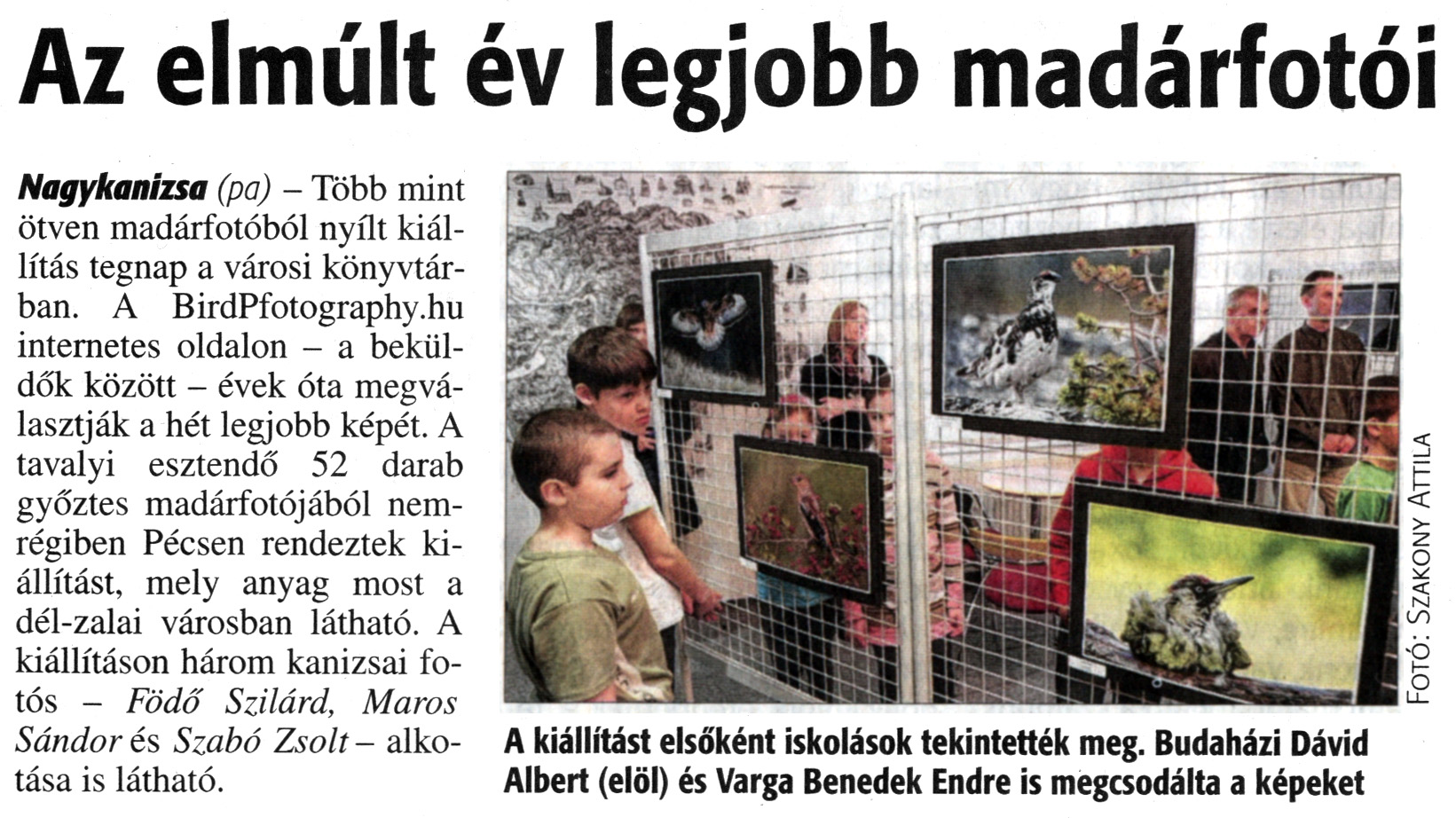 Nyilvános 1425 | 3035 | Zalai Hírlap 2015. március 10. 58. szám 3. oldal - Az elmúlt év legjobb madárfotói | Az elmúlt év legjobb madárfotói Nagykanizsa (pa) - Több mint ötven madárfotóból nyílt kiállítás tegnap a városi könyvtárban. A BirdPfotography.hu internetes oldalon - a beküldők között - évek óta megválasztják a hét legjobb képét. A tavalyi esztendő 52 darab győztes madárfotójából nemrégiben Pécsen rendeztek kiállítást, mely anyag most a dél-zalai városban látható. A kiállításon három kanizsai fotós - Födő Szilárd, Maros Sándor és Szabó Zsolt - alkotása is látható. A kiállítást elsőként iskolások tekintették meg. Budaházi Dávid Albert (elöl) és Varga Benedek Endre is megcsodálta a képeket |