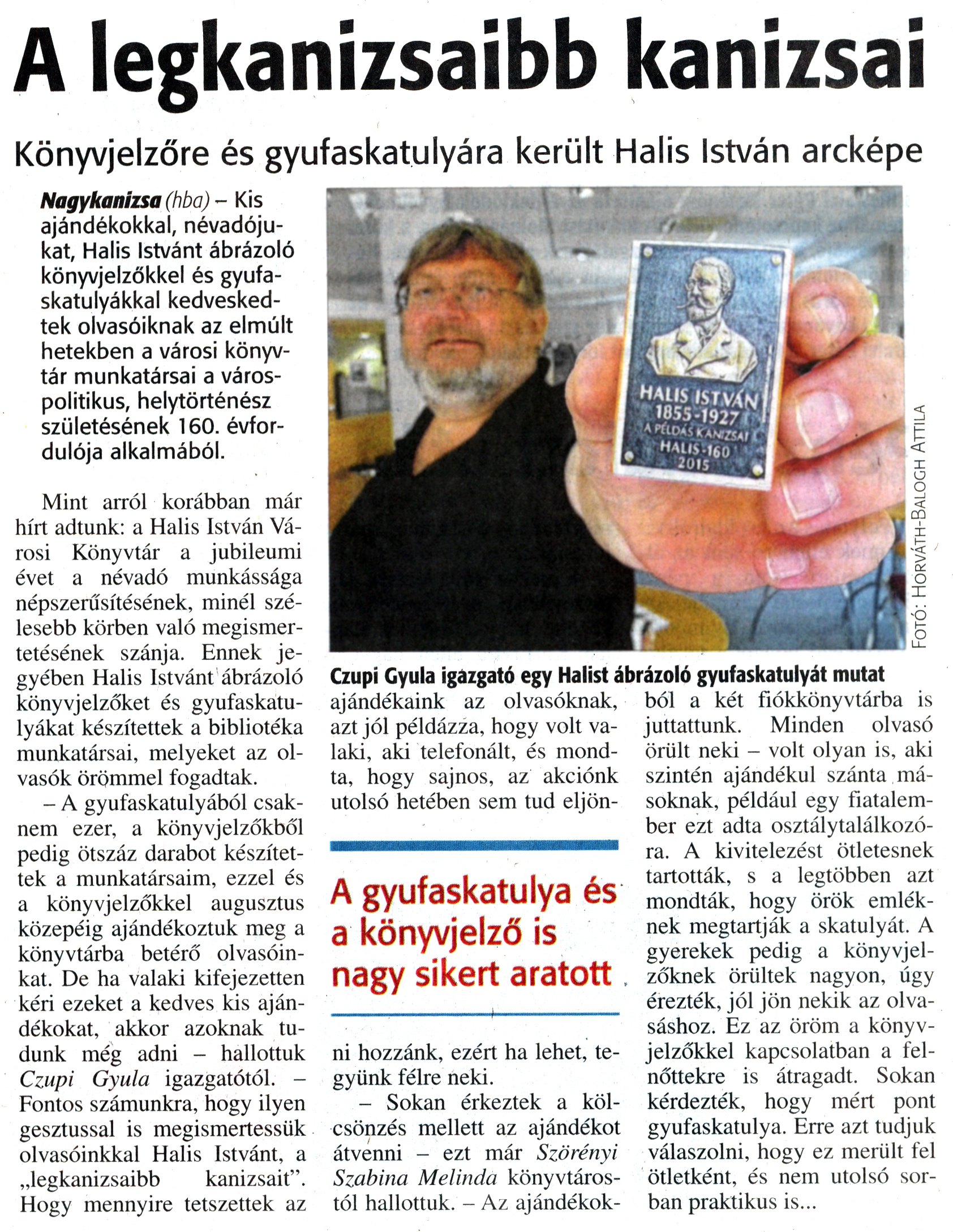 Nyilvános 1590 | 3315 | Zalai Hírlap 2015. szeptember 10. 212. szám 4. oldal | A legkanizsaibb kanizsai Könyvjelzőre és gyufaskatulyára került Halis István arcképe Czupi Gyula igazgató egy Halist ábrázoló gyufaskatulyát mutat A gyufaskatulya és a könyvjelző is nagy sikert aratott Nagykanizsa (hba) - Kis ajándékokkal, névadójukat, Halis Istvánt ábrázoló könyvjelzőkkel és gyufaskatulyákkal kedveskedtek olvasóiknak az elmúlt hetekben a városi könyvtár munkatársai a várospolitikus, helytörténész születésének 160. évfordulója alkalmából. Mint arról korábban már hírt adtunk: a Halis István Városi Könyvtár a jubileumi évet a névadó munkássága népszerűsítésének, minél szélesebb körben való megismertetésének szánja. Ennek jegyében Halis Istvánt ábrázoló könyvjelzőket és gyufaskatulyákat készítettek a bibliotéka munkatársai, melyeket az olvasók örömmel fogadtak. - A gyufaskatulyából csaknem ezer, a könyvjelzőkből pedig ötszáz darabot készítettek a munkatársaim, ezzel és a könyvjelzőkkel augusztus közepéig ajándékoztuk meg a könyvtárba betérő olvasóinkat. De ha valaki kifejezetten kéri ezeket a kedves kis ajándékokat, akkor azoknak tudunk még adni - hallottuk Czupi Gyula igazgatótól. -Fontos számunkra, hogy ilyen gesztussal is megismertessük olvasóinkkal Halis Istvánt, a „legkanizsaibb kanizsait". Hogy mennyire tetszettek az ajándékaink az olvasóknak, azt jól példázza, hogy volt valaki, aki telefonált, és mondta, hogy sajnos, az akciónk utolsó hetében sem tud eljönni hozzánk, ezért ha lehet, tegyünk félre neki. - Sokan érkeztek a kölcsönzés mellett az ajándékot átvenni - ezt már Szörényi Szabina Melinda könyvtárostól hallottuk. - Az ajándékok- ból a két fiókkönyvtárba is juttattunk. Minden olvasó Örült neki - volt olyan is, aki szintén ajándékul szánta másoknak, például egy fiatalember ezt adta osztálytalálkozóra. A kivitelezést ötletesnek tartották, s a legtöbben azt mondták, hogy örök emléknek megtartják a skatulyát. A gyerekek pedig a könyvjelzőknek örültek nagyon, úgy érezték, jól jön nekik az olvasáshoz. Ez az öröm a könyvjelzőkkel kapcsolatban a felnőttekre is átragadt. Sokan kérdezték, hogy mért pont gyufaskatulya. Erre azt tudjuk válaszolni, hogy ez merült fel ötletként, és nem utolsó sorban praktikus is... |