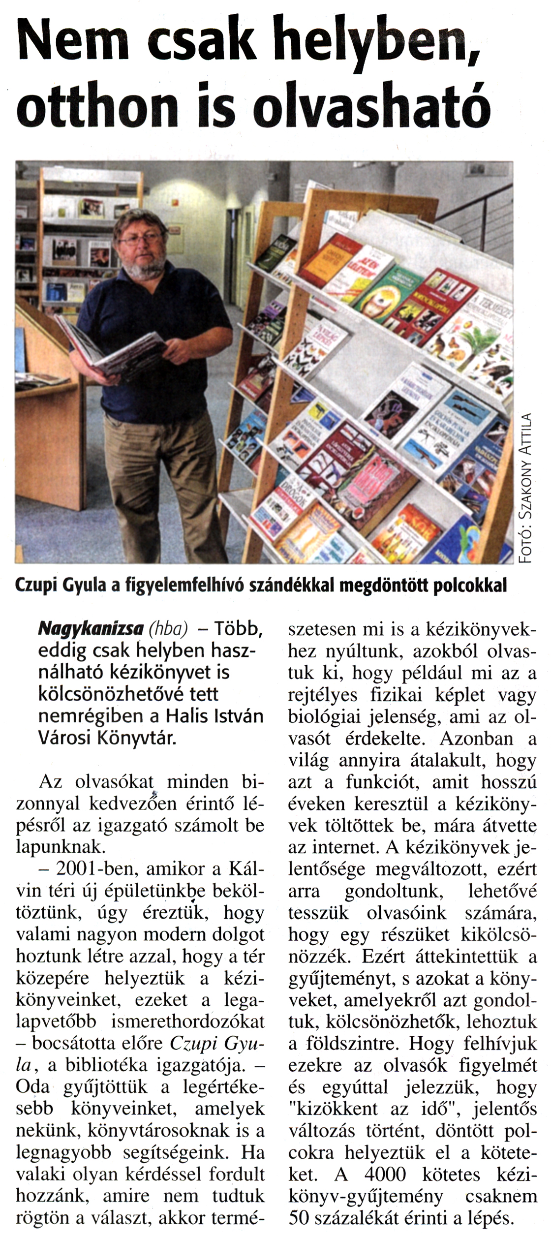 Nyilvános 2000 | 3763 | Zalai Hírlap 2015. december 8. 287. szám 5. oldal | Nem csak helyben, otthon is olvasható Czupi Gyula a figyelemfelhívó szándékkal megdöntött polcokkal Nagykanizsa (hba) - Több, eddig csak helyben használható kézikönyvet is kölcsönözhetővé tett nemrégiben a Halis István Városi Könyvtár. Az olvasókat minden bizonnyal kedvezően érintő lépésről az igazgató számolt be lapunknak. - 2001-ben, amikor a Kálvin téri új épületünkbe beköltöztünk, úgy éreztük, hogy valami nagyon modern dolgot hoztunk létre azzal, hogy a tér közepére helyeztük a kézikönyveinket, ezeket a legalapvetőbb ismerethordozókat - bocsátotta előre Czupi Gyula, a bibliotéka igazgatója. -Oda gyűjtöttük a legértékesebb könyveinket, amelyek nekünk, könyvtárosoknak is a legnagyobb segítségeink. Ha valaki olyan kérdéssel fordult hozzánk, amire nem tudtuk rögtön a választ, akkor természetesen mi is a kézikönyvekhez nyúltunk, azokból olvastuk ki, hogy például mi az a rejtélyes fizikai képlet vagy biológiai jelenség, ami az olvasót érdekelte. Azonban a világ annyira átalakult, hogy azt a funkciót, amit hosszú éveken keresztül a kézikönyvek töltöttek be, mára átvette az internet. A kézikönyvek jelentősége megváltozott, ezért arra gondoltunk, lehetővé tesszük olvasóink számára, hogy egy részüket kikölcsönözzék. Ezért áttekintettük a gyűjteményt, s azokat a könyveket, amelyekről azt gondoltuk, kölcsönözhetők, lehoztuk a földszintre. Hogy felhívjuk ezekre az olvasók figyelmét és egyúttal jelezzük, hogy "kizökkent az idő", jelentős változás történt, döntött polcokra helyeztük el a köteteket. A 4000 kötetes kézikönyv-gyűjtemény csaknem 50 százalékát érinti a lépés. |