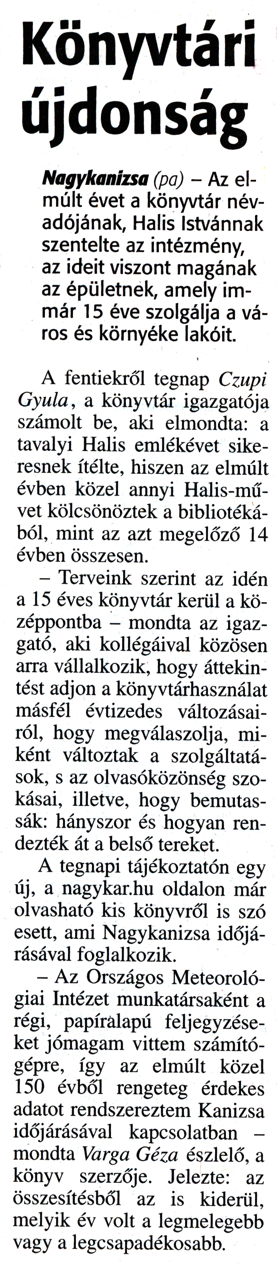 Nyilvános 1760 | 3608 | Zalai Hírlap 2016. január 6. 4. szám 3. oldal - Könyvtári újdonság | Könyvtári újdonság Nagykanizsa (pa) - Az elmúlt évet a könyvtár névadójának, Halis Istvánnak szentelte az intézmény, az ideit viszont magának az épületnek, amely immár 15 éve szolgálja a város és környéke lakóit. A fentiekről tegnap Czupi Gyula, a könyvtár igazgatója számolt be, aki elmondta: a tavalyi Halis emlékévet sikeresnek ítélte, hiszen az elmúlt évben közel annyi Halis-művet kölcsönöztek a bibliotékából, mint az azt megelőző 14 évben összesen. - Terveink szerint az idén a 15 éves könyvtár kerül a középpontba - mondta az igazgató, aki kollégáival közösen arra vállalkozik, hogy áttekintést adjon a könyvtárhasználat másfél évtizedes változásairól, hogy megválaszolja, miként változtak a szolgáltatások, s az olvasóközönség szokásai, illetve, hogy bemutassák: hányszor és hogyan rendezték át a belső tereket. A tegnapi tájékoztatón egy új, a nagykar.hu oldalon már olvasható kis könyvről is szó esett, ami Nagykanizsa időjárásával foglalkozik. - Az Országos Meteorológiai Intézet munkatársaként a régi, papíralapú feljegyzéseket jómagam vittem számítógépre, így az elmúlt közel 150 évből rengeteg érdekes adatot rendszereztem Kanizsa időjárásával kapcsolatban - mondta Varga Géza észlelő, a könyv szerzője. Jelezte: az összesítésből az is kiderül, melyik év volt a legmelegebb vagy a legcsapadékosabb. |