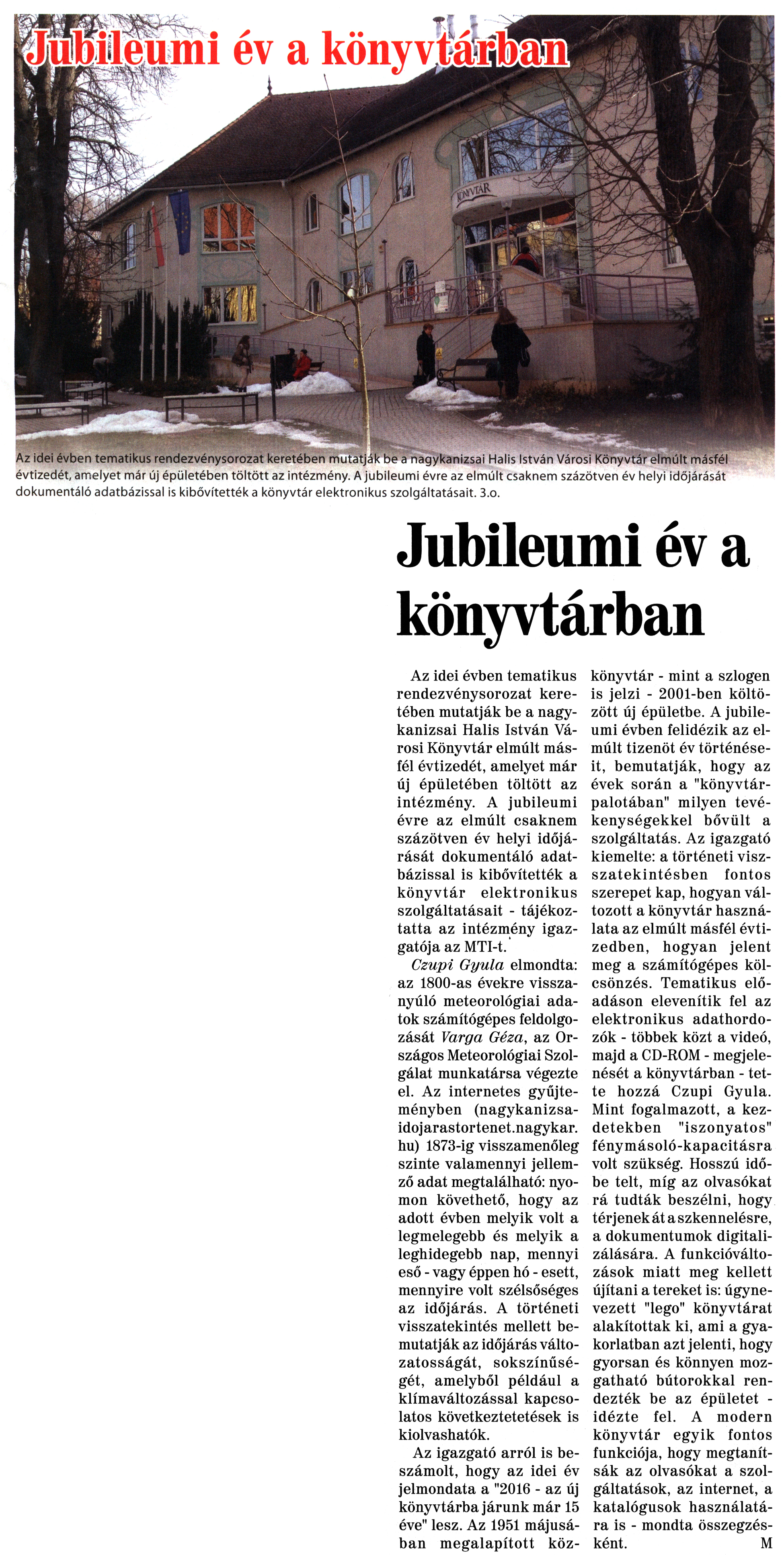 Nyilvános 1857 | 3753 | Nagykanizsai Maraton 2016. január 15. 2. szám 1, 3. oldal | Jubileumi év a könyvtárban Az idei évben tematikus rendezvénysorozat keretében mutatják be a nagykanizsai Halis István Városi Könyvtár elmúlt másfél évtizedét, amelyet már új épületében töltött az intézmény. A jubileumi évre az elmúlt csaknem százötven év helyi időjárását dokumentáló adatbázissal is kibővítették a könyvtár elektronikus szolgáltatásait. 3.o. Jubileumi év a könyvtárban Az idei évben tematikus rendezvénysorozat keretében mutatják be a nagykanizsai Halis István Városi Könyvtár elmúlt másfél évtizedét, amelyet már új épületében töltött az intézmény. A jubileumi évre az elmúlt csaknem százötven év helyi időjárását dokumentáló adatbázissal is kibővítették a könyvtár elektronikus szolgáltatásait - tájékoztatta az intézmény igazgatója az MTI-t. Czupi Gyula elmondta: az 1800-as évekre visszanyúló meteorológiai adatok számítógépes feldolgozását Varga Géza, az Országos Meteorológiai Szolgálat munkatársa végezte el. Az internetes gyűjteményben (nagykanizsaidojarastortenet.nagykar.hu) 1873-ig visszamenőleg szinte valamennyi jellemző adat megtalálható: nyomon követhető, hogy az adott évben melyik volt a legmelegebb és melyik a leghidegebb nap, mennyi eső - vagy éppen hó - esett, mennyire volt szélsőséges az időjárás. A történeti visszatekintés mellett bemutatják az időjárás változatosságát, sokszínűségét, amelyből például a klímaváltozással kapcsolatos következtetetések is kiolvashatók. Az igazgató arról is beszámolt, hogy az idei év jelmondata a "2016 - az új könyvtárba járunk már 15 éve" lesz. Az 1951 májusában megalapított közkönyvtár - mint a szlogen is jelzi - 2001-ben költözött új épületbe. A jubileumi évben felidézik az elmúlt tizenöt év történéseit, bemutatják, hogy az évek során a "könyvtárpalotában" milyen tevékenységekkel bővült a szolgáltatás. Az igazgató kiemelte: a történeti visszatekintésben fontos szerepet kap, hogyan változott a könyvtár használata az elmúlt másfél évtizedben, hogyan jelent meg a számítógépes kölcsönzés. Tematikus előadáson elevenítik fel az elektronikus adathordozók - többek közt a videó, majd a CD-ROM - megjelenését a könyvtárban - tette hozzá Czupi Gyula. Mint fogalmazott, a kezdetekben "iszonyatos" fénymásoló-kapacitásra volt szükség. Hosszú időbe telt, míg az olvasókat rá tudták beszélni, hogy térjenek át a szkennelésre, a dokumentumok digitalizálására. A funkcióváltozások miatt meg kellett újítani a tereket is: úgynevezett "lego" könyvtárat alakítottak ki, ami a gyakorlatban azt jelenti, hogy gyorsan és könnyen mozgatható bútorokkal rendezték be az épületet -idézte fel. A modern könyvtár egyik fontos funkciója, hogy megtanítsák az olvasókat a szolgáltatások, az internet, a katalógusok használatára is - mondta összegzésként. M |