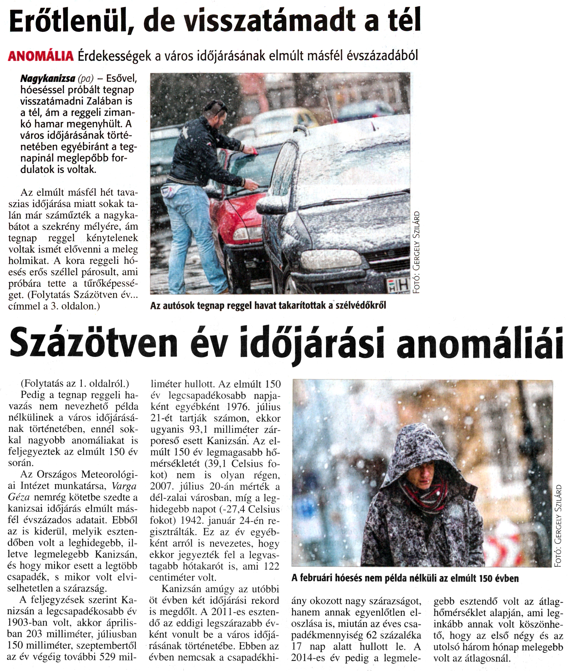 Nyilvános 1627 | 3016 | Zalai Hírlap 2016. február 11. 035. szám 1, 3. oldal | Erőtlenül, de visszatámadt a tél ANOMÁLIA Érdekességek a város időjárásának elmúlt másfél évszázadából Nagykanizsa (pa) - Esővel, hóeséssel próbált tegnap visszatámadni Zalában is a tél, ám a reggeli zimankó hamar megenyhült. A város időjárásának történetében egyébiránt a tegnapinál meglepőbb fordulatok is voltak. Az elmúlt másfél hét tavaszias időjárása miatt sokak talán már száműzték a nagykabátot a szekrény mélyére, ám tegnap reggel kénytelenek voltak ismét elővenni a meleg holmikat. A kora reggeli hóesés erős széllel párosult, ami próbára tette a tűrőképességet. (Folytatás Százötven év... címmel a 3. oldalon.) Az autósok tegnap reggel havat takarítottak a szélvédőkről Százötven év időjárási anomáliái (Folytatás az 1. oldalról.) Pedig a tegnap reggeli havazás nem nevezhető példa nélkülinek a város időjárásának történetében, ennél sokkal nagyobb anomáliakat is feljegyeztek az elmúlt 150 év során. Az Országos Meteorológiai Intézet munkatársa, Varga Géza nemrég kötetbe szedte a kanizsai időjárás elmúlt másfél évszázados adatait. Ebből az is kiderül, melyik esztendőben volt a leghidegebb, illetve legmelegebb Kanizsán, és hogy mikor esett a legtöbb csapadék, s mikor volt elviselhetetlen a szárazság. A feljegyzések szerint Kanizsán a legcsapadékosabb év 1903-ban volt, akkor áprilisban 203 milliméter, júliusban 150 milliméter, szeptembertől az év végéig további 529 milliméter hullott. Az elmúlt 150 év legcsapadékosabb napjaként egyébként 1976. július 21-ét tartják számon, ekkor ugyanis 93,1 milliméter zárporeső esett Kanizsán. Az elmúlt 150 év legmagasabb hőmérsékletét (39,1 Celsius fokot) nem is olyan régen, 2007. július 20-án mérték a dél-zalai városban, míg a leghidegebb napot (-27,4 Celsius fokot) 1942. január 24-én regisztrálták. Ez az év egyébként arról is nevezetes, hogy ekkor jegyezték fel a legvastagabb hótakarót is, ami 122 centiméter volt. Kanizsán amúgy az utóbbi öt évben két időjárási rekord is megdőlt. A 2011-es esztendő az eddigi legszárazabb évként vonult be a város időjárásának történetébe. Ebben az évben nemcsak a csapadékhiány okozott nagy szárazságot, hanem annak egyenlőtlen eloszlása is, miután az éves csapadékmennyiség 62 százaléka 17 nap alatt hullott le. A 2014-es év pedig a legmelegebb esztendő volt az átlaghőmérséklet alapján, ami leginkább annak volt köszönhető, hogy az első négy és az utolsó három hónap melegebb volt az átlagosnál. |