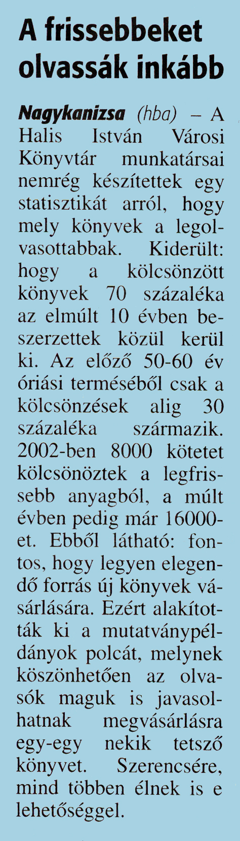 Nyilvános 1800 | 3407 | Zalai Hírlap 2016. február 15. 38. szám 4. oldal | A frissebbeket olvassák inkább Nagykanizsa (hba) - A Halis István Városi Könyvtár munkatársai nemrég készítettek egy statisztikát arról, hogy mely könyvek a legolvasottabbak. Kiderült: hogy a kölcsönzött könyvek 70 százaléka az elmúlt 10 évben beszerzettek közül kerül ki. Az előző 50-60 év óriási terméséből csak a kölcsönzések alig 30 százaléka származik. 2002-ben 8000 kötetet kölcsönöztek a legfrissebb anyagból, a múlt évben pedig már 16000-et. Ebből látható: fontos, hogy legyen elegendő forrás új könyvek vásárlására. Ezért alakították ki a mutatványpéldányok polcát, melynek köszönhetően az olvasók maguk is javasolhatnak megvásárlásra egy-egy nekik tetsző könyvet. Szerencsére, mind többen élnek is e lehetőséggel. |