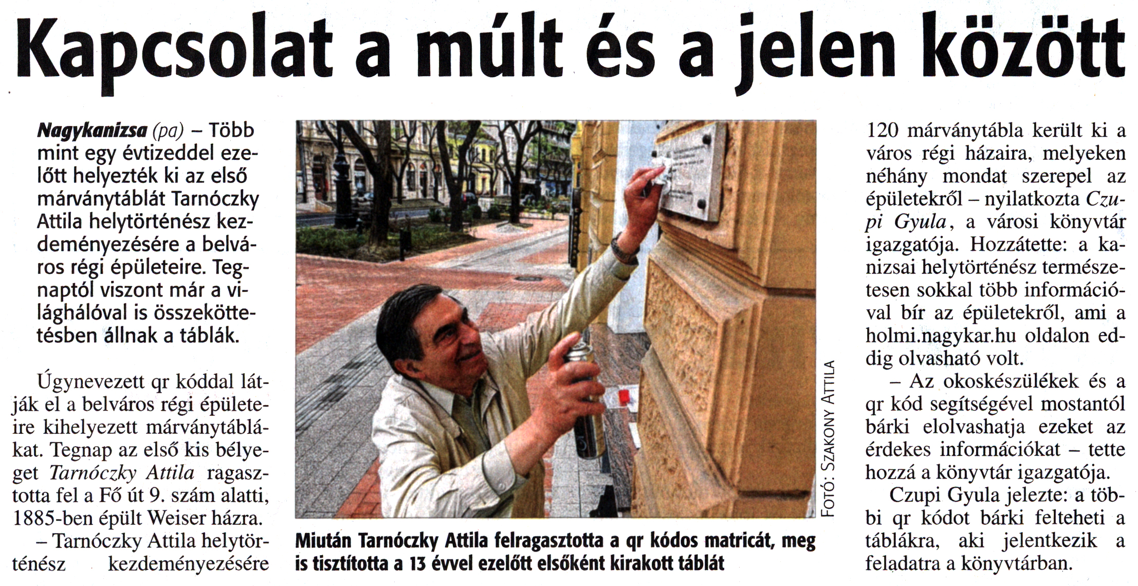 Nyilvános 1581 | 2778 | Zalai Hírlap 2016. április 15. 72. szám 2. oldal | Kapcsolat a múlt és a jelen között Nagykanizsa (pa) - Több mint egy évtizeddel ezelőtt helyezték ki az első márványtáblát Tarnóczky Attila helytörténész kezdeményezésére a belváros régi épületeire. Tegnaptól viszont már a világhálóval is összeköttetésben állnak a táblák. Úgynevezett qr kóddal látják el a belváros régi épületeire kihelyezett márványtáblákat. Tegnap az első kis bélyeget Tarnóczky Attila ragasztotta fel a Fő út 9. szám alatti, 1885-ben épült Weiser házra. - Tarnóczky Attila helytörténész kezdeményezésére Miután Tarnóczky Attila felragasztotta a qr kódos matricát, meg is tisztította a 13 évvel ezelőtt elsőként kirakott táblát 120 márványtábla került ki a város régi házaira, melyeken néhány mondat szerepel az épületekről - nyilatkozta Czupi Gyula, a városi könyvtár igazgatója. Hozzátette: a kanizsai helytörténész természetesen sokkal több információval bír az épületekről, ami a holmi.nagykar.hu oldalon eddig olvasható volt. - Az okoskészülékek és a qr kód segítségével mostantól bárki elolvashatja ezeket az érdekes információkat - tette hozzá a könyvtár igazgatója. Czupi Gyula jelezte: a többi qr kódot bárki felteheti a táblákra, aki jelentkezik a feladatra a könyvtárban. |