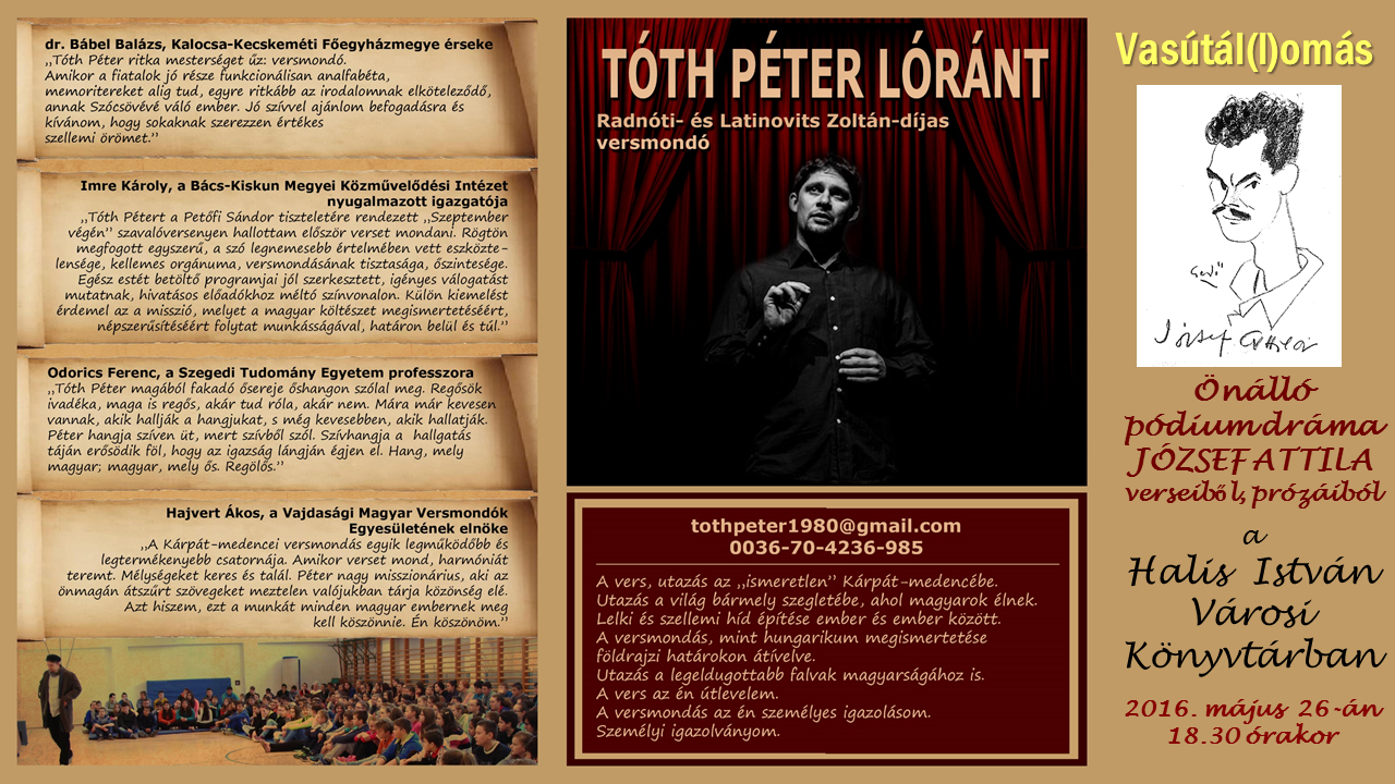 Nyilvános 1615 | 3106 | József Attila est a Halis István Városi Könyvtárban | Aki már látta, újra akarja látni, aki még nem, sajnálja, hogy eddig nem volt lehetősége rá. Így vannak az emberek Tóth Péter Radnóti-díjas előadó VASÚT ÁL(L)OMÁS című pódium-drámájával, melynek megismételt kanizsai előadására 2016. május 26-án 18.30 órakor kerül sor a könyvtárban. Egy ember (jelesül József Attila) megérkezik egy vasútállomásra. Utazik valahová, mert mint minden igaz költőnek, neki is ÚTJA VAN. Amíg várakozik a vonatra, szóba elegyedik a többi utassal (ez esetben a közönséggel). A vonat – mint Magyarországon általában – késik. Így a költőnek bőven van ideje mesélni, elgondolkodni álmairól, vágyairól, életéről, hitéről, édesanyjáról, gyermekkoráról, egyetemi nekibuzdulásáról, az országról, az emberekről, Európáról. Mindezt rendkívüli átéléssel, hittel, lelki áradással. Mindenkit szeretettel várunk. |