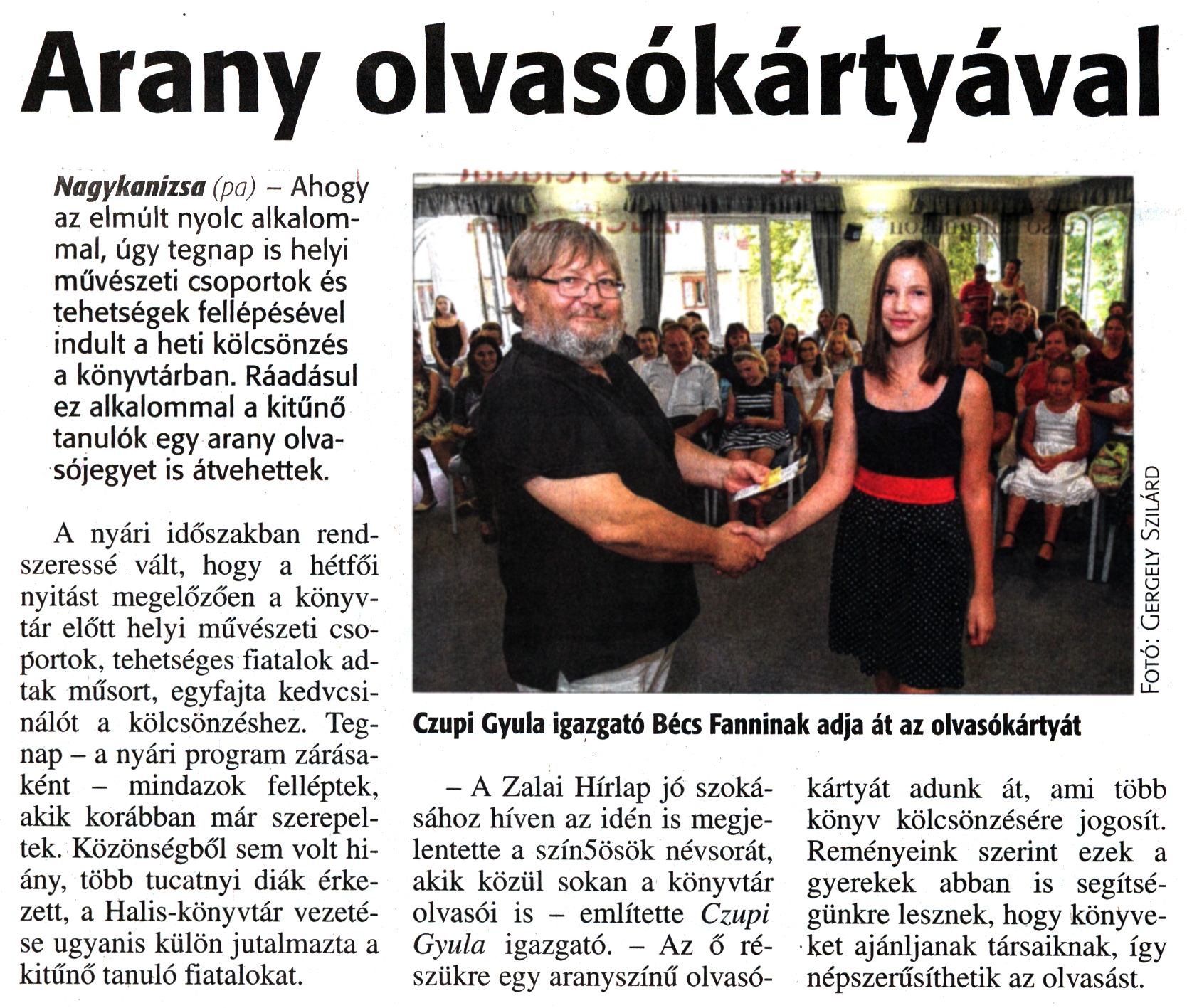 Nyilvános 1608 | 2874 | Zalai Hírlap 2016. augusztus 30. 203. szám 3. oldal | Arany olvasókártyával Nagykanizsa (pa) - Ahogy az elmúlt nyolc alkalommal, úgy tegnap is helyi művészeti csoportok és tehetségek fellépésével indult a heti kölcsönzés a könyvtárban. Ráadásul ez alkalommal a kitűnő tanulók egy arany olvasójegyet is átvehettek. A nyári időszakban rendszeressé vált, hogy a hétfői nyitást megelőzően a könyvtár előtt helyi művészeti csoportok, tehetséges fiatalok adtak műsort, egyfajta kedvcsinálót a kölcsönzéshez. Tegnap - a nyári program zárásaként - mindazok felléptek, akik korábban már szerepeltek. Közönségből sem volt hiány, több tucatnyi diák érkezett, a Halis-könyvtár vezetése ugyanis külön jutalmazta a kitűnő tanuló fiatalokat. Czupi Gyula igazgató Bécs Fanninak adja át az olvasókártyát - A Zalai Hírlap jó szokásához híven az idén is megjelentette a szín5ösök névsorát, akik közül sokan a könyvtár olvasói is - említette Czupi Gyula igazgató. - Az ő részükre egy aranyszínű olvasókártyát adunk át, ami több könyv kölcsönzésére jogosít. Reményeink szerint ezek a gyerekek abban is segítségünkre lesznek, hogy könyveket ajánljanak társaiknak, így népszerűsíthetik az olvasást. |