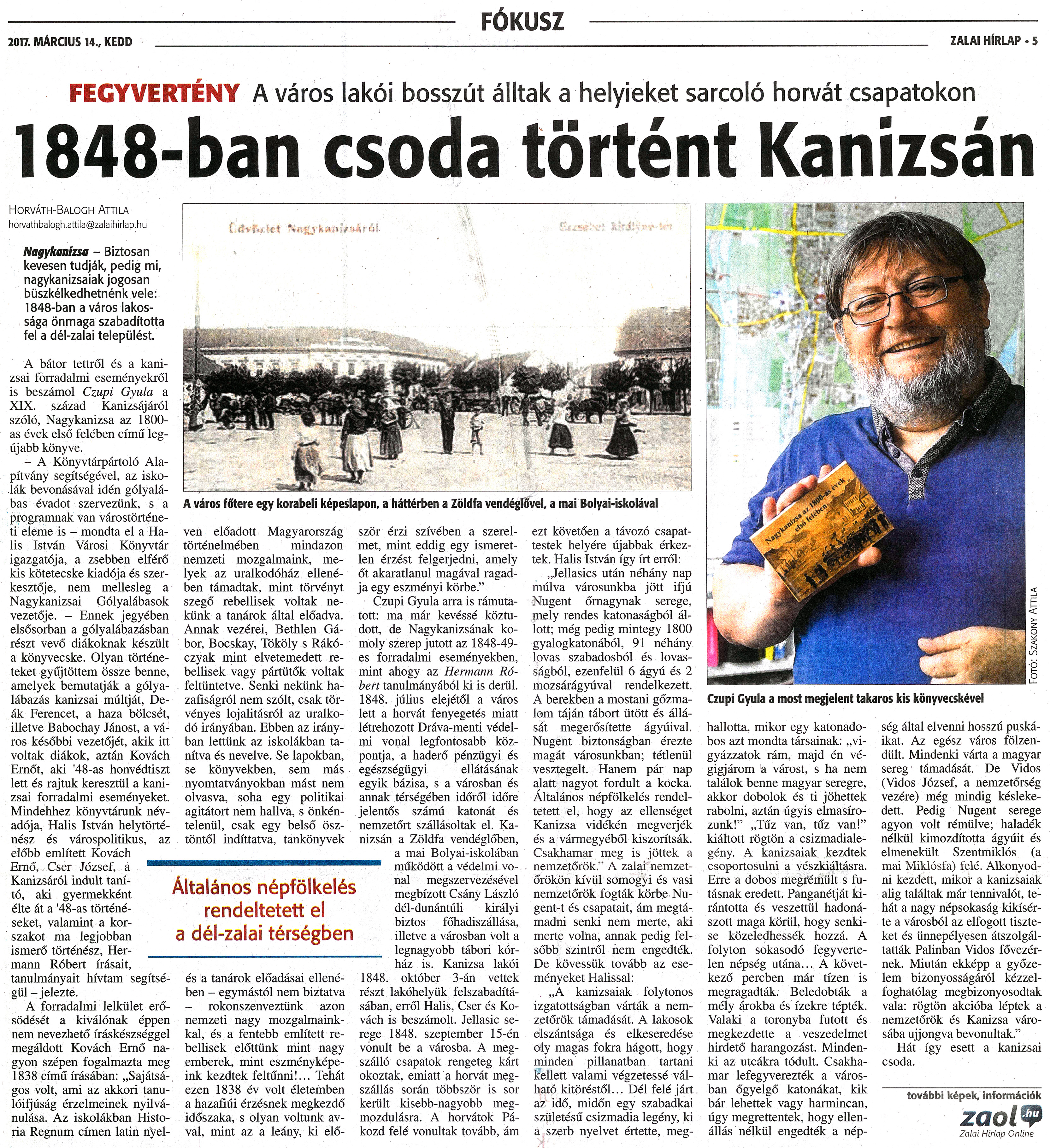 Nyilvános 1777 | 4228 | Zalai Hírlap 2017. március 14. 62. szám 5. oldal | FEGYVERTÉNY A város lakói bosszút álltak a helyieket sarcoló horvát csapatokon 1848-ban csoda történt Kanizsán Horváth-Balogh Attila horvathbalogh.attila@zalaihirlap.hu A bátor tettről és a kanizsai forradalmi eseményekről is beszámol Czupi Gyula a XIX. század Kanizsájáról szóló, Nagykanizsa az 1800-as évek első felében című legújabb könyve. - A Könyvtárpártoló Alapítvány segítségével, az iskolák bevonásával idén gólyalábas évadot szervezünk, s a programnak van várostörténeti eleme is - mondta el a Ha-lis István Városi Könyvtár igazgatója, a zsebben elférő kis kötetecske kiadója és szerkesztője, nem mellesleg a Nagykanizsai Gólyalábasok vezetője. - Ennek jegyében elsősorban a gólyalábazásban részt vevő diákoknak készült a könyvecske. Olyan történeteket gyűjtöttem össze benne, amelyek bemutatják a gólya-lábazás kanizsai múltját, Deák Ferencet, a haza bölcsét, illetve Babochay Jánost, a város későbbi vezetőjét, akik itt voltak diákok, aztán Kovách Ernőt, aki \'48-as honvédtiszt lett és rajtuk keresztül a kanizsai forradalmi eseményeket. Mindehhez könyvtárunk névadója, Halis István helytörténész és várospolitikus, az előbb említett Kovách Ernő, Cser József, a 1 Kanizsáról indult tanító, aki gyermekként élte át a \'48-as történéseket, valamint a korszakot ma legjobban ismerő történész, Hermann Róbert írásait, tanulmányait hívtam segítségül -jelezte. A forradalmi lelkület erősödését a kiválónak éppen nem nevezhető íráskészséggel megáldott Kovách Ernő nagyon szépen fogalmazta meg 1838 című írásában: „Sajátságos volt, ami az akkori tanulóifjúság érzelmeinek nyilvánulása. Az iskolákban História Regnum címen latin nyelven előadott Magyarország történelmében mindazon nemzeti mozgalmaink, melyek az uralkodóház ellenében támadtak, mint törvényt szegő rebellisek voltak nekünk a tanárok által előadva. Annak vezérei, Bethlen Gábor, Bocskay, Tököly s Rákóczyak mint elvetemedett rebellisek vagy pártütők voltak feltüntetve. Senki nekünk ha-zafiságról nem szólt, csak törvényes lojalitásról az uralkodó irányában. Ebben az irányban lettünk az iskolákban tanítva és nevelve. Se lapokban, se könyvekben, sem más nyomtatványokban mást nem olvasva, soha egy politikai agitátort nem hallva, s önkéntelenül, csak egy belső ösztöntől indíttatva, tankönyvek és a tanárok előadásai ellenében - egymástól nem biztatva - rokonszenveztünk azon nemzeti nagy mozgalmainkkal, és a fentebb említett rebellisek előttünk mint nagy emberek, mint eszményképeink kezdtek feltűnni!... Tehát ezen 1838 év volt életemben a hazafiúi érzésnek megkezdő időszaka, s olyan voltunk avval, mint az a leány, ki először érzi szívében a szerelmet, mint eddig egy ismeretlen érzést felgerjedni, amely őt akaratlanul magával ragadja egy eszményi körbe." Czupi Gyula arra is rámutatott: ma már kevéssé köztudott, de Nagykanizsának komoly szerep jutott az 1848-49-es forradalmi eseményekben, mint ahogy az Hermann Róbert tanulmányából ki is derül. 1848. július elejétől a város lett a horvát fenyegetés miatt létrehozott Dráva-menti védelmi vonal legfontosabb központja, a haderő pénzügyi és egészségügyi ellátásának egyik bázisa, s a városban és annak térségében időről időre jelentős számú katonát és nemzetőrt szállásoltak el. Kanizsán a Zöldfa vendéglőben, a mai Bolyai-iskolában működött a védelmi vonal megszervezésével megbízott Csány László dél-dunántúli királyi biztos főhadiszállása, illetve a városban Volt a legnagyobb tábori kórház is. Kanizsa lakói 1848. október 3-án vettek részt lakóhelyük felszabadításában, erről Halis, Cser és Kovách is beszámolt. Jellasic serege 1848. szeptember 15-én vonult be a városba. A megszálló csapatok rengeteg kárt okoztak, emiatt a horvát megszállás során többször is sor került kisebb-nagyobb megmozdulásra. A horvátok Pákozd felé vonultak tovább, ám ezt követően a távozó csapattestek helyére újabbak érkeztek. Halis István így írt erről: „Jellasics után néhány nap múlva városunkba jött ifjú Nugent őrnagynak serege, mely rendes katonaságból állott; még pedig mintegy 1800 gyalogkatonából, 91 néhány lovas szabadosból és lovasságból, ezenfelül 6 ágyú és 2 mozsárágyúval rendelkezett. A berekben a mostani gőzmalom táján tábort ütött és állását megerősítette ágyúival. Nugent biztonságban érezte magát városunkban; tétlenül vesztegelt. Hanem pár nap alatt nagyot fordult a kocka. Általános népfölkelés rendeltetett el, hogy az ellenséget Kanizsa vidékén megverjék és a vármegyéből kiszorítsák. Csakhamar meg is jöttek a nemzetőrök." A zalai nemzetőrökön kívül somogyi és vasi nemzetőrök fogták körbe Nugent-t és csapatait, ám megtámadni senki nem merte, aki merte volna, annak pedig felsőbb szintről nem engedték. De kövessük tovább az eseményeket Halissal: . „A kanizsaiak folytonos izgatottságban várták a nemzetőrök támadását. A lakosok elszántsága és elkeseredése oly magas fokra hágott, hogy minden pillanatban tartani kellett valami végzetessé válható kitöréstől... Dél felé járt az idő, midőn egy szabadkai születésű csizmadia legény, ki a szerb nyelvet értette, meg- hallotta, mikor egy katonadobos azt mondta társainak: „vigyázzatok rám, majd én végigjárom a várost, s ha nem találok benne magyar seregre, akkor dobolok és ti jöhettek rabolni, aztán úgyis elmasírozunk!" „Tűz van, tűz van!" kiáltott rögtön a csizmadialegény. A kanizsaiak kezdtek csoportosulni a vészkiáltásra. Erre a dobos megrémült s futásnak eredett. Panganétját kirántotta és ve