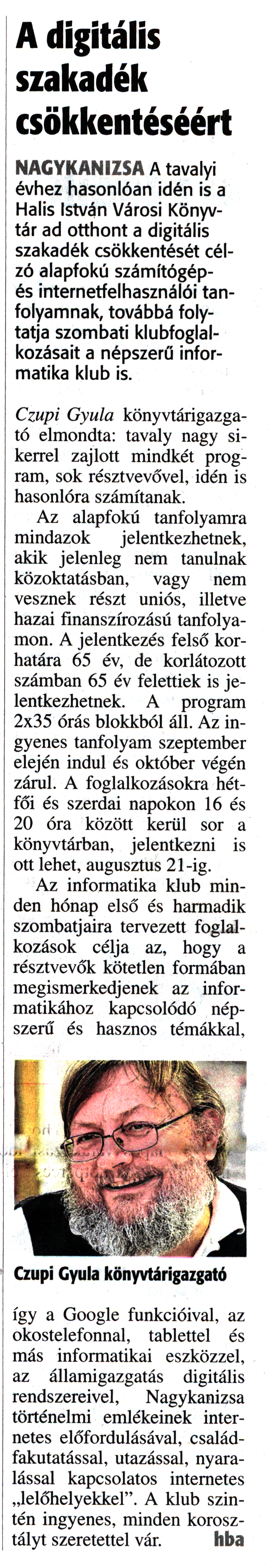Nyilvános 1680 | 3263 | Zalai Hírlap 2017. augusztus 10. 185. szám 4. oldal | A digitális szakadék csökkentéséért NAGYKANIZSA A tavalyi évhez hasonlóan idén is a Halis István Városi Könyvtár ad otthont a digitális szakadék csökkentését célzó alapfokú számítógép-és internetfelhasználói tanfolyamnak, továbbá folytatja szombati klubfoglalkozásait a népszerű informatika klub is. Czupi Gyula könyvtárigazgató elmondta: tavaly nagy sikerrel zajlott mindkét program, sok résztvevővel, idén is hasonlóra számítanak. Az alapfokú tanfolyamra mindazok jelentkezhetnek, akik jelenleg nem tanulnak közoktatásban, vagy nem vesznek részt uniós, illetve hazai finanszírozású tanfolyamon. A jelentkezés felső korhatára 65 év, de korlátozott számban 65 év felettiek is jelentkezhetnek. A program 2x35 órás blokkból áll. Az ingyenes tanfolyam szeptember elején indul és október végén zárul. A foglalkozásokra hétfői és szerdai napokon 16 és 20 óra között kerül sor a könyvtárban, jelentkezni is ott lehet, augusztus 21-ig. Az informatika klub minden hónap első és harmadik szombatjaira tervezett foglalkozások célja az, hogy a résztvevők kötetlen formában megismerkedjenek az informatikához kapcsolódó népszerű és hasznos témákkal, így a Google funkcióival, az okostelefonnal, tablettel és más informatikai eszközzel, az államigazgatás digitális rendszereivel, Nagykanizsa történelmi emlékeinek internetes előfordulásával, családfakutatással, utazással, nyaralással kapcsolatos internetes „lelőhelyekkel". A klub szintén ingyenes, minden korosztályt szeretettel vár. hba |