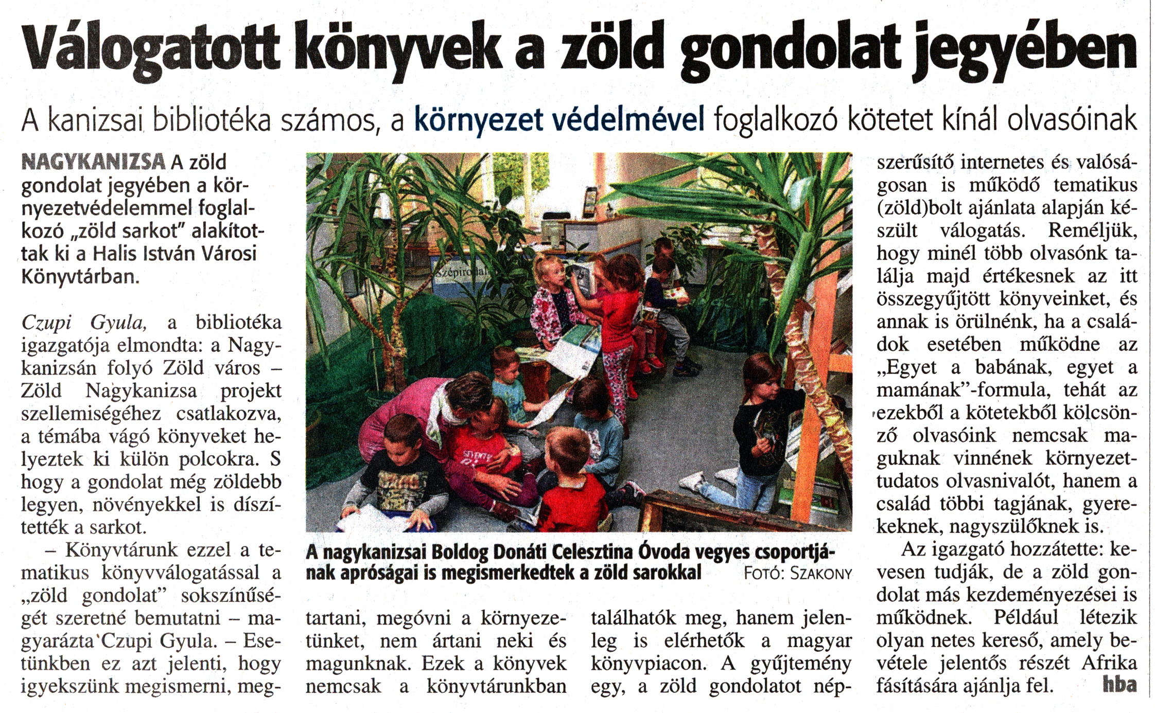 Nyilvános 1747 | 3196 | Zalai Hírlap 2017. szeptember 30. 229. szám 4. oldal | Válogatott könyvek a zöld gondolat jegyében A kanizsai bibliotéka számos, a környezet védelmével foglalkozó kötetet kínál olvasóinak NAGYKANIZSA A zöld gondolat jegyében a környezetvédelemmel foglalkozó „zöld sarkot" alakítottak ki a Halis István Városi Könyvtárban. Czupi Gyula, a bibliotéka igazgatója elmondta: a Nagykanizsán folyó Zöld város -Zöld Nagykanizsa projekt szellemiségéhez csatlakozva, a témába vágó könyveket helyeztek ki külön polcokra. S hogy a gondolat még zöldebb legyen, növényekkel is díszítették a sarkot. - Könyvtárunk ezzel a tematikus könyvválogatással a „zöld gondolat" sokszínűségét szeretné bemutatni - magyarázta Czupi Gyula. - Esetünkben ez azt jelenti, hogy igyekszünk megismerni, megtartani, megóvni a környezetünket, nem ártani neki és magunknak. Ezek a könyvek nemcsak a könyvtárunkban találhatók meg, hanem jelenleg is elérhetők a magyar könyvpiacon. A gyűjtemény egy, a zöld gondolatot népszerűsítő internetes és valóságosan is működő tematikus (zöld)bolt ajánlata alapján készült válogatás. Reméljük, hogy minél több olvasónk találja majd értékesnek az itt összegyűjtött könyveinket, és annak is örülnénk, ha a családok esetében működne az „Egyet a babának, egyet a mamának”-formula, tehát az ezekből a kötetekből kölcsönző olvasóink nemcsak maguknak vinnének környezettudatos olvasnivalót, hanem a család többi tagjának, gyerekeknek, nagyszülőknek is. Az igazgató hozzátette: kevesen tudják, de a zöld gondolat más kezdeményezései is működnek. Például létezik olyan netes kereső, amely bevétele jelentős részét Afrika fásítására ajánlja fel. hba A nagykanizsai Boldog Donáti Celesztina Óvoda vegyes csoportjának apróságai is megismerkedtek a zöld sarokkal Fotó: Szakony |