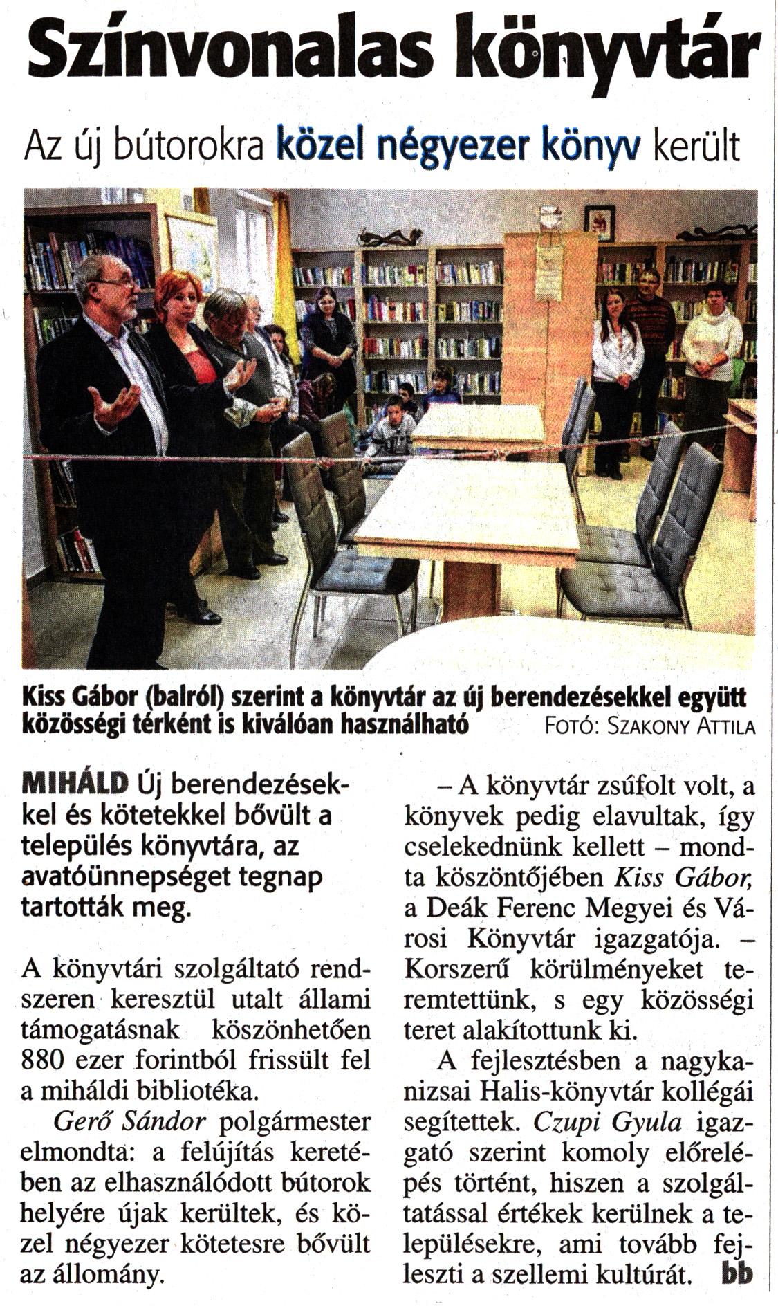 Nyilvános 1693 | 3075 | Zalai Hírlap 2017. november 15. 266. szám 4. oldal | Színvonalas könyvtár Az új bútorokra közel négyezer könyv került Kiss Gábor (balról) szerint a könyvtár az új berendezésekkel együtt közösségi térként is kiválóan használható Fotó: Szakony Attila MIHÁLD Új berendezésekkel és kötetekkel bővült a település könyvtára, az avatóünnepséget tegnap tartották meg. A könyvtári szolgáltató rendszeren keresztül utalt állami támogatásnak köszönhetően 880 ezer forintból frissült fel a miháldi bibliotéka. Gerő Sándor polgármester elmondta: a felújítás keretében az elhasználódott bútorok helyére újak kerültek, és közel négyezer kötetesre bővült az állomány. - A könyvtár zsúfolt volt, a könyvek pedig elavultak, így cselekednünk kellett - mondta köszöntőjében Kiss Gábor, a Deák Ferenc Megyei és Városi Könyvtár igazgatója. -Korszerű körülményeket teremtettünk, s egy közösségi teret alakítottunk ki. A fejlesztésben a nagykanizsai Halis-könyvtár kollégái segítettek. Czupi Gyula igazgató szerint komoly előrelépés történt, hiszen a szolgáltatással értékek kerülnek a településekre, ami tovább fejleszti a szellemi kultúrát, bb |