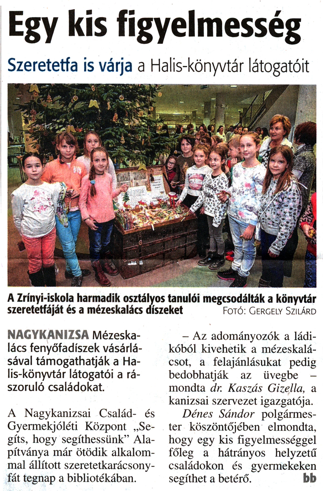 Nyilvános 1691 | 3071 | Zalai Hírlap 2017. december 5. 283. szám 16. oldal | Egy kis figyelmesség Szeretetfa is várja a Halis-könyvtár látogatóit A Zrínyi-iskola harmadik osztályos tanulói megcsodálták a könyvtár szeretetfáját és a mézeskalács díszeket Fotó: Gergely Szilárd NAGYKANIZSA Mézeskalács fenyőfadíszek vásárlásával támogathatják a Halis-könyvtár látogatói a rászoruló családokat. A Nagykanizsai Család- és Gyermekjóléti Központ „Segíts, hogy segíthessünk" Alapítványa már ötödik alkalommal állított szeretetkarácsonyfát tegnap a bibliotékában. - Az adományozók a ládikóból kivehetik a mézeskalácsot, a felajánlásukat pedig bedobhatják az üvegbe -mondta dr. Kaszás Gizella, a kanizsai szervezet igazgatója. Dénes Sándor polgármester köszöntőjében elmondta, hogy egy kis figyelmességgel főleg a hátrányos helyzetű családokon és gyermekeken segíthet a betérő. bb |