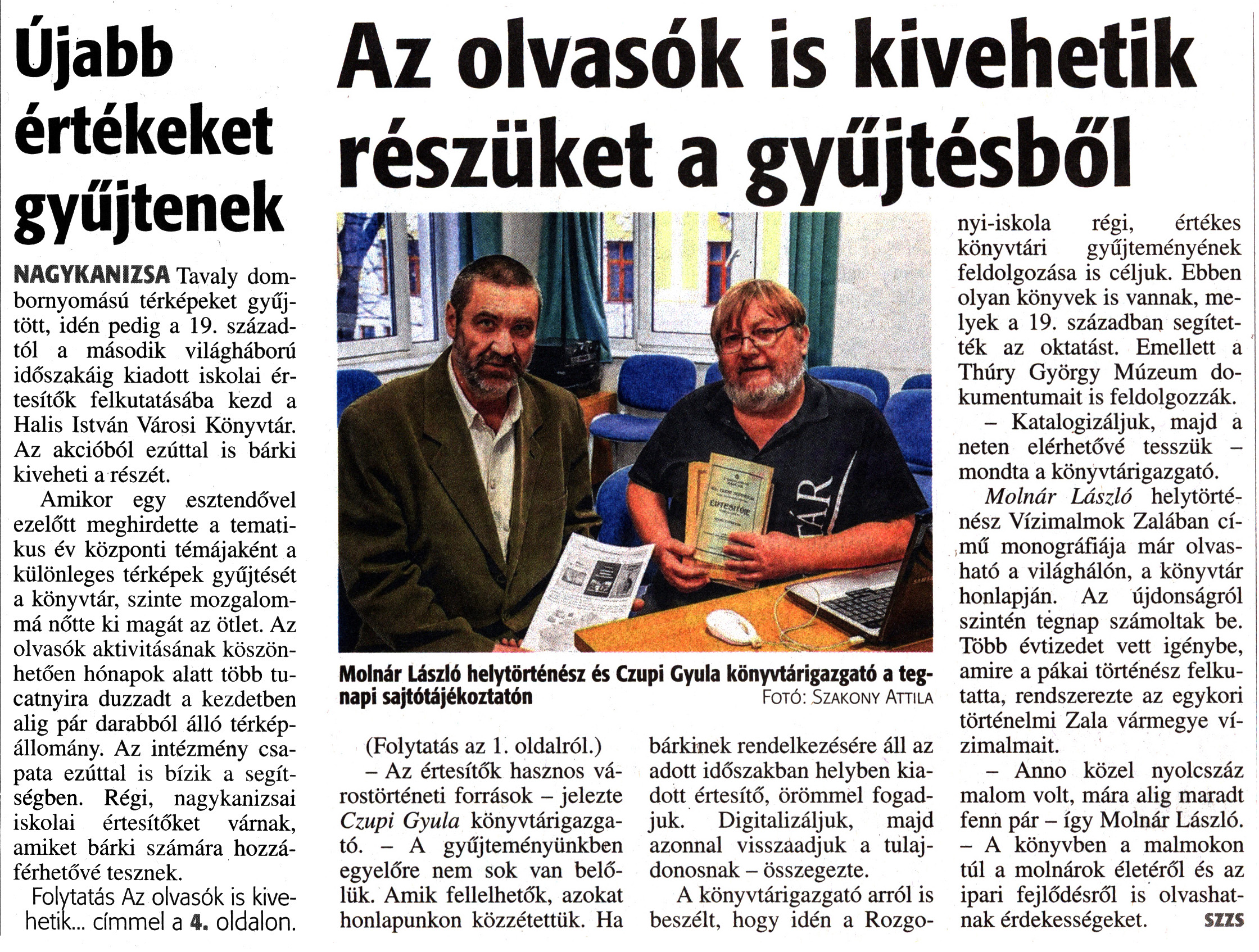 Nyilvános 1858 | 3123 | Zalai Hírlap 2018. január 3. 2. szám 1, 4. oldal | Újabb értékeket gyűjtenek NAGYKANIZSA Tavaly dombornyomású térképeket gyűjtött, idén pedig a 19. századtól a második világháború időszakáig kiadott iskolai értesítők felkutatásába kezd a Halis István Városi Könyvtár. Az akcióból ezúttal is bárki kiveheti a részét. Amikor egy esztendővel ezelőtt meghirdette a tematikus év központi témájaként a különleges térképek gyűjtését a könyvtár, szinte mozgalommá nőtte ki magát az ötlet. Az olvasók aktivitásának köszönhetően hónapok alatt több tucatnyira duzzadt a kezdetben alig pár darabból álló térképállomány. Az intézmény csapata ezúttal is bízik a segítségben. Régi, nagykanizsai iskolai értesítőket várnak, amiket bárki számára hozzáférhetővé tesznek. Folytatás Az olvasók is kivehetik... címmel a 4. oldalon. Az olvasók is kivehetik részüket a gyűjtésből Molnár László helytörténész és Czupi Gyula könyvtárigazgató a tegnapi sajtótájékoztatón Fotó: Szakony Attila (Folytatás az 1. oldalról.) - Az értesítők hasznos várostörténeti források - jelezte Czupi Gyula könyvtárigazgató. - A gyűjteményünkben egyelőre nem sok van belőlük. Amik fellelhetők, azokat honlapunkon közzétettük. Ha bárkinek rendelkezésére áll az adott időszakban helyben kiadott értesítő, örömmel fogadjuk. Digitalizáljuk, majd azonnal visszaadjuk a tulajdonosnak - összegezte. A könyvtárigazgató arról is beszélt, hogy idén a Rozgonyi-iskola régi, értékes könyvtári gyűjteményének feldolgozása is céljuk. Ebben olyan könyvek is vannak, melyek a 19. században segítették az oktatást. Emellett a Thúry György Múzeum dokumentumait is feldolgozzák. - Katalogizáljuk, majd a neten elérhetővé tesszük - mondta a könyvtárigazgató. Molnár László helytörténész Vízimalmok Zalában című monográfiája már olvasható a világhálón, a könyvtár honlapján. Az újdonságról szintén tegnap számoltak be. Több évtizedet vett igénybe, amire a pákai történész felkutatta, rendszerezte az egykori történelmi Zala vármegye vízimalmait. - Anno közel nyolcszáz malom volt, mára alig maradt fenn pár - így Molnár László. - A könyvben a malmokon túl a molnárok életéről és az ipari fejlődésről is olvashatnak érdekességeket. SZZS |