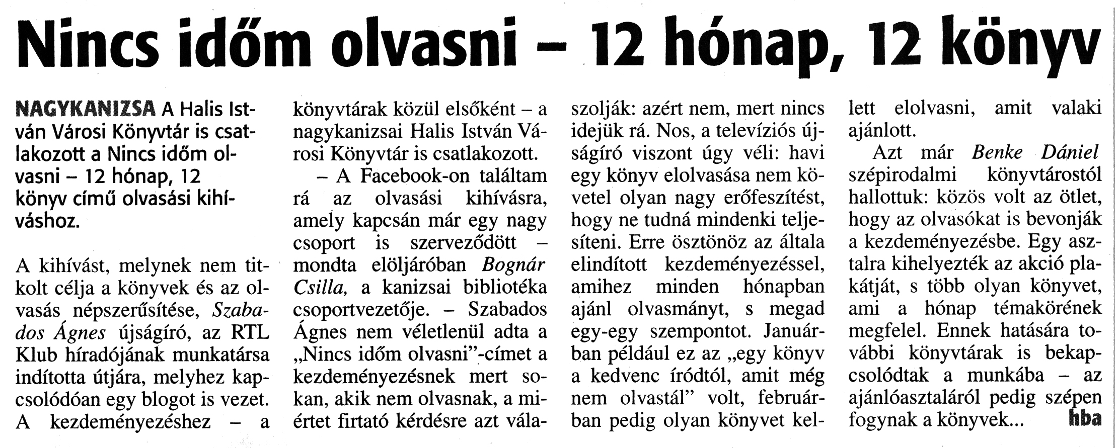 Nyilvános 1737 | 3117 | Zalai Hírlap 2018. március 6. 55. szám 13. oldal | Nincs időm olvasni - 12 hónap, 12 könyv NAGYKANIZSA A Halis István Városi Könyvtár is csatlakozott a Nincs időm olvasni - 12 hónap, 12 könyv című olvasási kihíváshoz. A kihívást, melynek nem titkolt célja a könyvek és az olvasás népszerűsítése, Szabados Ágnes újságíró, az RTL Klub híradójának munkatársa indította útjára, melyhez kapcsolódóan egy blogot is vezet. A kezdeményezéshez - a könyvtárak közül elsőként - a nagykanizsai Halis István Városi Könyvtár is csatlakozott. - A Facebook-on találtam rá az olvasási kihívásra, amely kapcsán már egy nagy csoport is szerveződött -mondta elöljáróban Bognár Csilla, a kanizsai bibliotéka csoportvezetője. - Szabados Ágnes nem véletlenül adta a „Nincs időm olvasni"-címet a kezdeményezésnek mert sokan, akik nem olvasnak, a miértet firtató kérdésre azt válaszolják: azért nem, mert nincs idejük rá. Nos, a televíziós újságíró viszont úgy véli: havi egy könyv elolvasása nem követel olyan nagy erőfeszítést, hogy ne tudná mindenki teljesíteni. Erre ösztönöz az általa elindított kezdeményezéssel, amihez minden hónapban ajánl olvasmányt, s megad egy-egy szempontot. Januárban például ez az „egy könyv a kedvenc íródtól, amit még nem olvastál" volt, februárban pedig olyan könyvet kellett elolvasni, amit valaki ajánlott. Azt már Benke Dániel szépirodalmi könyvtárostól hallottuk: közös volt az ötlet, hogy az olvasókat is bevonják a kezdeményezésbe. Egy asztalra kihelyezték az akció plakátját, s több olyan könyvet, ami a hónap témakörének megfelel. Ennek hatására további könyvtárak is bekapcsolódtak a munkába - az ajánlóasztaláról pedig szépen fogynak a könyvek... hba |