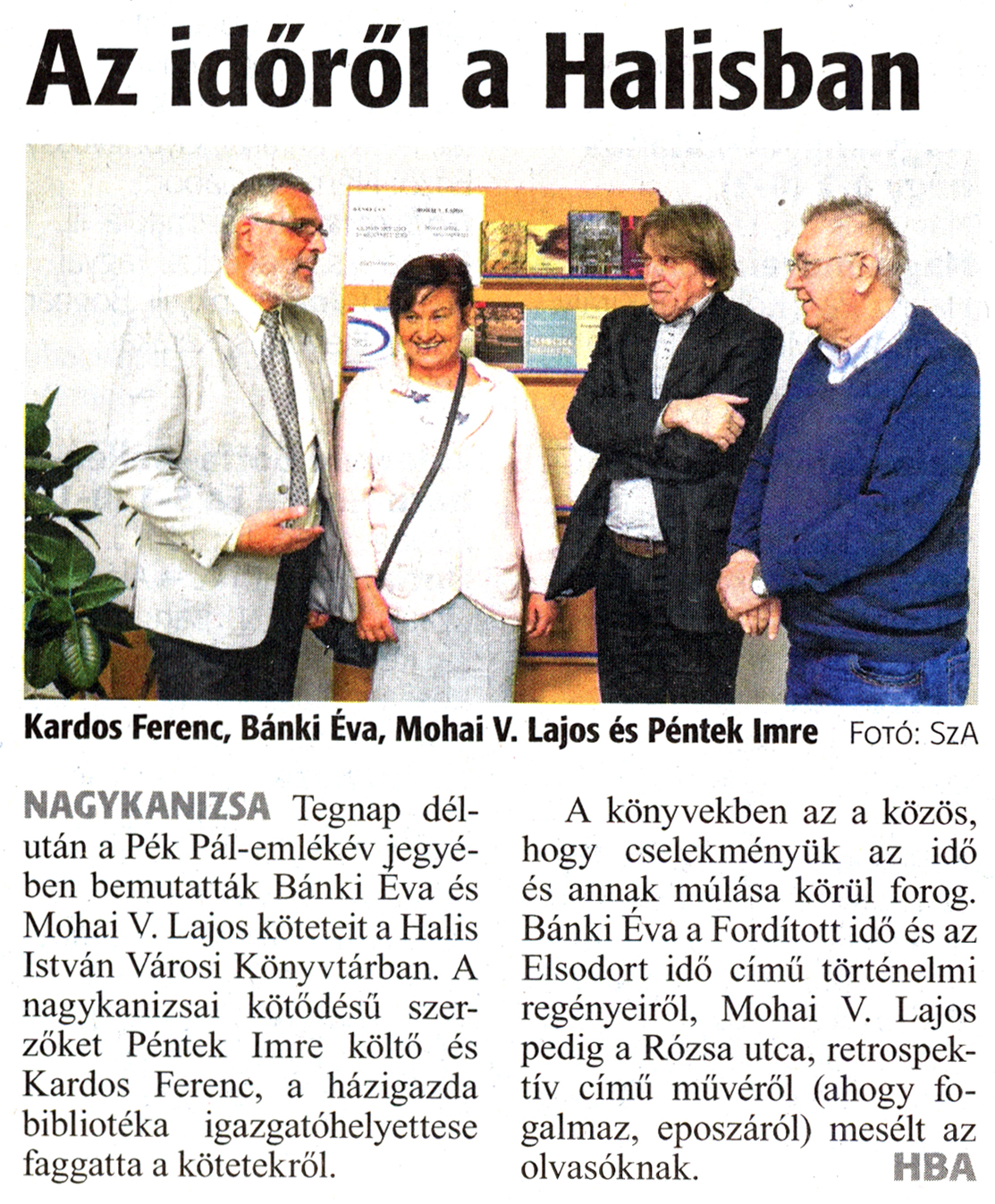 Nyilvános 1636 | 2727 | Zalai Hírlap 2018. november 7. 258. szám 16. oldal | Az időről a Halisban Kardos Ferenc, Bánki Éva, Mohai V. Lajos és Péntek Imre Fotó: SzA NAGYKANIZSA Tegnap délután a Pék Pál-emlékév jegyében bemutatták Bánki Éva és Mohai V. Lajos köteteit a Halis István Városi Könyvtárban. A nagykanizsai kötődésű szerzőket Péntek Imre költő és Kardos Ferenc, a házigazda bibliotéka igazgatóhelyettese faggatta a kötetekről. A könyvekben az a közös, hogy cselekményük az idő és annak múlása körül forog. Bánki Éva a Fordított idő és az Elsodort idő című történelmi regényeiről, Mohai V. Lajos pedig a Rózsa utca, retrospektív című művéről (ahogy fogalmaz, eposzáról) mesélt az olvasóknak. HBA |