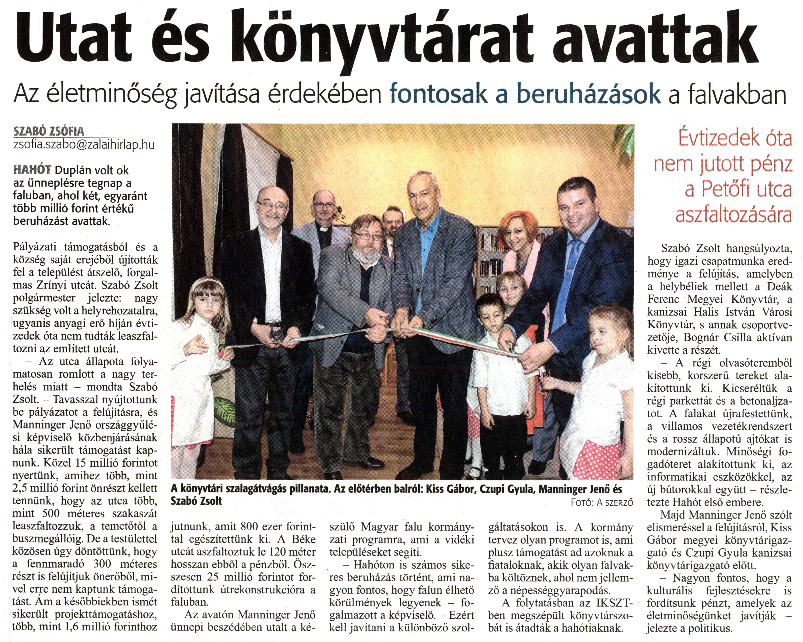 Nyilvános 1545 | 2592 | Zalai Hírlap 2018. november 24. 273. szám 3. oldal | Utat és könyvtárat avattak Az életminőség javítása érdekében fontosak a beruházások a falvakban A könyvtári szalagátvágás pillanata. Az előtérben balról: Kiss Gábor, Czupi Gyula, Manninger Jenő és Szabó Zsolt Fotó: A szerző SZABÓ ZSÓFIA_______ zsofia.szabo@zalaihirlap.hu HAHÓT Duplán volt ok az ünneplésre tegnap a faluban, ahol két, egyaránt több millió forint értékű beruházást avattak. Pályázati támogatásból és a község saját erejéből újították fel a települést átszelő, forgalmas Zrínyi utcát. Szabó Zsolt polgármester jelezte: nagy szükség volt a helyrehozatalra, ugyanis anyagi erő híján évtizedek óta nem tudták leaszfaltozni az említett utcát. - Az utca állapota folyamatosan romlott a nagy terhelés miatt - mondta Szabó Zsolt. - Tavasszal nyújtottunk be pályázatot a felújításra, és Manninger Jenő országgyűlési képviselő közbenjárásának hála sikerült támogatást kapnunk. Közel 15 millió forintot nyertünk, amihez több, mint 2,5 millió forint önrészt kellett tennünk, hogy az utca több, mint 500 méteres szakaszát leaszfaltozzuk, a temetőtől a buszmegállóig. De a testülettel közösen úgy döntöttünk, hogy a fennmaradó 300 méteres részt is felújítjuk önerőből, mivel erre nem kaptunk támogatást. Ám a későbbiekben ismét sikerült projekttámogatáshoz, több, mint 1,6 millió forinthoz jutnunk, amit 800 ezer forinttal egészítettünk ki. A Béke utcát aszfaltoztuk le 120 méter hosszan ebből a pénzből. Összesen 25 millió forintot fordítottunk útrekonstrukcióra a faluban. Az avatón Manninger Jenő ünnepi beszédében utalt a ké- szülő Magyar falu kormányzati programra, ami a vidéki településeket segíti. - Hahóton is számos sikeres beruházás történt, ami nagyon fontos, hogy falun élhető körülmények legyenek - fogalmazott a képviselő. - Ezért kell javítani a különböző szol- gáltatásokon is. A kormány tervez olyan programot is, ami plusz támogatást ad azoknak a fiataloknak, akik olyan falvakba költöznek, ahol nem jellemző a népességgyarapodás. A folytatásban az IKSZT-ben megszépült könyvtárszobát is átadták a hahótiaknak. Évtizedek óta nem jutott pénz a Petőfi utca aszfaltozására Szabó Zsolt hangsúlyozta, hogy igazi csapatmunka eredménye a felújítás, amelyben a helybéliek mellett a Deák Ferenc Megyei Könyvtár, a kanizsai Halis István Városi Könyvtár, s annak csoportvezetője, Bognár Csilla aktívan kivette a részét. - A régi olvasóteremből kisebb, korszerű tereket alakítottunk ki. Kicseréltük a régi parkettát és a betonaljzatot. A falakat újrafestettünk, a villamos vezetékrendszert és a rossz állapotú ajtókat is modernizáltuk. Minőségi fogadóteret alakítottunk ki, az informatikai eszközökkel, az új bútorokkal együtt - részletezte Hahót első embere. Majd Manninger Jenő szólt elismeréssel a felújításról, Kiss Gábor megyei könyvtárigazgató és Czupi Gyula kanizsai könyvtárigazgató előtt. - Nagyon fontos, hogy a kulturális fejlesztésekre is fordítsunk pénzt, amelyek az életminőségünket javítják - jelezte a politikus. |