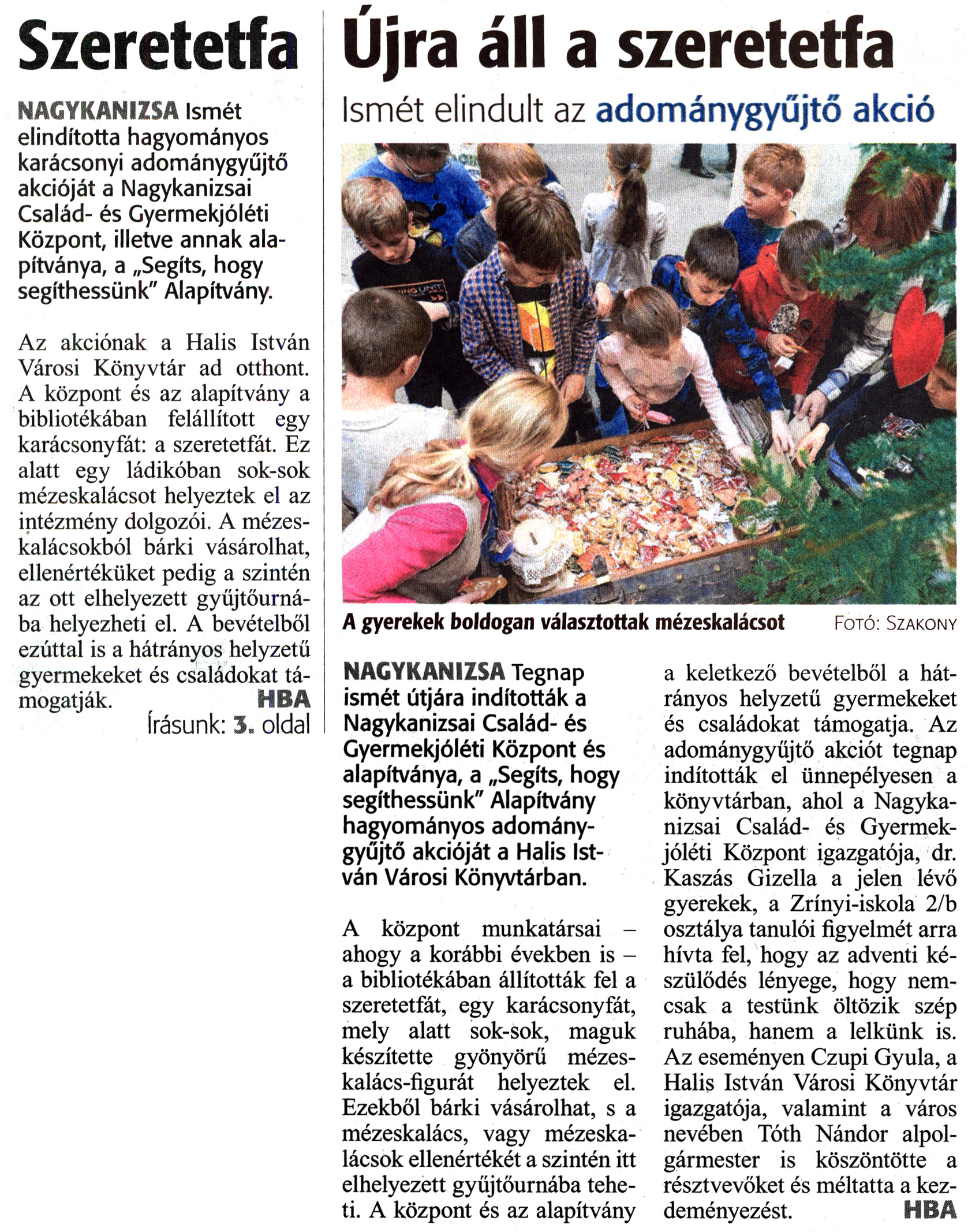 Nyilvános 1551 | 2685 | Zalai Hírlap 2018. december 4. 281. szám 1, 3. oldal | Szeretetfa Újra áll a szeretetfa Ismét elindult az adománygyűjtő akció A gyerekek boldogan választottak mézeskalácsot Fotó: Szakony NAGYKANIZSA Ismét elindította hagyományos karácsonyi adománygyűjtő akcióját a Nagykanizsai Család- és Gyermekjóléti Központ, illetve annak alapítványa, a „Segíts, hogy segíthessünk" Alapítvány. Az akciónak a Halis István Városi Könyvtár ad otthont. A központ és az alapítvány a bibliotékában felállított egy karácsonyfát: a szeretetfát. Ez alatt egy ládikóban sok-sok mézeskalácsot helyeztek el az intézmény dolgozói. A mézeskalácsokból bárki vásárolhat, ellenértéküket pedig a szintén az ott elhelyezett gyűjtőurná-ba helyezheti el. A bevételből ezúttal is a hátrányos helyzetű gyermekeket és családokat támogatják. HBA írásunk: 3. oldal NAGYKANIZSA Tegnap ismét útjára indították a Nagykanizsai Család- és Gyermekjóléti Központ és alapítványa, a „Segíts, hogy segíthessünk" Alapítvány hagyományos adománygyűjtő akcióját a Halis István Városi Könyvtárban. A központ munkatársai -ahogy a korábbi években is -a bibliotékában állították fel a szeretetfát, egy karácsonyfát, mely alatt sok-sok, maguk készítette gyönyörű mézeskalács-figurát helyeztek el. Ezekből bárki vásárolhat, s a mézeskalács, vagy mézeskalácsok ellenértékét a szintén itt elhelyezett gyűjtőurnába teheti. A központ és az alapítvány a keletkező bevételből a hátrányos helyzetű gyermekeket és családokat támogatja. Az adománygyűjtő akciót tegnap indították el ünnepélyesen a könyvtárban, ahol a Nagykanizsai Család- és Gyermekjóléti Központ igazgatója, dr. Kaszás Gizella a jelen lévő gyerekek, a Zrínyi-iskola 2/b osztálya tanulói figyelmét arra hívta fel, hogy az adventi készülődés lényege, hogy nemcsak a testünk öltözik szép ruhába, hanem a lelkünk is. Az eseményen Czupi Gyula, a Halis István Városi Könyvtár igazgatója, valamint a város nevében Tóth Nándor alpolgármester is köszöntötte a résztvevőket és méltatta a kezdeményezést. HBA |