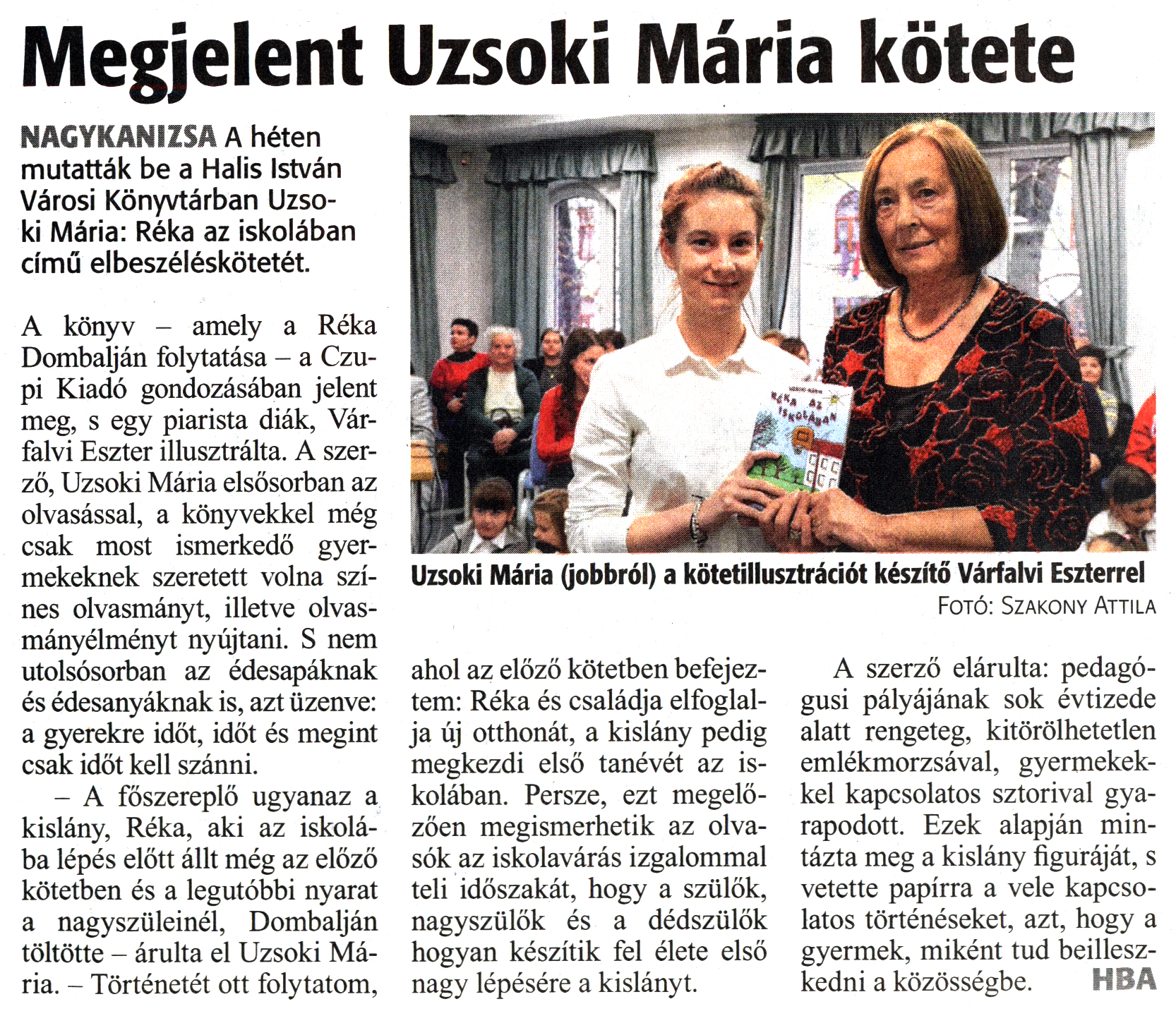 Nyilvános 1579 | 2768 | Zalai Hírlap 2018. december 20. 295. szám 6. oldal | Megjelent Uzsoki Mária kötete NAGYKANIZSA A héten mutatták be a Halis István Városi Könyvtárban Uzsoki Mária: Réka az iskolában című elbeszéléskötetét. A könyv - amely a Réka Dombalján folytatása - a Czupi Kiadó gondozásában jelent meg, s egy piarista diák, Várfalvi Eszter illusztrálta. A szerző, Uzsoki Mária elsősorban az olvasással, a könyvekkel még csak most ismerkedő gyermekeknek szeretett volna színes olvasmányt, illetve olvasmányélményt nyújtani. S nem utolsósorban az édesapáknak és édesanyáknak is, azt üzenve: a gyerekre időt, időt és megint csak időt kell szánni. - A főszereplő ugyanaz a kislány, Réka, aki az iskolába lépés előtt állt még az előző kötetben és a legutóbbi nyarat a nagyszüleinél, Dombalján töltötte - árulta el Uzsoki Mária. - Történetét ott folytatom, ahol az előző kötetben befejeztem: Réka és családja elfoglalja új otthonát, a kislány pedig megkezdi első tanévét az iskolában. Persze, ezt megelőzően megismerhetik az olvasók az iskolavárás izgalommal teli időszakát, hogy a szülők, nagyszülők és a dédszülők hogyan készítik fel élete első nagy lépésére a kislányt. A szerző elárulta: pedagógusi pályájának sok évtizede alatt rengeteg, kitörölhetetlen emlékmorzsával, gyermekekkel kapcsolatos sztorival gyarapodott. Ezek alapján mintázta meg a kislány figuráját, s vetette papírra a vele kapcsolatos történéseket, azt, hogy a gyermek, miként tud beilleszkedni a közösségbe. HBA Uzsoki Mária (jobbról) a kötetillusztrációt készítő Várfalvi Eszterrel Fotó: Szakony Attila |