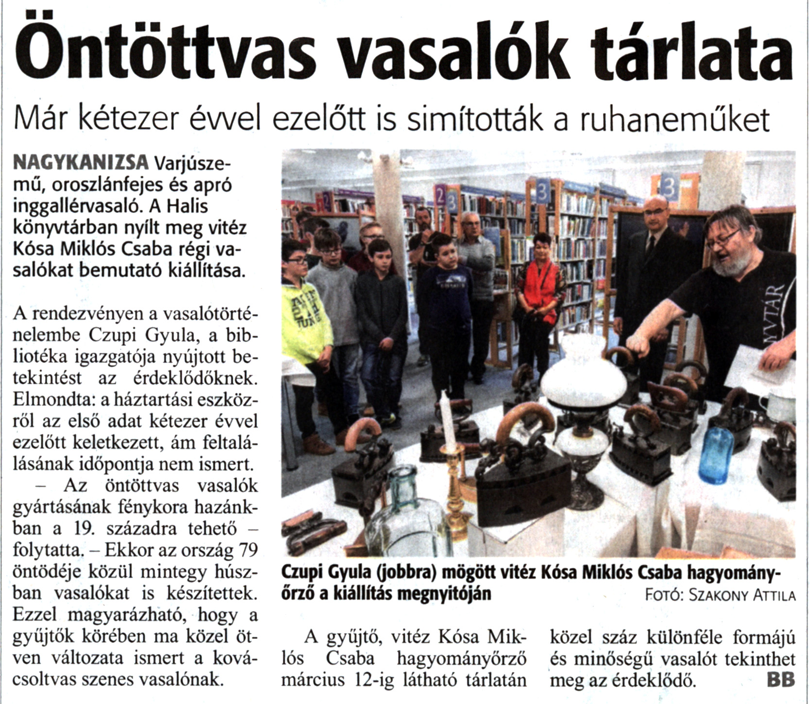 Nyilvános 1773 | 2886 | Zalai Hírlap 2019. február 14. 38. szám 16. oldal | Öntöttvas vasalók tárlata Már kétezer évvel ezelőtt is simították a ruhaneműket NAGYKANIZSA Varjúszemű, oroszlánfejes és apró inggallérvasaló. A Halis könyvtárban nyílt meg vitéz Kósa Miklós Csaba régi vasalókat bemutató kiállítása. A rendezvényen a vasalótörténelembe Czupi Gyula, a bibliotéka igazgatója nyújtott betekintést az érdeklődőknek. Elmondta: a háztartási eszközről az első adat kétezer évvel ezelőtt keletkezett, ám feltalálásának időpontja nem ismert. - Az öntöttvas vasalók gyártásának fénykora hazánkban a 19. századra tehető -folytatta. - Ekkor az ország 79 öntödéje közül mintegy húszban vasalókat is készítettek. Ezzel magyarázható, hogy a gyűjtők körében ma közel ötven változata ismert a kovácsoltvas szenes vasalónak. A gyűjtő, vitéz Kósa Miklós Csaba hagyományőrző március 12-ig látható tárlatán közel száz különféle formájú és minőségű vasalót tekinthet meg az érdeklődő. BB Czupi Gyula (jobbra) mögött vitéz Kósa Miklós Csaba hagyományőrző a kiállítás megnyitóján Fotó: Szakony Attila |