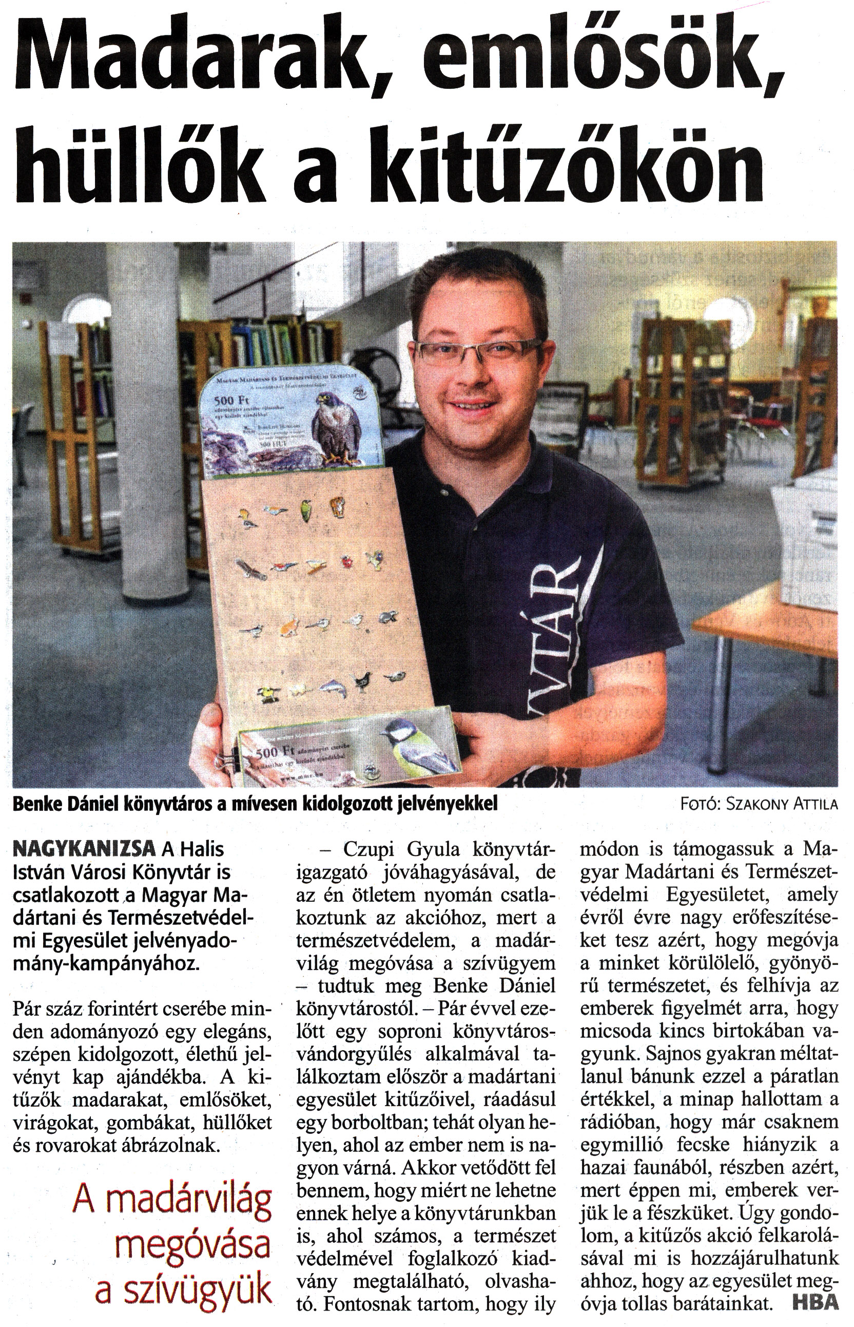 Nyilvános 1571 | 2730 | Zalai Hírlap 2019. március 18. 64. szám 6. oldal | Madarak, emlősök, hüllők a kitűzőkön Benke Dániel könyvtáros a mívesen kidolgozott jelvényekkel Fotó: Szakony Attila NAGYKANIZSA A Halis István Városi Könyvtár is csatlakozott a Magyar Madártani és Természetvédelmi Egyesület jelvényadomány-kampányához. Pár száz forintért cserébe minden adományozó egy elegáns, szépen kidolgozott, élethű jelvényt kap ajándékba. A kitűzők madarakat, emlősöket, virágokat, gombákat, hüllőket és rovarokat ábrázolnak. A madárvilág megóvása a szívügyük - Czupi Gyula könyvtárigazgató jóváhagyásával, de az én ötletem nyomán csatlakoztunk az akcióhoz, mert a természetvédelem, a madárvilág megóvása a szívügyem - tudtuk meg Benke Dániel könyvtárostól. - Pár évvel ezelőtt egy soproni könyvtárosvándorgyűlés alkalmával találkoztam először a madártani egyesület kitűzőivel, ráadásul egy borboltban; tehát olyan helyen, ahol az ember nem is nagyon várná. Akkor vetődött fel bennem, hogy miért ne lehetne ennek helye a könyvtárunkban is, ahol számos, a természet védelmével foglalkozó kiadvány megtalálható, olvasható. Fontosnak tartom, hogy ily módon is támogassuk a Magyar Madártani és Természetvédelmi Egyesületet, amely évről évre nagy erőfeszítéseket tesz azért, hogy megóvja a minket körülölelő, gyönyörű természetet, és felhívja az emberek figyelmét arra, hogy micsoda kincs birtokában vagyunk. Sajnos gyakran méltatlanul bánunk ezzel a páratlan értékkel, a minap hallottam a rádióban, hogy már csaknem egymillió fecske hiányzik a hazai faunából, részben azért, mert éppen mi, emberek verjük le a fészküket. Úgy gondolom, a kitűzős akció felkarolásával mi is hozzájárulhatunk ahhoz, hogy az egyesület megóvja tollas barátainkat. HBA |