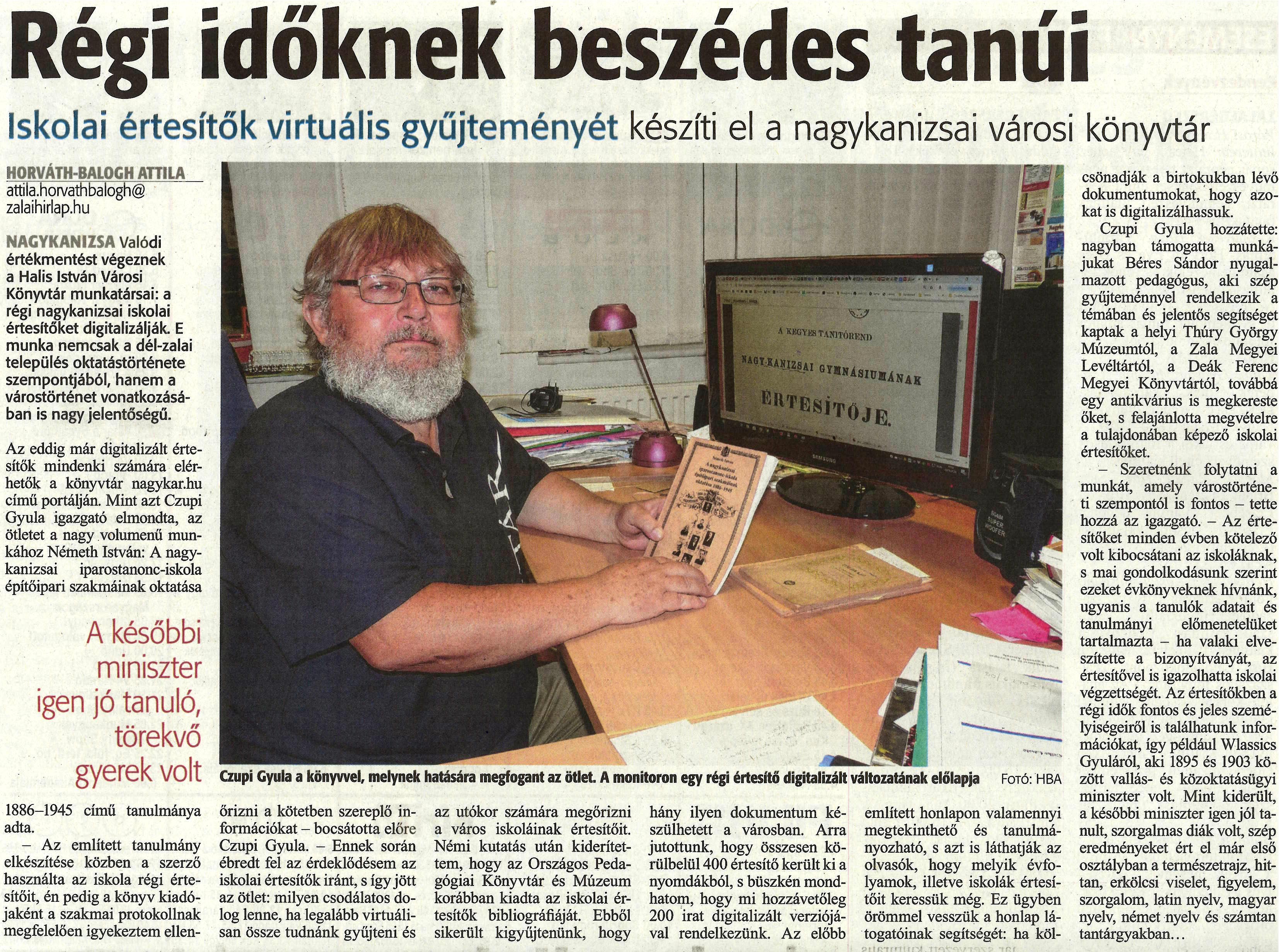 Nyilvános 1327 | 2342 | Régi időknek beszédes tanúi | Iskolai értesítők virtuális gyűjteményét készíti el a nagykanizsai városi könyvtár HORVÁTH-BALOGH ATTILA attila.horvathbalogh@zalaihirlap.hu NAGYKANIZSA Valódi értékmentést végeznek a Halis István Városi Könyvtár munkatársai: a régi nagykanizsai iskolai értesítőket digitalizálják. E munka nemcsak a dél-zalai település oktatástörténete szempontjából, hanem a várostörténet vonatkozásában is nagy jelentőségű. Az eddig már digitalizált értesítők mindenki számára elérhetők a könyvtár nagykar.hu című portálján. Mint azt Czupi Gyula igazgató elmondta, az ötletet a nagy volumenű munkához Németh István: A nagykanizsai iparostanonc-iskola építőipari szakmáinak oktatása - A későbbi miniszter igen jó tanuló, törekvő gyerek volt - 1886-1945 című tanulmánya adta. -Az említett tanulmány elkészítése közben a szerző használta az iskola régi értesítőit, én pedig a könyv kiadójaként a szakmai protokollnak megfelelően igyekeztem ellenőrizni a kötetben szereplő információkat - bocsátotta előre Czupi Gyula. - Ennek során ébredt fel az érdeklődésem az iskolai értesítők iránt, s így jött az ötlet: milyen csodálatos dolog lenne, ha legalább virtuálisan össze tudnánk gyűjteni és az utókor számára megőrizni a város iskoláinak értesítőit. Némi kutatás után kiderítettem, hogy az Országos Pedagógiai Könyvtár és Múzeum korábban kiadta az iskolai értesítők bibliográfiáját. Ebből sikerült kigyűjtenünk, hogy hány ilyen dokumentum készülhetett a városban. Arra jutottunk, hogy összesen körülbelül 400 értesítő került ki a nyomdákból, s büszkén mondhatom, hogy mi hozzávetőleg 200 irat digitalizált verziójával rendelkezünk. Az előbb említett honlapon valamennyi megtekinthető és tanulmányozható, s azt is láthatják az olvasók, hogy melyik évfolyamok, illetve iskolák értesítőit keressük még. Ez ügyben örömmel vesszük a honlap látogatóinak segítségét: ha kölcsönadják a birtokukban lévő dokumentumokat, hogy azokat is digitalizálhassuk. Czupi Gyula hozzátette: nagyban támogatta munkájukat Béres Sándor nyugalmazott pedagógus, aki szép gyűjteménnyel rendelkezik a témában és jelentős segítséget kaptak a helyi Thúry György Múzeumtól, a Zala Megyei Levéltártól, a Deák Ferenc Megyei Könyvtártól, továbbá egy antikvárius is megkereste őket, s felajánlotta megvételre a tulajdonában képező iskolai értesítőket. - Szeretnénk folytatni a munkát, amely várostörténeti szempontéi is fontos - tette hozzá az igazgató. - Az értesítőket minden évben kötelező volt kibocsátani az iskoláknak, s mai gondolkodásunk szerint ezeket évkönyveknek hívnánk, ugyanis a tanulók adatait és tanulmányi előmenetelüket tartalmazta - ha valaki elveszítette a bizonyítványát, az értesítővel is igazolhatta iskolai végzettségét. Az értesítőkben a régi idők fontos és jeles személyiségeiről is találhatunk információkat, így például Wlassics Gyuláról, aki 1895 és 1903 között vallás- és közoktatásügyi miniszter volt. Mint kiderült, a későbbi miniszter igen jól tanult, szorgalmas diák volt, szép eredményeket ért el már első osztályban a természetrajz, hittan, erkölcsi viselet, figyelem, szorgalom, latin nyelv, magyar nyelv, német nyelv és számtan tantárgyakban... Czupi Gyula a könyvvel, melynek hatására megfogant az ötlet. A monitoron egy régi értesítő digitalizált változatának előlapja Fotó: HBA |