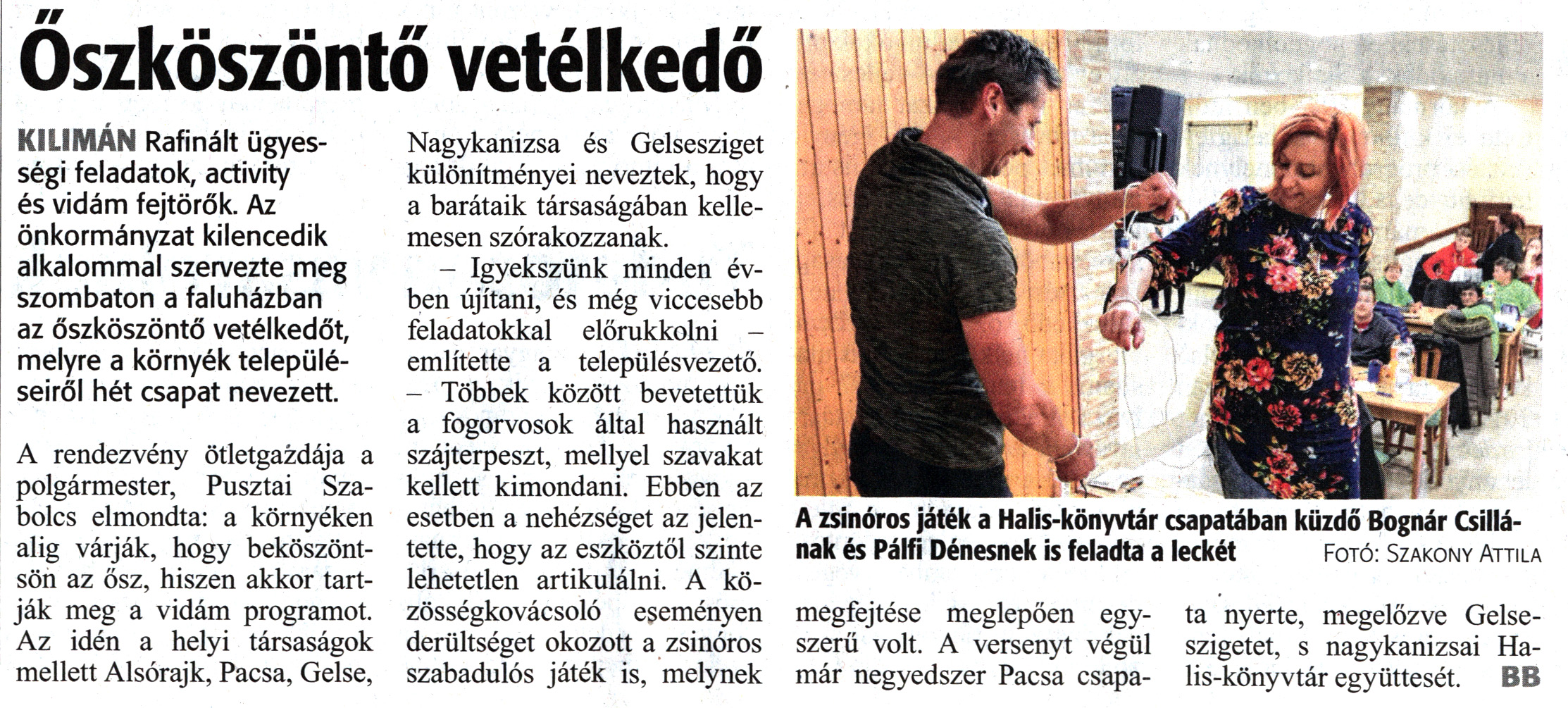 Nyilvános 1492 | 2516 | Zalai Hírlap 2019. november 18. 267. szám 6. oldal | Őszköszöntő vetélkedő KILIMÁN Rafinált ügyességi feladatok, activity és vidám fejtörők. Az önkormányzat kilencedik alkalommal szervezte meg szombaton a faluházban az őszköszöntő vetélkedőt, melyre a környék településeiről hét csapat nevezett. A rendezvény ötletgazdája a polgármester, Pusztai Szabolcs elmondta: a környéken alig várják, hogy beköszöntsön az ősz, hiszen akkor tartják meg a vidám programot. Az idén a helyi társaságok mellett Alsórajk, Pacsa, Gelse, Nagykanizsa és Gelsesziget különítményei neveztek, hogy a barátaik társaságában kellemesen szórakozzanak. - Igyekszünk minden évben újítani, és még viccesebb feladatokkal előrukkolni -említette a településvezető. - Többek között bevetettük a fogorvosok által használt szájterpeszt, mellyel szavakat kellett kimondani. Ebben az esetben a nehézséget az jelentette, hogy az eszköztől szinte lehetetlen artikulálni. A közösségkovácsoló eseményen derültséget okozott a zsinóros szabadulós játék is, melynek megfejtése meglepően egyszerű volt. A versenyt végül már negyedszer Pacsa csapata nyerte, megelőzve Gelseszigetet, s nagykanizsai Halis-könyvtár együttesét. BB A zsinóros játék a Halis-könyvtár csapatában küzdő Bognár Csillának és Pálfi Dénesnek is feladta a leckét Fotó: Szakony Attila |