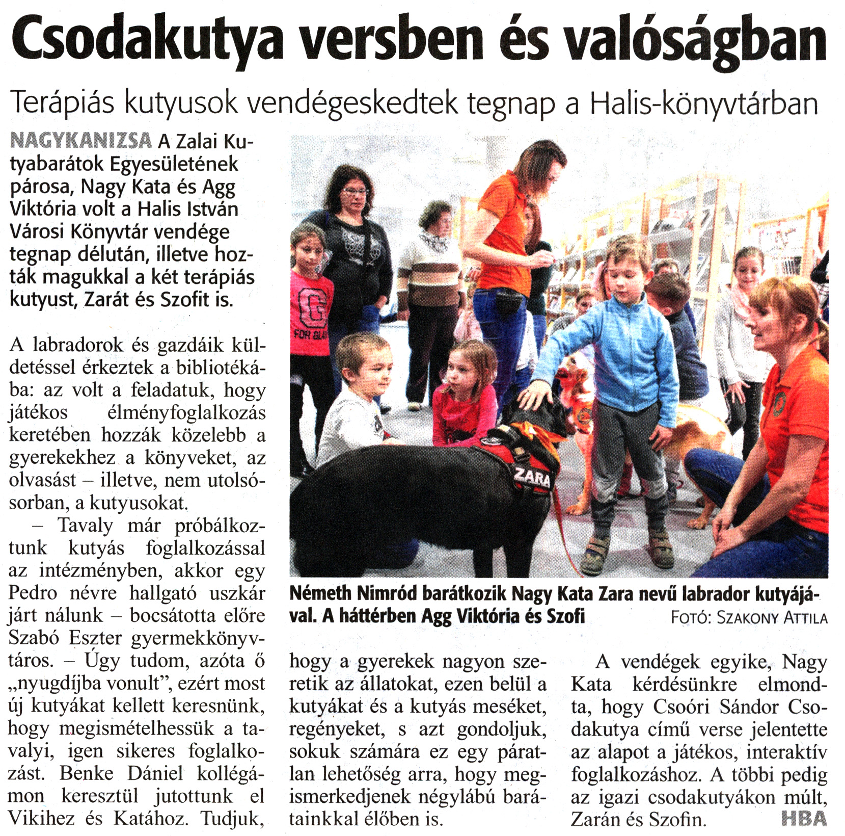Nyilvános 1394 | 2087 | Zalai Hírlap 2020. február 29. 51. szám 3. oldal | Csodakutya versben és valóságban Terápiás kutyusok vendégeskedtek tegnap a Halis-könyvtárban Németh Nimród barátkozik Nagy Kata Zara nevű labrador kutyájával. A háttérben Agg Viktória és Szofi Fotó: Szakony Attila NAGYKANIZSA A Zalai Kutyabarátok Egyesületének párosa, Nagy Kata és Agg Viktória volt a Halis István Városi Könyvtár vendége tegnap délután, illetve hozták magukkal a két terápiás kutyust, Zarát és Szofit is. A labradorok és gazdáik küldetéssel érkeztek a bibliotékába: az volt a feladatuk, hogy játékos élményfoglalkozás keretében hozzák közelebb a gyerekekhez a könyveket, az olvasást - illetve, nem utolsósorban, a kutyusokat. - Tavaly már próbálkoztunk kutyás foglalkozással az intézményben, akkor egy Pedro névre hallgató uszkár járt nálunk - bocsátotta előre Szabó Eszter gyermekkönyvtáros. - Úgy tudom, azóta ő „nyugdíjba vonult", ezért most új kutyákat kellett keresnünk, hogy megismételhessük a tavalyi, igen sikeres foglalkozást. Benke Dániel kollégámon keresztül jutottunk el Vikihez és Katához. Tudjuk, hogy a gyerekek nagyon szeretik az állatokat, ezen belül a kutyákat és a kutyás meséket, regényeket, s azt gondoljuk, sokuk számára ez egy páratlan lehetőség arra, hogy megismerkedjenek négylábú barátainkkal élőben is. A vendégek egyike, Nagy Kata kérdésünkre elmondta, hogy Csoóri Sándor Csodakutya című verse jelentette az alapot a játékos, interaktív foglalkozáshoz. A többi pedig az igazi csodakutyákon múlt, Zarán és Szofin. HBA |