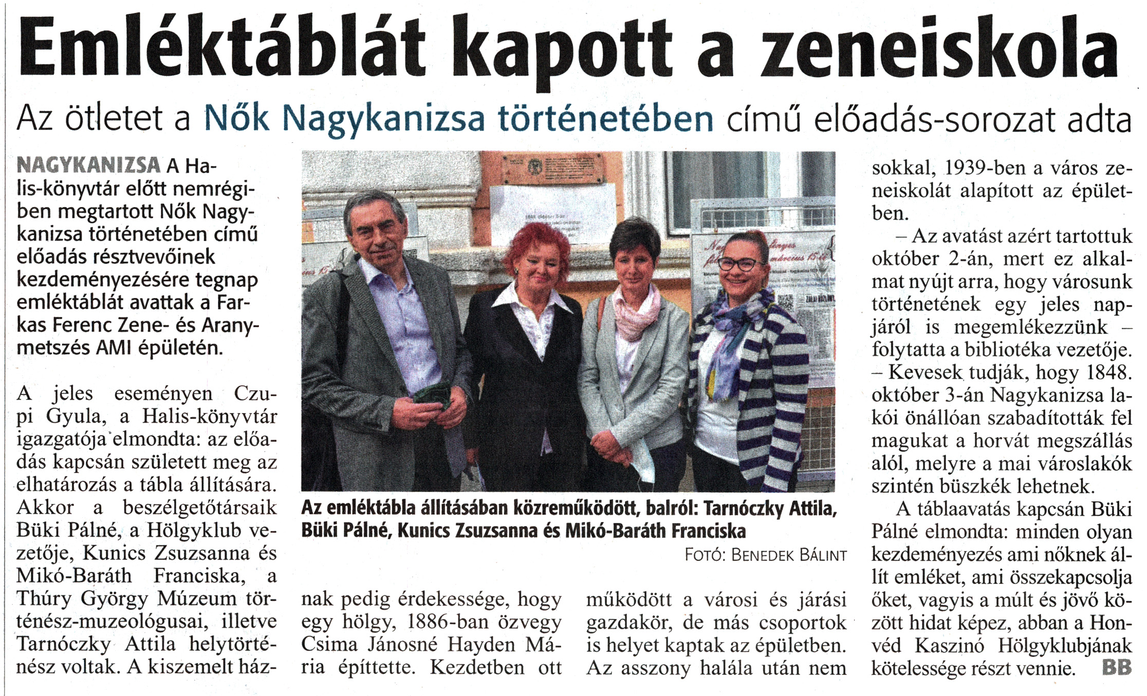 Nyilvános 1266 | 1726 | Zalai Hírlap 2020. október 3. 232. szám 4. oldal | Emléktáblát kapott a zeneiskola Az ötletet a Nők Nagykanizsa történetében című előadás-sorozat adta Az emléktábla állításában közreműködött, balról: Tarnóczky Attila, Büki Pálné, Kunics Zsuzsanna és Mikó-Baráth Franciska Fotó: Benedek Bálint NAGYKANIZSA A Halis-könyvtár előtt nemrégiben megtartott Nők Nagykanizsa történetében című előadás résztvevőinek kezdeményezésére tegnap emléktáblát avattak a Farkas Ferenc Zene- és Aranymetszés AMI épületén. A jeles eseményen Czupi Gyula, a Halis-könyvtár igazgatója elmondta: az előadás kapcsán született meg az elhatározás a tábla állítására. Akkor a beszélgetőtársaik Büki Pálné, a Hölgyklub vezetője, Kunics Zsuzsanna és Mikó-Baráth Franciska, a Thúry György Múzeum történész-muzeológusai, illetve Tarnóczky Attila helytörténész voltak. A kiszemelt háznak pedig érdekessége, hogy egy hölgy, 1886-ban özvegy Csima Jánosné Hayden Mária építtette. Kezdetben ott működött a városi és járási gazdakör, de más csoportok is helyet kaptak az épületben. Az asszony halála után nem sokkal, 1939-ben a város zeneiskolát alapított az épületben. - Az avatást azért tartottuk október 2-án, mert ez alkalmat nyújt arra, hogy városunk történetének egy jeles napjáról is megemlékezzünk -folytatta a bibliotéka vezetője. - Kevesek tudják, hogy 1848. október 3-án Nagykanizsa lakói önállóan szabadították fel magukat a horvát megszállás alól, melyre a mai városlakók szintén büszkék lehetnek. A táblaavatás kapcsán Büki Pálné elmondta: minden olyan kezdeményezés ami nőknek állít emléket, ami összekapcsolja őket, vagyis a múlt és jövő között hidat képez, abban a Honvéd Kaszinó Hölgyklubjának kötelessége részt vennie. BB |