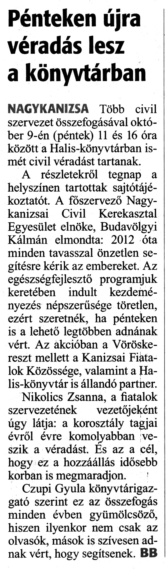 Nyilvános 1506 | 2115 | Zalai Hírlap 2020. október 6. 234. szám 3. oldal | Pénteken újra véradás lesz a könyvtárban NAGYKANIZSA Több civil szervezet összefogásával október 9-én (péntek) 11 és 16 óra között a Halis-könyvtárban ismét civil véradást tartanak. A részletekről tegnap a helyszínen tartottak sajtótájékoztatót. A főszervező Nagykanizsai Civil Kerekasztal Egyesület elnöke, Budavölgyi Kálmán elmondta: 2012 óta minden tavasszal önzetlen segítésre kérik az embereket. Az egészségfejlesztő programjuk keretében indult kezdeményezés népszerűsége töretlen, ezért szeretnék, ha pénteken is a lehető legtöbben adnának vért. Az akcióban a Vöröskereszt mellett a Kanizsai Fiatalok Közössége, valamint a Halis-könyvtár is állandó partner. Nikolics Zsanna, a fiatalok szervezetének vezetőjeként úgy látja: a korosztály tagjai évről évre komolyabban veszik a véradást. És az a cél, hogy ez a hozzáállás idősebb korban is megmaradjon. Czupi Gyula könyvtárigazgató szerint ez az összefogás minden évben gyümölcsöző, hiszen ilyenkor nem csak az olvasók, mások is szívesen adnak vért, hogy segítsenek. BB |