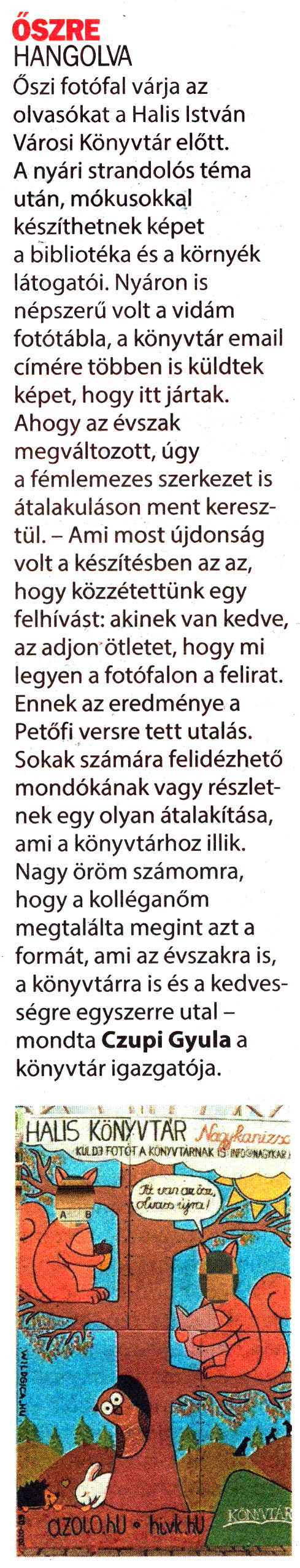 Nyilvános 1549 | 2441 | Kanizsa 2020. október 2. 35. szám 3. oldal | ŐSZRE HANGOLVA Őszi fotófal várja az olvasókat a Halis István Városi Könyvtár előtt. A nyári strandolós téma után, mókusokkal készíthetnek képet a bibliotéka és a környék látogatói. Nyáron is népszerű volt a vidám fotótábla, a könyvtár email címére többen is küldtek képet, hogy itt jártak. Ahogy az évszak megváltozott, úgy a fémlemezes szerkezet is átalakuláson ment keresztül. - Ami most újdonság volt a készítésben az az, hogy közzétettünk egy felhívást: akinek van kedve, az adjon ötletet, hogy mi legyen a fotófalon a felirat. Ennek az eredménye a Petőfi versre tett utalás. Sokak számára felidézhető mondókának vagy részletnek egy olyan átalakítása, ami a könyvtárhoz illik. Nagy öröm számomra, hogy a kolléganőm megtalálta megint azt a formát, ami az évszakra is, a könyvtárra is és a kedvességre egyszerre utal - mondta Czupi Gyula a könyvtár igazgatója. |